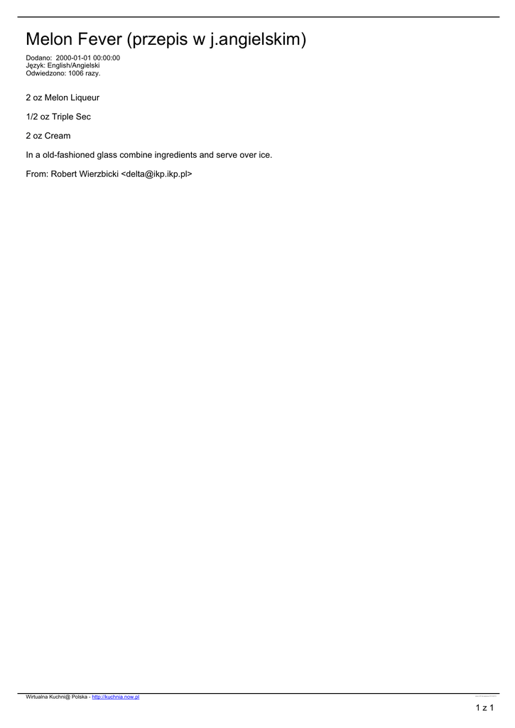 Melon Fever (przepis w j.angielskim) Dodano: 2000-01-01 00:00:00 Język: English/Angielski Odwiedzono: 1006 razy. 2 oz Melon Liqueur 1/2 oz Triple Sec 2 oz Cream In a old-fashioned glass combine ingredients and serve over ice. From: Robert Wierzbicki <[email protected]> Wirtualna Kuchni@ Polska - http://kuchnia.now.pl przepis nr 3917, plik wygenerowano 2017.03.08 02:16 1z1