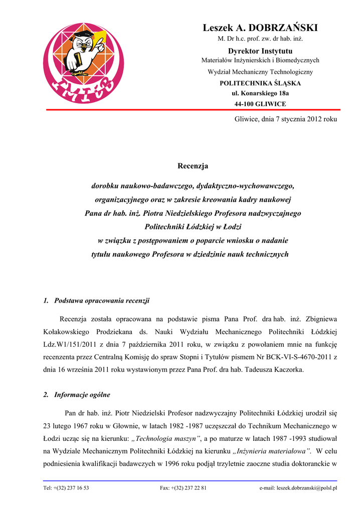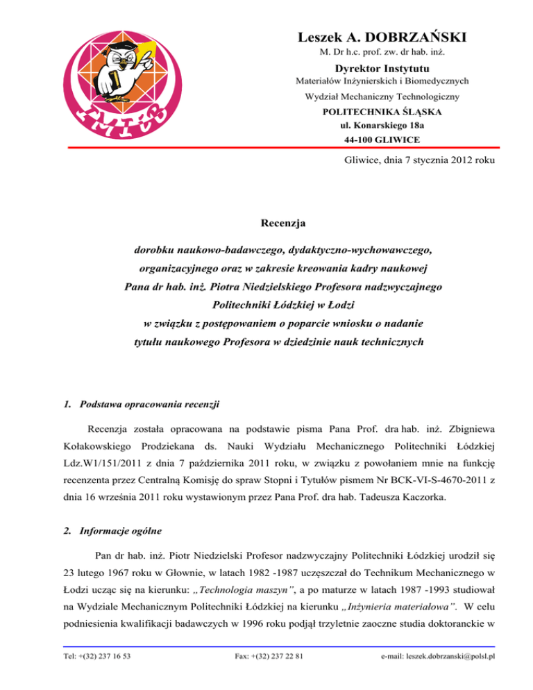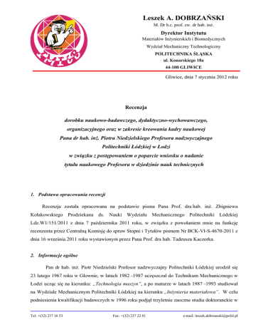 Leszek A. DOBRZAŃSKI M. Dr h.c. prof. zw. dr hab. inż. Dyrektor Instytutu Materiałów Inżynierskich i Biomedycznych Wydział Mechaniczny Technologiczny POLITECHNIKA ŚLĄSKA ul. Konarskiego 18a 44-100 GLIWICE Gliwice, dnia 7 stycznia 2012 roku Recenzja dorobku naukowo-badawczego, dydaktyczno-wychowawczego, organizacyjnego oraz w zakresie kreowania kadry naukowej Pana dr hab. inż. Piotra Niedzielskiego Profesora nadzwyczajnego Politechniki Łódzkiej w Łodzi w związku z postępowaniem o poparcie wniosku o nadanie tytułu naukowego Profesora w dziedzinie nauk technicznych 1. Podstawa opracowania recenzji Recenzja została opracowana na podstawie pisma Pana Prof. dra hab. inż. Zbigniewa Kołakowskiego Prodziekana ds. Nauki Wydziału Mechanicznego Politechniki Łódzkiej Ldz.W1/151/2011 z dnia 7 października 2011 roku, w związku z powołaniem mnie na funkcję recenzenta przez Centralną Komisję do spraw Stopni i Tytułów pismem Nr BCK-VI-S-4670-2011 z dnia 16 września 2011 roku wystawionym przez Pana Prof. dra hab. Tadeusza Kaczorka. 2. Informacje ogólne Pan dr hab. inż. Piotr Niedzielski Profesor nadzwyczajny Politechniki Łódzkiej urodził się 23 lutego 1967 roku w Głownie, w latach 1982 -1987 uczęszczał do Technikum Mechanicznego w Łodzi ucząc się na kierunku: „Technologia maszyn”, a po maturze w latach 1987 -1993 studiował na Wydziale Mechanicznym Politechniki Łódzkiej na kierunku „Inżynieria materiałowa”. W celu podniesienia kwalifikacji badawczych w 1996 roku podjął trzyletnie zaoczne studia doktoranckie w Tel: +(32) 237 16 53 Fax: +(32) 237 22 81 e-mail: [email protected] zakresie „Inżynieria materiałowa tworzyw dla medycyny i biologii” w Katowicach na Wydziale Inżynierii Materiałowej, Metalurgii i Transportu Politechniki Śląskiej, które ukończył w roku 1999. Rozprawę doktorską pod tytułem: „Wytwarzanie warstw nanokrystalicznego diamentu na potrzeby medycyny” wykonaną pod opieką promotorską Pana Prof. dra hab. Stanisława Mitury obronił w czerwcu 1998 roku przed Radą Wydziału Mechanicznego Politechniki Łódzkiej. Stopień naukowy doktora habilitowanego nauk technicznych w dyscyplinie naukowej „Inżynieria materiałowa” nadała Mu w 2006 roku Rada Wydziału Inżynierii Materiałowej Politechniki Warszawskiej, na podstawie dorobku naukowego i rozprawy habilitacyjnej Pt. „Warstwy nanokrystalicznego diamentu na narzędzia skrawające do obróbki materiałów nieżelaznych i drewnopochodnych” (wydanej jako Zeszyty Naukowe Politechniki Łódzkiej, Zeszyt 955, 117 s., Łódź 2005). Pan dr hab. inż. Piotr Niedzielski Profesor nadzwyczajny Politechniki Łódzkiej od 1993 roku niezmiennie pracuje na Politechnice Łódzkiej w Łodzi. Bezpośrednio po ukończeniu studiów podjął pracę w Instytucie Inżynierii Materiałowej na stanowisku starszego referenta technicznego, a w latach 1995-1998 pracował w tymże Instytucie na stanowisku asystenta. Po uzyskaniu stopnia doktora w latach 1998-2008 zatrudniony był w Instytucie Inżynierii Materiałowej na etacie adiunkta w Zakładzie Materiałów Cienkowarstwowych, przemianowanym w 2001 roku na Zakład Inżynierii Biomedycznej, po uzyskaniu stopnia doktora habilitowanego w 2006 roku na stanowisku adiunkta habilitowanego, by w 2008 roku uzyskać nominację na stanowisko Profesora nadzwyczajnego Politechniki Łódzkiej. Od roku 2007 jest Zastępcą Dyrektora Instytutu Inżynierii Materiałowej, a w 2009 roku objął funkcję Kierownika Zakładu Inżynierii Biomedycznej. W okresie pracy zawodowej Pan dr hab. inż. Piotr Niedzielski Profesor nadzwyczajny Politechniki Łódzkiej odbył kilka staży naukowych i zawodowych w kraju i zagranicą, podanych w poniższej tablicy: Nazwa instytucji Kraj Łączny okres ECAM Lyon Francja 10 tygodni Imperial College Londyn Anglia 4 tygodni JRC Ispra Włochy 6 tygodni Uniwersytet Techniczny, Liberec Czechy 10 tygodni Pan dr hab. inż. Piotr Niedzielski Profesor nadzwyczajny Politechniki Łódzkiej pełnił liczne funkcje organizacyjne w macierzystej Uczelni oraz w środowisku pozauczelnianym. Najważniejsze z nich podano w kolejnej tablicy: 2 Funkcje organizacyjne pełnione w Uczelni: Lata Zastępca Dyrektora Instytutu Inżynierii Materiałowej 2007- Kierownik Zakładu Inżynierii Biomedycznej 2009- Pełnomocnik Dziekana Wydziału Mechanicznego ds. transferu technologii 2008- Kierownik ds. merytorycznych w projekcie:” Podwyższenie kompetencji 2009- kadry akademickiej i umiejętności absolwentów w aspekcie nowoczesnych metod analizy, symulacji i optymalizacji w procesie projektowania i eksploatacji” w ramach Programu Operacyjnego Kapitał Ludzki /4.1.1/2008 Asystent Kierownika w projekcie: „FABRYKA INŻYNIERÓW XXI WIEKU– 2010- budowa nowoczesnego obiektu dydaktyczno –laboratoryjnego Wydziału Mechanicznego Politechniki Łódzkiej” w ramach Programu Operacyjnego Infrastruktura i Funkcje organizacyjne pełnione poza Uczelnią: Członek Rady Nadzorczej BKPPT sp. z o.o. – z ramienia PŁ 2003-2007 Przewodniczący Rady Nadzorczej BKPPT sp. z o.o. – z ramienia PŁ 2007-2008 Wiceprzewodniczący Rady Nadzorczej BKPPT sp. z o.o. – z ramienia PŁ 2008-2009 Członek Rady Nadzorczej BKPPT sp. z o.o. – z ramienia PŁ 2009- Członek Sekcji Technologii Elektronowej i Technologii Materiałów 2004-2007 Elektronicznych PAN Członek Sekcji Technologii Elektronowej i Technologii Materiałów 2007-2010 Elektronicznych PAN Członek Sekcji Biomateriałów Komitetu Nauki o Materiałach PAN 2007-2010 Przewodniczący Komisji Rewizyjnej Polskiego Stowarzyszenia 2004-2007 Biomateriałów Członek Zarządu Polskiego Stowarzyszenia Biomateriałów 2007-2010 Członek Zarządu Polskiego Stowarzyszenia Biomateriałów 2011-2013 Ponadto Pan dr hab. inż. Piotr Niedzielski Profesor nadzwyczajny Politechniki Łódzkiej aktywnie uczestniczy w organizacji licznych konferencji naukowych krajowych i międzynarodowych i w związku z tym z wyboru sprawował ró