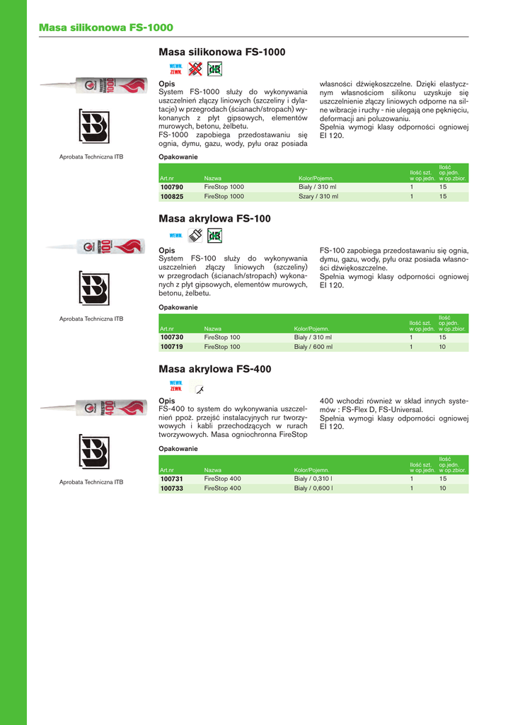 Masa silikonowa FS-1000 Masa silikonowa FS-1000 Opis System FS-1000 służy do wykonywania uszczelnień złączy liniowych (szczeliny i dylatacje) w przegrodach (ścianach/stropach) wykonanych z płyt gipsowych, elementów murowych, betonu, żelbetu. FS-1000 zapobiega przedostawaniu się ognia, dymu, gazu, wody, pyłu oraz posiada Aprobata Techniczna ITB własności dźwiękoszczelne. Dzięki elastycznym własnościom silikonu uzyskuje się uszczelnienie złączy liniowych odporne na silne wibracje i ruchy - nie ulegają one pęknięciu, deformacji ani poluzowaniu. Spełnia wymogi klasy odporności ogniowej EI 120. Opakowanie Art.nr Nazwa Kolor/Pojemn. IloĞü IloĞü szt. op.jedn. w op.jedn. w op.zbior. 100790 100825 FireStop 1000 FireStop 1000 Biały / 310 ml Szary / 310 ml 1 1 15 15 Masa akrylowa FS-100 Opis System FS-100 służy do wykonywania uszczelnień złączy liniowych (szczeliny) w przegrodach (ścianach/stropach) wykonanych z płyt gipsowych, elementów murowych, betonu, żelbetu. FS-100 zapobiega przedostawaniu się ognia, dymu, gazu, wody, pyłu oraz posiada własności dźwiękoszczelne. Spełnia wymogi klasy odporności ogniowej EI 120. Opakowanie Art.nr Nazwa Kolor/Pojemn. IloĞü IloĞü szt. op.jedn. w op.jedn. w op.zbior. 100730 100719 FireStop 100 FireStop 100 Biały / 310 ml Biały / 600 ml 1 1 Aprobata Techniczna ITB 15 10 Masa akrylowa FS-400 Opis FS-400 to system do wykonywania uszczelnień ppoż. przejść instalacyjnych rur tworzywowych i kabli przechodzących w rurach tworzywowych. Masa ogniochronna FireStop 400 wchodzi również w skład innych systemów : FS-Flex D, FS-Universal. Spełnia wymogi klasy odporności ogniowej EI 120. Opakowanie Aprobata Techniczna ITB Art.nr Nazwa Kolor/Pojemn. IloĞü IloĞü szt. op.jedn. w op.jedn. w op.zbior. 100731 100733 FireStop 400 FireStop 400 Biały / 0,310 l Biały / 0,600 l 1 1 15 10