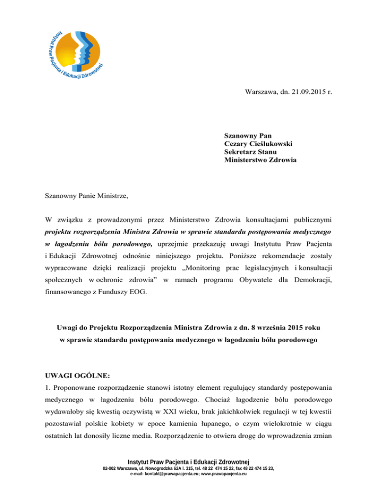 Warszawa, dn. 21.09.2015 r. Szanowny Pan Cezary Cieślukowski Sekretarz Stanu Ministerstwo Zdrowia Szanowny Panie Ministrze, W związku z prowadzonymi przez Ministerstwo Zdrowia konsultacjami publicznymi projektu rozporządzenia Ministra Zdrowia w sprawie standardu postępowania medycznego w łagodzeniu bólu porodowego, uprzejmie przekazuję uwagi Instytutu Praw Pacjenta i Edukacji Zdrowotnej odnośnie niniejszego projektu. Poniższe rekomendacje zostały wypracowane dzięki realizacji projektu „Monitoring prac legislacyjnych i konsultacji społecznych w ochronie zdrowia” w ramach programu Obywatele dla Demokracji, finansowanego z Funduszy EOG. Uwagi do Projektu Rozporządzenia Ministra Zdrowia z dn. 8 września 2015 roku w sprawie standardu postępowania medycznego w łagodzeniu bólu porodowego UWAGI OGÓLNE: 1. Proponowane rozporządzenie stanowi istotny element regulujący standardy postępowania medycznego w łagodzeniu bólu porodowego. Chociaż łagodzenie bólu porodowego wydawałoby się kwestią oczywistą w XXI wieku, brak jakichkolwiek regulacji w tej kwestii pozostawiał polskie kobiety w epoce kamienia łupanego, o czym wielokrotnie w ciągu ostatnich lat donosiły liczne media. Rozporządzenie to otwiera drogę do wprowadzenia zmian Instytut Praw Pacjenta i Edukacji Zdrowotnej 02-002 Warszawa, ul. Nowogrodzka 62A l. 315, tel. 48 22 474 15 22, fax 48 22 474 15 23, e-mail: [email protected]; www.prawapacjenta.eu w polskim systemie opieki zdrowotnej, ukierunkowanych na poprawę sytuacji kobiet ciężarnych. Niemniej jednak, lektura tego rozporządzenia skłania do licznych refleksji. 2. W szeregu przepisów zawartych w załączniku (Standard postępowania) projektodawca posługuje się pojęciem podmiotu leczniczego w znaczeniu przedmiotowym, używając w szczególności sformułowania "w podmiocie leczniczym" (np. cz. ust. 3). Jest to oczywiście niepoprawne od strony legislacyjnej. Podmiot leczniczy to jednostka organizacyjna. Siłą rzeczy nie może więc mieć miejsca żadne działanie "w niej", podobnie jak "w spółce", "w spółdzielni" itp. Tak można wypowiadać się w języku potocznym, ale nie w języku prawnym. Jednostka organizacyjna poprzez swoje organy i inne osoby może z kolei dane działania podjąć, w szczególności opracować tryb postępowania medycznego, o czym mowa w cyt. przepisie. Zdaję sobie sprawę, że powyższy zabieg redakcyjny jest już dość ugruntowany w obszarze normatywnej regulacji zdrowia publicznego, jednak jest nieprawidłowy, dlatego Państwa uznaniu pozostawiam zgłoszenie tej kwestii przez Fundację w charakterze uwagi do projektu. UWAGI SZCZEGÓŁOWE: 1. Brak jest definicji "osób sprawujących opiekę nad rodzącą", którym to pojęciem posługuje się załącznik (np. w cz. I ust. 8). Skoro jest to pojęcie niedookreślone, to wydaje się zasadnym zdefiniowanie jego znaczenia na gruncie tego aktu, tym bardziej, że zawiera on "słowniczek" pojęć. Jest to kwestia tym bardziej istotna, że - w mojej ocenie - niejasne jest czy chodzi tutaj tylko o osoby należące do personelu medycznego danego podmiotu, który udziela świadczenia rodzącej, czy też o inne osoby, np. członków rodziny, czy też tzw. doule, których obecność przy porodach jest coraz częstszym zjawiskiem. 2. § 2 projektowanego rozporządzenia daje nadzieję, na rzeczywiste stosowanie standardów postępowania w podmiotach leczniczych wykonujących działalność leczniczą w rodzaju świadczenia szpitalne. Punkty 3, 5 i 6 załączonego do rozporządzenia „Standardu postępowania medycznego w łagodzeniu bólu porodowego” znacznie tą nadzieję ograniczają. Ograniczenie ma związek z miejscem porodu, jakim jest wg „Standardu” podmiot leczniczy wykonujący działalność leczniczą w rodzaju świadczenia szpitalne, ale z obowiązkowym odziałem porodowym. W praktyce może to oznaczać, że spora grupa kobiet ciężarnych zostanie pozbawiona dostępu do określonego w rozporządzeniu „Standardu”, gdyż w podmiocie leczniczym, w którym przez przypadek może odbyć się poród, może nie być bloku porodowego. Dotyczy to w szczególności niewielkich szpitali powiatowych, a także Instytut Praw Pacjenta i Edukacji Zdrowotnej 02-002 Warszawa, ul. Nowogrodzka 62A l. 315, tel. 48 22 474 15 22, fax 48 22 474 15 23, e-mail: [email protected]; www.prawapacjenta.eu sytuacji, w których kobieta rodząca, ze względu na nagłe zdarzenie, jest daleko od podmiotu leczniczego z oddziałem porodowym, a najbliższy podmiot leczniczy, chociaż jest dużą i znaną jednostką, takiego bloku nie posiada. 3. Standard nie wskazuje, czy znajduje zastosowanie tylko w wypadkach fizjologicznego porodu, czy także niefizjologicznego W konsekwencji rodzące poprzez cesarskie cięcie, które również zmagają się z bólem okołoporodowym, ale w innym mechanizmie, nie mogą - jak się wydaje - korzystać z ustanowionego standardu łagodzenia bólu także na etapie poprzedzającym wdrożenie tej procedury medycznej. Na kwestię tę zwracali uwagę przedstawiciele Fundacji "Rodzić po ludzku". 4. p. 7 załącznika do proponowanego rozporządzenia, określa, że standardem postępowania w łagodzeniu bólu porodowego jest także udostępnienie informacji o dostępnych w danym podmiocie leczniczym metodach łagodzenia bólu porodowego. Jest to ważny punkt, gdyż określenie takich metod będzie z pewnością pomocne dla przyszłych matek. Wątpliwości budzi fakt, iż osobą udostępniającą taką informację musi być kierownik podmiotu leczniczego, a nie np. osoba najbardziej kompetentna w tym zakresie, czyli ordynator oddziału porodowego, skoro z założenia wszystkie określone metody łagodzenia bólu porodowego mogą być stosowane wg „Standardu” w podmiocie leczniczym z oddziałem porodowym. 5. Dział IV załącznika do proponowanego rozporządzenia „Farmakologiczne metody łagodzenia bólu” pkt. 1 - przepis nie normuje na jakim etapie powinna być udzi