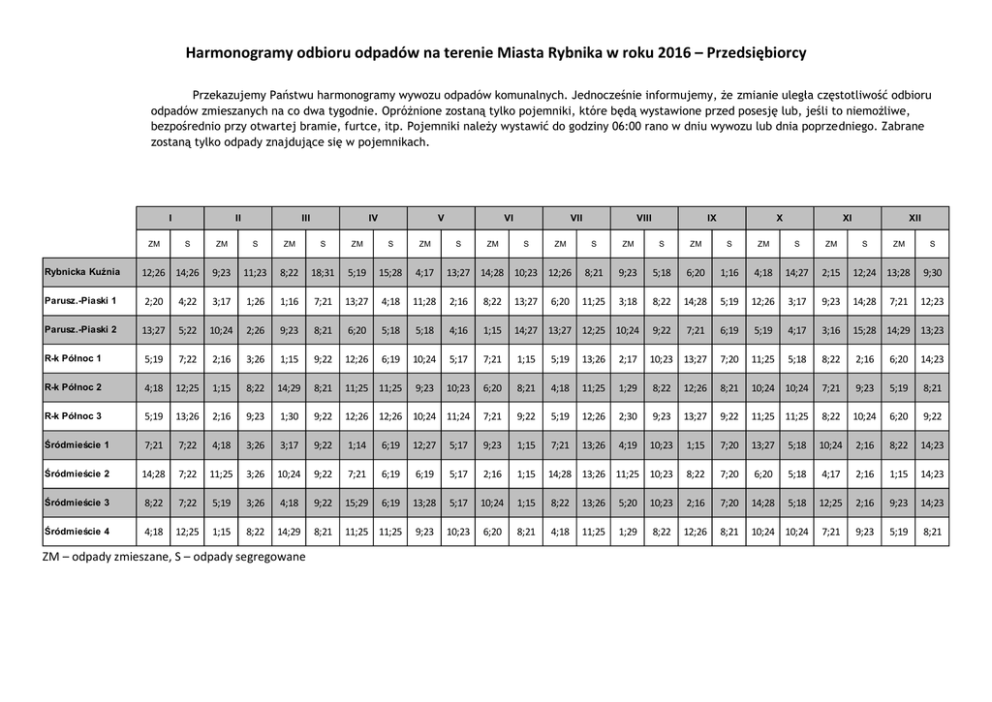 Harmonogramy odbioru odpadów na terenie Miasta Rybnika w roku 2016 – Przedsiębiorcy Przekazujemy Państwu harmonogramy wywozu odpadów komunalnych. Jednocześnie informujemy, że zmianie uległa częstotliwość odbioru odpadów zmieszanych na co dwa tygodnie. Opróżnione zostaną tylko pojemniki, które będą wystawione przed posesję lub, jeśli to niemożliwe, bezpośrednio przy otwartej bramie, furtce, itp. Pojemniki należy wystawić do godziny 06:00 rano w dniu wywozu lub dnia poprzedniego. Zabrane zostaną tylko odpady znajdujące się w pojemnikach. I ZM II IV V ZM S ZM S ZM S ZM 12;26 14;26 9;23 11;23 8;22 18;31 5;19 15;28 4;17 Parusz.-Piaski 1 2;20 4;22 3;17 1;26 1;16 7;21 13;27 4;18 Parusz.-Piaski 2 13;27 5;22 10;24 2;26 9;23 8;21 6;20 R-k Północ 1 5;19 7;22 2;16 3;26 1;15 9;22 12;26 R-k Północ 2 4;18 12;25 1;15 8;22 14;29 R-k Północ 3 5;19 13;26 2;16 9;23 Śródmieście 1 7;21 7;22 4;18 Śródmieście 2 14;28 7;22 Śródmieście 3 8;22 Śródmieście 4 4;18 Rybnicka Kuźnia S III VI ZM S ZM VIII IX X XI XII S ZM S ZM S ZM S ZM 13;27 14;28 10;23 12;26 8;21 9;23 5;18 6;20 1;16 4;18 14;27 2;15 12;24 13;28 9;30 11;28 2;16 8;22 13;27 11;25 3;18 8;22 14;28 5;19 12;26 3;17 9;23 14;28 12;23 5;18 5;18 4;16 1;15 14;27 13;27 12;25 10;24 9;22 7;21 6;19 5;19 4;17 3;16 15;28 14;29 13;23 6;19 10;24 5;17 7;21 1;15 5;19 13;26 2;17 10;23 13;27 7;20 11;25 5;18 8;22 2;16 6;20 14;23 8;21 11;25 11;25 9;23 10;23 6;20 8;21 4;18 11;25 1;29 8;22 12;26 8;21 10;24 10;24 7;21 9;23 5;19 8;21 1;30 9;22 12;26 12;26 10;24 11;24 7;21 9;22 5;19 12;26 2;30 9;23 13;27 9;22 11;25 11;25 8;22 10;24 6;20 9;22 3;26 3;17 9;22 1;14 6;19 12;27 5;17 9;23 1;15 7;21 13;26 4;19 10;23 1;15 7;20 13;27 5;18 10;24 2;16 8;22 14;23 11;25 3;26 10;24 9;22 7;21 6;19 6;19 5;17 2;16 1;15 14;28 13;26 11;25 10;23 8;22 7;20 6;20 5;18 4;17 2;16 1;15 14;23 7;22 5;19 3;26 4;18 9;22 15;29 6;19 13;28 5;17 10;24 1;15 8;22 13;26 5;20 10;23 2;16 7;20 14;28 5;18 12;25 2;16 9;23 14;23 12;25 1;15 8;22 14;29 8;21 11;25 11;25 9;23 10;23 6;20 8;21 4;18 11;25 1;29 8;22 12;26 8;21 10;24 10;24 7;21 9;23 5;19 8;21 ZM – odpady zmieszane, S – odpady segregowane S VII 6;20 S ZM 7;21 S Dzielnica Rybnicka Kuźnia Paruszowiec – Piaski 1 Paruszowiec – Piaski 2 R-k Północ 1 R-k Północ 2 R-k Północ 3 Śródmieście 1 Śródmieście 2 Śródmieście 3 Śródmieście 4 Ulica – zmieszane Ekonomiczna, Golejowska, Ks.K.Szwedy, Kuźnicka, Lipowa od 24 parz. i od 47 niep., Mglista, Nad Zalewem, Podmiejska, Rybacka, Strefowa, Św. Maksymiliana Cicha, H.Groborza, Krucza, Mikołowska od 57 niep. i 76 parz. Orla, Przemysłowa, Ptasia, Sadowa, Sosnowa, Stawowa, Wielopolska 1 i 3, Wronia, Za Torem J.Słowackiego, Kosmonautów, Kosynierów, K.Miarki do 29 niep. i do 30 parz., K.Ogrodowskiego do 50 parz. i do 27 niep., M.Konopnickiej, Radosna, Słoneczna, Stara, Studzienna do 47 niep. i do 42 parz., Wolna do 69 niep. i do 52 parz., Zbożowa do 9, Żelazna E.Orzeszkowej, J.Długosza, L.Solskiego, Mariańska, Mikołowska od 5 do 55 niep. i 74 parz., Piasta, Sybiraków, Św. Antoniego, Wyzwolenia, Zajezdna A.Asnyka, A.Fredry, J.Kusocińskiego, J.Poniatowskiego, Karłowicza, Marynarska, M.Gogola, M.Różańskiego, P.Kolonki, Widok, W.Jagiełły, Żużlowa, 26 Marca Astrów, A.Modrzewskiego, E.Plater, F.Chrószcza, Jaskółcza, J.Kasprowicza, J.Korczaka, J.Kotucza do 37, L.Janiego, Mała, Myśliwska, Nadbrzeżna, Niemodlińska, Obwiednia Płn. Olszowa, Opalowa, PCK, Pod Wałem, Pszczela, Różana, Rudzka, Sikorek, Strzelecka, Szczygłów, Wierzbowa do 25 niep. i 20 parz., Wodna, Wspólna,W. Larysza, W.Webera, Zagrodniki, Zajęcza J. i F.Białych, J.Szafranka, Raciborska do 13 niep. i 22 parz., S.Vallier, Stroma, Wiejska 1,3,5,7, Wysoka Dworcowa, Nad Potokiem, J.Piłsudskiego, Obwiednia Poł. do 23, T.Kościuszki, Św. Józefa 2-22 parz. A.Mickiewicza, B.Chrobrego, Dworek, Gliwicka do 45 nieparzyste i do 72 parzyste, A.Staiera, Hutnicza, H.Wieniawskiego, J.I.Kraszewskiego, Łony, Plac Wolności, S.Staszica, W.Łokietka, 3 Maja A.Grottgera, Był. Więźniów Pol., Cegielniana, Cmentarna, Dróżka prof. Libury, F.Brudnioka, F.Rybnickiego, J.Hallera do 12 parz i 17 niep., Jankowicka do 39 niep. i 64 parz., J.Kochanowskiego, J.Ligonia, J.Matejki, J.Sobieskiego, Klasztorna, Kościelna, Krótka, K.Damrota, Miejska, Mikołowska 1-4, Młyńska, M.Basisty, M.C.Skłodowskiej, M.Reja, Na Górze, Ogródki, Pl.Kościelny, Pocztowa, Pl. Armii Krajowej, Pl.Kopernika, Powstańców Śl., Rudzka do 125 niep. i 128 parz., Rynek, Rynkowa, Rzeczna, Strz. Byt., S.Siwca, S.Wolnego, Św.Jana, Wojska Polskiego, W.Korfantego, W.S.Reymonta do 11 niep. i 8 parz., W.Stwosza, Żwirki i Wigury, Za Komendą, Zamkowa