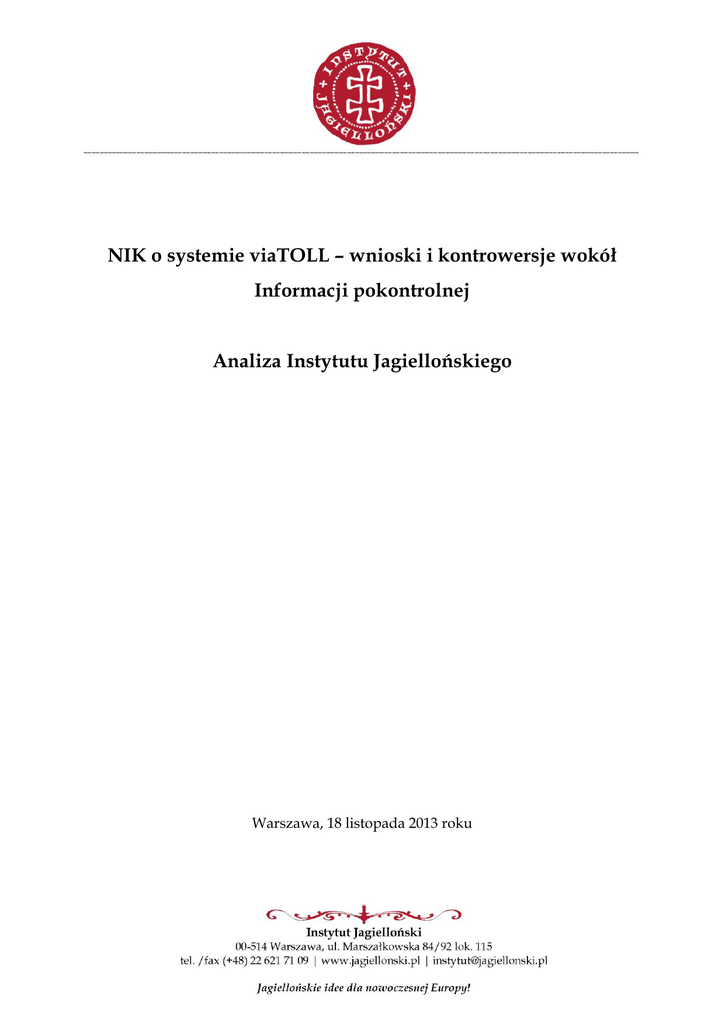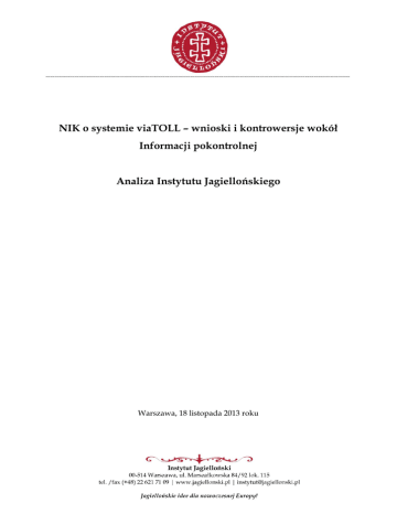 NIK o systemie viaTOLL – wnioski i kontrowersje wokół Informacji pokontrolnej Analiza Instytutu Jagiellońskiego Warszawa, 18 listopada 2013 roku Instytut Jagielloński _______________________________________________________________ Spis treści Słowo wstępne ......................................................................................................................... 3 1. System viaTOLL – geneza i funkcjonowanie ............................................................... 4 2. Kontrola NIK i jej ustalenia ............................................................................................ 5 3. Analiza zarzutów NIK .................................................................................................... 6 3.1. Uruchomienie systemu pomimo niezakończenia budowy wszystkich punktów poboru opłat ........................................................................................................ 6 3.2. Dokonanie odbioru technicznego bramownic po ok. 14 miesiącach od uruchomienia systemu poboru opłat ............................................................................... 6 3.3. Nieuprawnione uznanie bramownic za konstrukcje, które nie wymagają pozwoleń na budowę jako urządzenia bezpieczeństwa ruchu drogowego ............... 7 3.4. Zarzuty wobec systemu kar dla kierowców i nadzoru nad tym systemem przez służby inspekcji transportu drogowego ................................................................ 8 3.5. Wykonanie części bramownic z wadliwych materiałów ................................... 9 3.6. Brak metrologicznej kontroli systemu pomiarowego ....................................... 11 3.7. Wyłączenie z sieci poboru opłat autostrad koncesyjnych ................................ 11 3.8. Błędy w naliczeniach kar dla kierowców ............................................................ 12 3.9. Brak wymaganych prawem oznaczeń dróg ....................................................... 12 4. Tryb ogłoszenia Informacji pokontrolnej i pytania do Prezesa NIK ...................... 13 5. Uwagi końcowe .............................................................................................................. 14 2 Instytut Jagielloński _______________________________________________________________ Słowo wstępne Raport Najwyższej Izby Kontroli, podsumowujący dotychczasowy okres funkcjonowania systemu poboru opłat viaTOLL w znacznej mierze potwierdza opinie, które od niemal trzech lat – od etapu budowy systemu – formułowali eksperci. Dotyczy to m.in. zaniechania koniecznych zmian w prawie, przede wszystkim w zakresie złego systemu kar dla kierowców. Raport Izby zawiera jednocześnie oceny i stwierdzenia, z którymi nie sposób się zgodzić. W niniejszym dokumencie znajduje się analiza wniosków Informacji pokontrolnej, sporządzona przez ekspertów Instytutu Jagiellońskiego. 3 Instytut Jagielloński _______________________________________________________________ 1. System viaTOLL – geneza i funkcjonowanie System viaTOLL, uruchomiony z początkiem lipca 2011 r., można ocenić jako rozwiązanie rewolucyjne na kilku płaszczyznach. Po pierwsze, poprzez implementację elektronicznego systemu opłat od samochodów o masie całkowitej powyżej 3,5 tony wdrożono w Polsce rozwiązanie nowoczesne, porównywalne z najwyżej ocenianymi systemami poboru opłat w innych państwach Unii Europejskiej. Po drugie, zlikwidowano powszechnie krytykowany, niewydolny i nieprzynoszący założonych dochodów na budowę dróg system winietowy. Po trzecie – dzięki regulacjom wprowadzającym „elektroniczne myto” stworzono pierwszy raz w historii III RP narzędzie, przynoszące realne wpływy na budowę nowych dróg szybkiego ruchu i autostrad. Po czwarte – wprowadzono jasne i sprawiedliwe zasady poboru opłat, których stawki zostały uzależnione od ilości przejechanych kilometrów, spełniania przez pojazd norm środowiskowych, a zasadami tymi objęto także pojazdy zarejestrowane poza Polską. Instytut Jagielloński monitoruje system e-myta od momentu rozpoczęcia jego implementacji, czyli od końca 2010 roku. W ogłoszonym latem 2011 roku „Raporcie otwarcia” eksperci Instytutu pozytywnie ocenili proces budowy i pierwszy okres funkcjonowania systemu viaTOLL. Zwrócili jednocześnie uwagę na konieczność dokonania określonych zmian w prawie – tak, by regulacje odnoszące się do e-myta stały się bardziej przejrzyste, bardziej sprawiedliwe dla kierowców i pozbawione nieścisłości. Wśród tych kwestii znalazły się m.in. przepisy traktujące kierowców pojazdów osobowych lub terenówek z przyczepami tak samo, jak kierowców pojazdów ciężkich oraz kwestia wyłączenia autostrad zarządzanych przez prywatnych koncesjonariuszy spod systemu viaTOLL. W późniejszym okresie Instytut Jagielloński ogłosił m.in. analizę, wskazującą na konieczność zmian niesprawiedliwych i niezgodnych z Konstytucją przepisów regulujących kary dla kierowców, którzy nie wnoszą wymaganej opłaty albo wnoszą ją w nieodpowiedniej wysokości. Należy podkreślić, że żadna z tych kwestii – przypomnijmy, że od uruchomienia systemu viaTOLL minie niedługo 2,5 roku – nie została dotąd rozwiązana przez ustawodawcę. Na konieczność ich rozstrzygnięcia zwracają uwagę nie tylko eksperci i organizacje zrzeszające przewoźników i przedsiębiorców, ale również Rzecznik Praw Obywatelskich oraz urzędnicy Najwyższej Izby Kontroli. Upubliczniony przez Izbę dokument pt. „Informacja o wynikach kontroli – wdrażanie Krajowego Systemu 4 Instytut Jagielloński _______________________________________________________________ Poboru Opłat Drogowych” w znakomitej części potwierdza analizy, ogłaszane przez zespół Instytutu Jagiellońskiego. Część ustaleń i rekomendacji, zawartych w Informacji, wymaga jednak głębszego komentarza – podobnie jak kwestie, które Izba w swoich ustaleniach pomi
