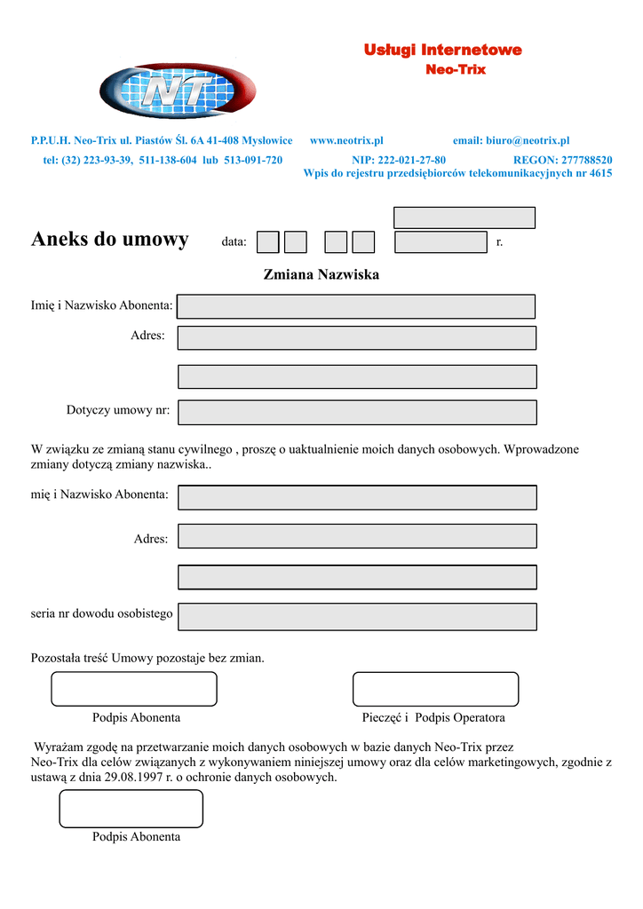 Usługi Internetowe Neo-Trix P.P.U.H. Neo-Trix ul. Piastów Śl. 6A 41-408 Mysłowice tel: (32) 223-93-39, 511-138-604 lub 513-091-720 Aneks do umowy www.neotrix.pl email: [email protected] NIP: 222-021-27-80 REGON: 277788520 Wpis do rejestru przedsiębiorców telekomunikacyjnych nr 4615 data: r. Zmiana Nazwiska Imię i Nazwisko Abonenta: Adres: Dotyczy umowy nr: W związku ze zmianą stanu cywilnego , proszę o uaktualnienie moich danych osobowych. Wprowadzone zmiany dotyczą zmiany nazwiska.. mię i Nazwisko Abonenta: Adres: seria nr dowodu osobistego Pozostała treść Umowy pozostaje bez zmian. Podpis Abonenta Pieczęć i Podpis Operatora Wyrażam zgodę na przetwarzanie moich danych osobowych w bazie danych Neo-Trix przez Neo-Trix dla celów związanych z wykonywaniem niniejszej umowy oraz dla celów marketingowych, zgodnie z ustawą z dnia 29.08.1997 r. o ochronie danych osobowych. Podpis Abonenta