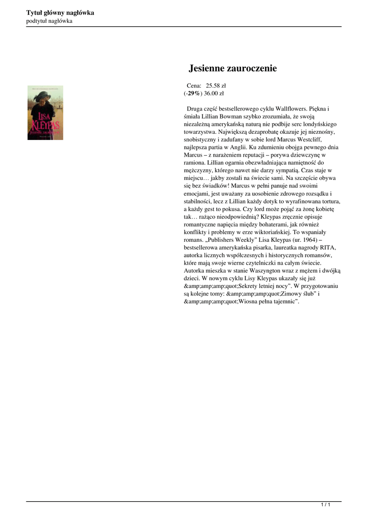 Tytuł główny nagłówka podtytuł nagłówka Jesienne zauroczenie Cena: 25.58 zł (-29%) 36.00 zł Druga część bestsellerowego cyklu Wallflowers. Piękna i śmiała Lillian Bowman szybko zrozumiała, że swoją niezależną amerykańską naturą nie podbije serc londyńskiego towarzystwa. Największą dezaprobatę okazuje jej nieznośny, snobistyczny i zadufany w sobie lord Marcus Westcliff, najlepsza partia w Anglii. Ku zdumieniu obojga pewnego dnia Marcus – z narażeniem reputacji – porywa dziewczynę w ramiona. Lillian ogarnia obezwładniająca namiętność do mężczyzny, którego nawet nie darzy sympatią. Czas staje w miejscu… jakby zostali na świecie sami. Na szczęście obywa się bez świadków! Marcus w pełni panuje nad swoimi emocjami, jest uważany za uosobienie zdrowego rozsądku i stabilności, lecz z Lillian każdy dotyk to wyrafinowana tortura, a każdy gest to pokusa. Czy lord może pojąć za żonę kobietę tak… rażąco nieodpowiednią? Kleypas zręcznie opisuje romantyczne napięcia między bohaterami, jak również konflikty i problemy w erze wiktoriańskiej. To wspaniały romans. „Publishers Weekly” Lisa Kleypas (ur. 1964) – bestsellerowa amerykańska pisarka, laureatka nagrody RITA, autorka licznych współczesnych i historycznych romansów, które mają swoje wierne czytelniczki na całym świecie. Autorka mieszka w stanie Waszyngton wraz z mężem i dwójką dzieci. W nowym cyklu Lisy Kleypas ukazały się już "Sekrety letniej nocy”. W przygotowaniu są kolejne tomy: "Zimowy ślub” i "Wiosna pełna tajemnic”. 1/1 Powered by TCPDF (www.tcpdf.org)