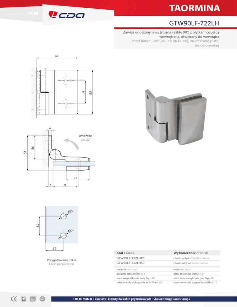TAORMINA GTW90LF-722LH Zawias unoszony lewy (ściana - szkło 90°) z płytką mocującą wewnętrzną, otwierany do wewnątrz Lifted hinge - left (wall to glass 90°), inside fixing plate, inside opening 65 34 56 4 51 36 Wnętrze Inside 32 6 34 4 34 ⌀1 4 ⌀1 34 Przygotowanie szkła Glass preparation Kod / Code Wykończenie / Finish GTW90LF-722LHPC GTW90LF-722LHSC chrom połysk / polish chrome materiał: mosiądz material: brass grubość szkła (mm): 6; 8 glass thickness (mm): 6; 8 max. waga szkła na parę (kg): 40 max. door weight per pair (kg): 40 zalecana siła dokręcania śrub (Nm): 10 recommended torque force (Nm): 10 chrom satyna / satin chrome TAORMINA І Zawiasy i klamry do kabin prysznicowych І Shower hinges and clamps