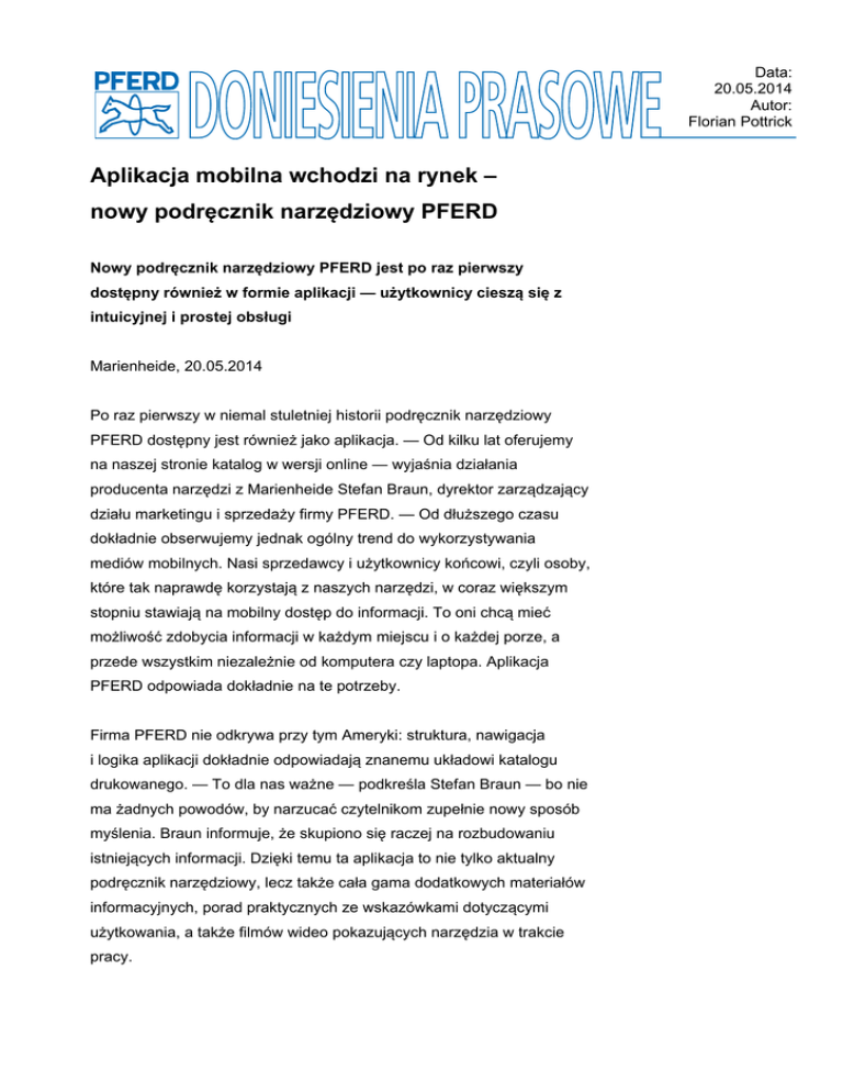 Data: 20.05.2014 Autor: Florian Pottrick Aplikacja mobilna wchodzi na rynek – nowy podręcznik narzędziowy PFERD Nowy podręcznik narzędziowy PFERD jest po raz pierwszy dostępny również w formie aplikacji — użytkownicy cieszą się z intuicyjnej i prostej obsługi Marienheide, 20.05.2014 Po raz pierwszy w niemal stuletniej historii podręcznik narzędziowy PFERD dostępny jest również jako aplikacja. — Od kilku lat oferujemy na naszej stronie katalog w wersji online — wyjaśnia działania producenta narzędzi z Marienheide Stefan Braun, dyrektor zarządzający działu marketingu i sprzedaży firmy PFERD. — Od dłuższego czasu dokładnie obserwujemy jednak ogólny trend do wykorzystywania mediów mobilnych. Nasi sprzedawcy i użytkownicy końcowi, czyli osoby, które tak naprawdę korzystają z naszych narzędzi, w coraz większym stopniu stawiają na mobilny dostęp do informacji. To oni chcą mieć możliwość zdobycia informacji w każdym miejscu i o każdej porze, a przede wszystkim niezależnie od komputera czy laptopa. Aplikacja PFERD odpowiada dokładnie na te potrzeby. Firma PFERD nie odkrywa przy tym Ameryki: struktura, nawigacja i logika aplikacji dokładnie odpowiadają znanemu układowi katalogu drukowanego. — To dla nas ważne — podkreśla Stefan Braun — bo nie ma żadnych powodów, by narzucać czytelnikom zupełnie nowy sposób myślenia. Braun informuje, że skupiono się raczej na rozbudowaniu istniejących informacji. Dzięki temu ta aplikacja to nie tylko aktualny podręcznik narzędziowy, lecz także cała gama dodatkowych materiałów informacyjnych, porad praktycznych ze wskazówkami dotyczącymi użytkowania, a także filmów wideo pokazujących narzędzia w trakcie pracy. Doniesienia Prasowe - PFERD-Werkzeuge, August Rüggeberg GmbH & Co. KG, Marienheide Aplikacja jest już teraz intensywnie wykorzystywana przez przedstawicieli handlowych firmy: — Sam jestem zaskoczony, jak często sięgam teraz po iPada zamiast wyciągać z torby katalog, jak miało to miejsce do tej pory — zdradza szczegóły codziennej pracy handlowca Eric Friedmann, szef filii firmy PFERD w Mannheim. — W aplikacji mogę na przykład szybko powiększyć zdjęcie i pokazać je mojemu rozmówcy. To mówi więcej niż cała tyrada słów. Użytkownicy końcowi doceniają, że mogą poruszać się między katalogiem drukowanym i aplikacją bez konieczności zmiany sposobu myślenia. — Przede wszystkim podobają się jednak filmy z przykładami zastosowań: jeśli na początku nie jest zbyt jasne, czy dane narzędzie nadaje się do danego zakresu obróbki, film wideo rozwiewa wszystkie wątpliwości — dodaje Friedmann, odwołując się do doświadczeń z praktyki handlowca. Ani Stefan Braun, ani Eric Friedmann nie obawiają się, że aplikacja zastąpi dział sprzedaży i jego doradców. — Wręcz przeciwnie: dzięki aplikacji rozmówcy są zwykle już przygotowani do dialogu z doradcą, zadają mu bardziej szczegółowe pytania i otrzymują — co logiczne — dokładniejsze sugestie — podkreśla z przekonaniem Friedmann i twierdzi, że połączenie drukowanego podręcznik narzędziowy, aplikacji PFERD oraz osobistego doradztwa na miejscu stanowi idealny pakiet informacyjny dla użytkownika końcowego. Stefan Braun dodaje: — Już teraz zebraliśmy sporo pochwał od użytkowników, że nie epatujemy czytelników modnymi gadżetami, a zamiast tego stawiamy w aplikacji na sprawdzone i lubiane struktury, na klasyczne funkcje, takie jak przeglądanie itp., oraz na obsługę przyswojoną wcześniej w trakcie pracy z narzędziami. To typowe dla firmy PFERD i jej podstawowych kompetencji. Kompetencje te widać także w naszym katalogu narzędzi. Do tej pory w wersji tradycyjnej, teraz dodatkowo w aplikacji mobilnej. Po prostu. Aplikację PFERD można bezpłatnie pobrać na iPada w App Store, a na urządzenia z systemem Android w sklepie Google Play. Wystarczy Strona 2 z 3 Doniesienia Prasowe - PFERD-Werkzeuge, August Rüggeberg GmbH & Co. KG, Marienheide wpisać w wyszukiwarkę frazę „PFERD-Werkzeuge”. Pojawiające się stale uaktualnienia zapewniają stały dostęp do aktualnych informacji. [Liczba znaków: 3 749 (ze spacjami)] Zdjęcia: Kontakt dla prasy: August Rüggeberg GmbH & Co. KG PFERD-Werkzeuge Florian Pottrick Public Relations Hauptstr. 13 51709 Marienheide Telefon: +49-2264-9353 Telefax: +49-2264-9660 E-mail: [email protected] www.pferd.com Przedruk bezpłatnie, prosimy o przesłanie wydrukowanego egzemplarza po publikacji. Strona 3 z 3