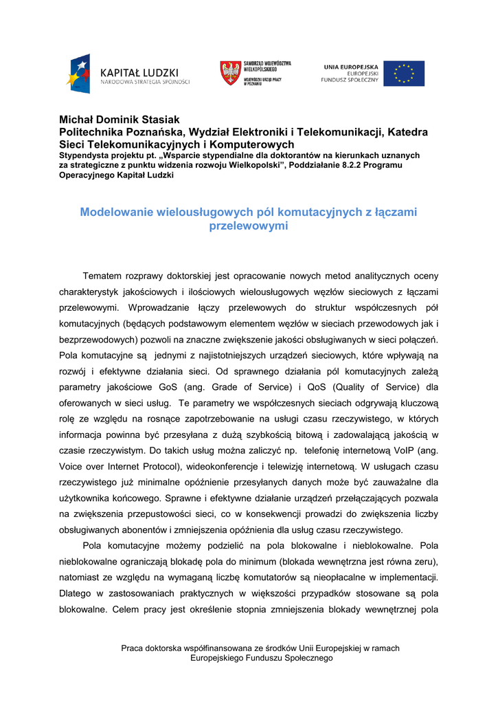 Michał Dominik Stasiak Politechnika Poznańska, Wydział Elektroniki i Telekomunikacji, Katedra Sieci Telekomunikacyjnych i Komputerowych Stypendysta projektu pt. „Wsparcie stypendialne dla doktorantów na kierunkach uznanych za strategiczne z punktu widzenia rozwoju Wielkopolski”, Poddziałanie 8.2.2 Programu Operacyjnego Kapitał Ludzki Modelowanie wielousługowych pól komutacyjnych z łączami przelewowymi Tematem rozprawy doktorskiej jest opracowanie nowych metod analitycznych oceny charakterystyk jakościowych i ilościowych wielousługowych węzłów sieciowych z łączami przelewowymi. Wprowadzanie łączy przelewowych do struktur współczesnych pół komutacyjnych (będących podstawowym elementem węzłów w sieciach przewodowych jak i bezprzewodowych) pozwoli na znaczne zwiększenie jakości obsługiwanych w sieci połączeń. Pola komutacyjne są jednymi z najistotniejszych urządzeń sieciowych, które wpływają na rozwój i efektywne działania sieci. Od sprawnego działania pól komutacyjnych zależą parametry jakościowe GoS (ang. Grade of Service) i QoS (Quality of Service) dla oferowanych w sieci usług. Te parametry we współczesnych sieciach odgrywają kluczową rolę ze względu na rosnące zapotrzebowanie na usługi czasu rzeczywistego, w których informacja powinna być przesyłana z dużą szybkością bitową i zadowalającą jakością w czasie rzeczywistym. Do takich usług można zaliczyć np. telefonię internetową VoIP (ang. Voice over Internet Protocol), wideokonferencje i telewizję internetową. W usługach czasu rzeczywistego już minimalne opóźnienie przesyłanych danych może być zauważalne dla użytkownika końcowego. Sprawne i efektywne działanie urządzeń przełączających pozwala na zwiększenia przepustowości sieci, co w konsekwencji prowadzi do zwiększenia liczby obsługiwanych abonentów i zmniejszenia opóźnienia dla usług czasu rzeczywistego. Pola komutacyjne możemy podzielić na pola blokowalne i nieblokowalne. Pola nieblokowalne ograniczają blokadę pola do minimum (blokada wewnętrzna jest równa zeru), natomiast ze względu na wymaganą liczbę komutatorów są nieopłacalne w implementacji. Dlatego w zastosowaniach praktycznych w większości przypadków stosowane są pola blokowalne. Celem pracy jest określenie stopnia zmniejszenia blokady wewnętrznej pola Praca doktorska współfinansowana ze środków Unii Europejskiej w ramach Europejskiego Funduszu Społecznego komutacyjnego po wprowadzeniu łączy przelewowych. Dla realizacji tego celu zostaną opracowane odpowiednie modele analityczne, których podstawą jest tak zwana metoda efektywnej dostępności. Wprowadzenie do pola komutacyjnego łączy przelewowych powoduje zwiększenie wartości parametru efektywnej dostępności i w konsekwencji prowadzi do zmniejszenia prawdopodobieństwa blokady. W rozprawie doktorskiej do oszacowania prawdopodobieństwa blokady w polach z łączami przelewowymi zaproponowano modyfikację znanych metod obliczeń pól komutacyjnych bez łączy przelewowych, takich jak PPGMT (Point-to-Point Blocking witch Multi-rate Traffic), PGBMT (Point-to-Group Blocking witch Multi-rate Traffic), PPD (Point-to-Point blocking - Direct method) oraz metody rekurencyjnej (Recurrent Method). W rozprawie będą rozważane różne warianty struktur systemu łączy przelewowych, a także różne warianty kierowania ruchu na łącza przelewowe, np. dla wszystkich lub wybranych klas oferowanego ruchu (takie rozwiązanie jest szczególnie przydatne w przypadku usług czasu rzeczywistego). W celu weryfikacji proponowanych metod analitycznych skonstruowano specjalny program symulacyjny w środowisku C++, który umożliwi porównanie rezultatów obliczeń analitycznych z wynikami eksperymentów symulacyjnych dla zadanych struktur pól komutacyjnych z łączami przelewowymi w warunkach zbliżonych do rzeczywistych. Uzyskane w trakcie trzech lat rezultaty są bardzo obiecujące i wskazują na możliwość znacznego zwiększenia parametrów jakości obsługi węzłów sieciowych stosunkowo niewielkim nakładem środków. Wprowadzenie systemu łączy przelewowych prowadzi do zastosowania, jedynie w pierwszej sekcji pola komutacyjnego, komutatorów o zwiększonej o jeden liczbie wejść i wyjść. Takie rozwiązanie może być zastosowane zarówno w polach zbudowanych technologiach elektronicznych, jak i w polach zbudowanych w technologiach optycznych. Znane są także alternatywne metody obniżania blokady wewnętrznej w polach komutacyjnych, np. zastosowanie specjalnych algorytmów sterowania ruchem w polu komutacyjnym (przepakowania, przestrojenia). Podstawową wadą tych metod jest duża złożoność obliczeniowa, która prowadzi do nadmiernego obciążenia urządzeń sterujących i w konsekwencji do znacznego opóźnienia przesyłanej w sieci informacji. Inną metodą zmniejszania prawdopodobieństwa blokady wewnętrznej jest np. zwiększanie liczby komutatorów sekcji środkowej pola. Takie rozwiązanie powoduje jednak drastyczne zwiększenie kosztów, które wynikają z zastosowania zwiększonej liczby układów. Zastosowania łączy przelewowych, w porównaniu do innych sposobów zmniejszenia prawdopodobieństwa blokady wewnętrznej, jest zdecydowanie najtańszym i najprostszym w implementacji rozwiązaniem, pozwalającym znacznie zwiększyć wydajność pola przy minimalnej ingerencji w jego strukturę. Ponadto, takie rozwiązanie prowadzi do pomijalnego (z inżynierskiego punktu widzenia) zwiększenia obciążenia urządzeń sterujących. Praca doktorska współfinansowana ze środków Unii Europejskiej w ramach Europejskiego Funduszu Społecznego W wymiarze praktycznym rezultatem badań będą propozycje nowych struktur pól komutacyjnych, optymalnych dla zadanej mieszaniny ruchu wielousługowego, oferowanego w rzeczywistych sieciach teleinformatycznych: lokalnych, dostępowych oraz szkieletowych. Zaproponowane struktury mogą być, przy niewielkich n