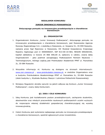 REGULAMIN KONKURSU JUNIOR INNOWACJI PODKARPACIA Dotyczącego pomysłu na innowacyjne przedsięwzięcie o charakterze biznesowym §1. ORGANIZATOR 1. Organizatorem Konkursu „Junior Innowacji Podkarpacia”, dotyczącego pomysłu na innowacyjne przedsięwzięcie o charakterze biznesowym, jest Rzeszowska Agencja Rozwoju Regionalnego S.A. z siedzibą w Rzeszowie, ul. Szopena 51, 35-959 Rzeszów, wpisana przez Sąd Rejonowy w Rzeszowie, XII Wydział Gospodarczy Krajowego Rejestru Sądowego pod nr 0000008207, NIP 813-00-10-583, REGON 690260330, kapitał zakładowy w kwocie 25 866 000,00 zł, opłacony w całości, zwana dalej Organizatorem - jako podmiot zarządzający Podkarpackim Parkiem Naukowo – Technologicznym, którego częścią jest Preinkubator Akademicki PPNT ul. Poznańska 2c, 35-084 Rzeszów. 2. Wszystkie informacje nt. Konkursu są dostępne na stronach internetowych: www.rarr.rzeszow.pl , www.preinkubator.rzeszow.pl, w siedzibie Organizatora oraz w budynku Preinkubatora Akademickiego PPNT ul. Poznańska 2c, 35-084 Rzeszów (obok budynku L, Wydziału Budowy Maszyn i Lotnictwa Politechniki Rzeszowskiej). 3. Niniejszy Regulamin określa warunki na jakich odbywa się Konkurs „Junior Innowacji Podkarpacia”, zwany dalej Konkursem. §2. IDEA i CELE KONKURSU 1. Ideą Konkursu jest kształtowanie postaw przedsiębiorczych, zachęcenie studentów, absolwentów oraz młodych pracowników naukowych podkarpackich uczelni wyższych do rozpoczęcia własnej działalności gospodarczej charakteryzującej się wysoką innowacyjnością. 2. Celem Konkursu jest wyłonienie najlepszego pomysłu na innowacyjne przedsięwzięcie o charakterze biznesowym, spośród zgłoszonych przez Uczestników. 1 §3. ZASADY UCZESTNICTWA W KONKURSIE 1. W Konkursie mogą uczestniczyć wszystkie pełnoletnie osoby fizyczne, posiadające pełną zdolność do czynności prawnych, będące autorami pomysłu na innowacyjne przedsięwzięcie o charakterze biznesowym, ponadto spełniające przynajmniej jeden z poniższych warunków: a) będące studentami (studiów stacjonarnych lub niestacjonarnych), lub b) będące absolwentami (nie dłużej niż 4 lata do momentu zgłoszenia się do Konkursu), lub c) będące młodymi pracownikami naukowymi podkarpackich uczelni wyższych (młody pracownik naukowy to osoba, która posiada dyplom magistra, nie ma tytułu doktora, ma do 4 lat doświadczenia w pracy badawczej po uzyskaniu tytułu magistra). 2. Uczestnikami Konkursu nie mogą być pracownicy Organizatora Konkursu Junior Innowacji Podkarpacia oraz ich małżonkowie, dzieci, rodzice, czy rodzeństwo. 3. Formularz zgłoszeniowy do Konkursu należy pobrać ze strony internetowej Organizatora z odpowiedniej zakładki dotyczącej Konkursu: www.rarr.rzeszow.pl www.preinkubator.rzeszow.pl 4. Formularz zgłoszeniowy do Konkursu powinien być złożony w 4 egzemplarzach (1 oryginał i 3 kopie), w sekretariacie Rzeszowskiej Agencji Rozwoju Regionalnego S.A. ul. Szopena 51, 35-959 Rzeszów. 5. Do formularza zgłoszeniowego należy załączyć po 1 kserokopii dowodu osobistego oraz dokumentu potwierdzającego status Uczestnika, o którym mowa w pkt. 1 (np. kserokopia legitymacji studenckiej, dyplomu ukończenia studiów - poświadczone za zgodność z oryginałem). 5.1. Nadesłane materiały nie będą zwracane. 6. Wzięcie udziału w Konkursie jest równoznaczne: z akceptacją Regulaminu Konkursu, ze zobowiązaniem się do przestrzegania zasad określonych w Regulaminie, 2 z potwierdzeniem, że Uczestnik spełnia wszystkie warunki niezbędne do wzięcia udziału w Konkursie, z wyrażeniem zgody na przetwarzanie danych osobowych przez Organizatora oraz osoby przez niego upoważnione w zakresie niezbędnym do prawidłowej realizacji Konkursu „Junior Innowacji Podkarpacia”, zgodnie z zgodnie z ustawą z dnia 29.08.1997 r. o ochronie danych osobowych. (Dz. U. z 2002 r. nr 101, poz.926 ze zm.), z wyrażeniem zgody na udostępnienie wizerunku, na fotografowanie i filmowanie spotkań i prezentacji Konkursowych oraz na publikacje wszelkich utrwalonych w ten sposób materiałów w określony przez Organizatora sposób, w tym w szczególności w celach promocji Konkursu. §4. PRZEBIEG KONKURSU 1. Konkurs składa się z trzech etapów. Etap I – kwalifikacyjny– zgłaszanie pomysłów przez Uczestników zakończone wyłonieniem przez Komisję Konkursową do 10 najlepszych pomysłów i zakwalifikowaniem ich autorów do etapu II. 1.1 Do pierwszego etapu należy przesyłać zgłoszenia konkursowe wypełnione na formularzu zgłoszeniowym, zamieszczonym na stronie internetowej www.rarr.rzeszow.pl lub www.preinkubator.rzeszow.pl w odpowiedniej zakładce dotyczącej Konkursu. Następnie przeprowadzona zostanie wstępna ocena zgłoszeń konkursowych. 1.2. Przy wstępnej ocenie zgłoszenia pod uwagę brana będzie m.in. innowacyjność i wykonalność pomysłu na innowacyjne przedsięwzięcie o charakterze biznesowym, po której do etapu II Konkursu przejdzie maksymalnie 10 najlepszych pomysłów. 1.3. Na etapie wstępnej oceny, Komisja Konkursowa odrzuci zgłoszenia (pomysły), które brały udział w poprzednich edycjach „Juniora Innowacji Podkarpacia” i zostały wyróżnione pierwszym, drugim lub trzecim miejscem. Etap II – szkoleniowy – zakwalifikowani do etapu II Uczestnicy będą mieli możliwość wzięcia udziału w organizowanych bezpłatnych szkoleniach, których tematem będzie przygotowanie profesjonalnego biznesplanu, a efektem szkolenia będzie opracowanie przez Uczestników biznesplanu dla zgłoszonych 3 wcześniej pomysłów. Spośród przygotowanych biznesplanów Komisja wybierze 3 najlepsze, których autorzy przejdą do etapu III. Etap III – finałowy– autorzy zakwalifikowani do finału osobiście zaprezentują biznesplan przed Komisją Konkursową, a Komisja Konkursowa przyzna: - I miejsce i Tytuł Juniora Innowacji Podkarpacia 2016, - II miejsce, - III miejsce. Czas prezentacji dla Uczestnika wynosi do 15 min. 