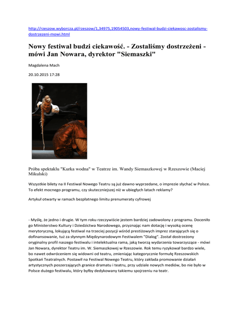 http://rzeszow.wyborcza.pl/rzeszow/1,34975,19054503,nowy-festiwal-budzi-ciekawosc-zostalismydostrzezeni-mowi.html Nowy festiwal budzi ciekawość. - Zostaliśmy dostrzeżeni mówi Jan Nowara, dyrektor "Siemaszki" Magdalena Mach 20.10.2015 17:28 Próba spektaklu "Kurka wodna" w Teatrze im. Wandy Siemaszkowej w Rzeszowie (Maciej Mikulski) Wszystkie bilety na II Festiwal Nowego Teatru są już dawno wyprzedane, o imprezie słychać w Polsce. To efekt mocnego programu, czy skuteczniejszej niż w ubiegłych latach reklamy? Artykuł otwarty w ramach bezpłatnego limitu prenumeraty cyfrowej - Myślę, że jedno i drugie. W tym roku rzeczywiście jestem bardziej zadowolony z programu. Doceniło go Ministerstwo Kultury i Dziedzictwa Narodowego, przyznając nam dotację i wysoką ocenę merytoryczną, lokującą festiwal na trzeciej pozycji wśród prestiżowych imprez starających się o dofinansowanie, tuż za słynnym Międzynarodowym Festiwalem "Dialog". Został dostrzeżony oryginalny profil naszego festiwalu i intelektualna rama, jaką tworzą wydarzenia towarzyszące - mówi Jan Nowara, dyrektor Teatru im. W. Siemaszkowej w Rzeszowie. Rok temu ryzykował bardzo wiele, bo nawet odwróceniem się widowni od teatru, zmieniając kategorycznie formułę Rzeszowskich Spotkań Teatralnych. Postawił na Festiwal Nowego Teatru, który zakłada promowanie działań artystycznych poszerzających granice dramatu i teatru, przy udziale nowych mediów, bo nie było w Polsce dużego festiwalu, który byłby dedykowany takiemu spojrzeniu na teatr. To teatr niełatwy, a rzeszowska publiczność przyjęła go z zaciekawieniem. A w tym roku - sądząc po sprzedaży biletów - z entuzjazmem. Okazało się też, że druga edycja tej młodej rzeszowskiej imprezy teatralnej, wzbudza zainteresowanie także poza Rzeszowem, obszerne zapowiedzi festiwalu znalazły się w ogólnopolskiej prasie, co rzeszowskim imprezom wciąż nie zdarza się często. Festiwal rozpoczyna się już w czwartek premierowym spektaklem wg Stanisława Ignacego Witkiewicza "Kurka wodna - katastrofa jest coraz bliżej" Teatru im. W. Siemaszkowej w Rzeszowie w reżyserii Jana Nowary, który tym razem zaprosił do współpracy specjalistów od multimediów. - Na scenie nastąpi zetknięcie się teatru z multimedialnymi żywiołami, filmem, teledyskiem. Wizje sceniczne przenikają się z obrazami z sieci - opowiada reżyser. Publiczność zostanie otoczona migającymi ekranami z każdej strony. - To metafora naszego świata, w którym bez przerwy jesteśmy otoczeni ekranami: smartfonami, tabletami - dodaje Nowara. Do konkursu w ramach tegorocznej edycji festiwalu zaproszono dziewięć bardzo różnych spektakli, głośnych, nagradzanych lub zauważonych przez krytykę: "nie-boska komedia. WSZYSTKO POWIEM BOGU!" Starego Teatru z Krakowa, "Podróż zimowa" Teatru Polskiego z Wrocławia, "Portret damy" Teatru Wybrzeże z Gdańska, "Aktorzy żydowscy" Teatru Żydowskiego z Warszawy, "Afryka" Teatru Polskiego z Bydgoszczy, "Klęski w dziejach miasta" Teatru im. W. Bogusławskiego z Kalisza, "Karskiego historia nieprawdziwa" Teatru im. C.K. Norwida z Jeleniej Góry, "Grażyna" Teatru im. L. Solskiego z Tarnowa. Druga edycja festiwalu jest bogata w wydarzenia towarzyszące. Patronem 2. edycji Festiwalu Nowego Teatru jest Christoph Schlingensief, zmarły w 2010 roku wybitny niemiecki reżyser, który był artystą totalnym, negującym granice między różnymi obszarami i gatunkami sztuki. Wokół tej postaci został skonstruowany program wydarzeń, na które teatr zaprasza w piątek od godz. 12, wśród nich są m.in.: panel dyskusyjny, performance i dwa nocne maratony rejestracji spektakli i filmów Schlingensiefa. Po pięciu latach przerwy teatr powróci także do Multimedia Szajna Festiwalu, którego idea jak najbardziej współbrzmi z profilem nowego festiwalu, zorientowanego na teatr tworzony pod wpływem estetyki nowych mediów. Pod jego szyldem zostanie zagrany spektakl "Lew na ulicy", tegorocznych absolwentów Wydziału Aktorskiego PWST we Wrocławiu, który zakończy festiwal 30 października. Cały tekst: http://rzeszow.wyborcza.pl/rzeszow/1,34975,19054503,nowy-festiwal-budzi-ciekawosczostalismy-dostrzezeni-mowi.html#ixzz3pCiQgBpr