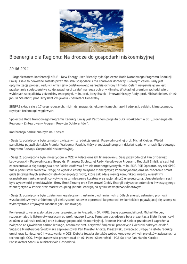 Bioenergia dla Regionu: Na drodze do gospodarki niskoemisyjnej 20-06-2011 Organizatorem konferencji NEUF – New Energy User Friendly była Społeczna Rada Narodowego Programu Redukcji Emisji. Ciało to powołane zostało przez Ministra Gospodarki i ma charakter doradczy. Głównym celem Rady jest optymalizacja procesu redukcji emisji jako podstawowego narzędzia ochrony klimatu. Celem uzupełniającym jest przekonanie społeczeństwa co do zasadności działań na rzecz ochrony klimatu. W skład jej gremium wchodzi wielu wybitnych specjalistów z dziedziny energetyki, m.in. prof. Jerzy Buzek – Przewodniczący Rady, prof. Michał Kleiber, dr inż. Janusz Steinhoff, prof. Krzysztof Żmijewski – Sekretarz Generalny. SRNPRE składa się z 17 grup roboczych, mi.in: ds. prawa, ds. ekonomicznych, nauki i edukacji, pakietu klimatycznego, czystych technologii węglowych. Społeczna Rada Narodowego Programu Redukcji Emisji jest Patronem projektu SDG Pro-Akademia pt.: „Bioenergia dla Regionu – Zintegrowany Program Rozwoju Doktorantów”. Konferencja podzielona była na 3 sesje: · Sesja 1: poświęcona była tematom związanym z redukcją emisji. Przewodniczył jej prof. Michał Kleiber. Wśród panelistów pojawił się także Premier Waldemar Pawlak, który przedstawił program działań rządu w ramach Narodowego Programu Rozwoju Gospodarki Niskoemisyjnej. · Sesja 2: poświęcona była inwestycjom w OZE w Polsce oraz ich finansowaniu. Sesji przewodniczył Pan dr Dariusz Ledworowski – Przewodniczący Grupy ds. Finansów Społecznej Rady Narodowego Programu Redukcji Emisji. W sesji tej zaprezentowała się europejska oraz Polska czołówka firm elektroenergetycznych, m.in. EDF, PSE Operator, czy też SPEC. Wielu panelistów zwracało uwagę na wysokie koszty związane z energetyką konwencjonalną oraz na znaczenie smart grids (inteligentnych systemów elektroenergetycznych), które zakładają rozwój komunikacji między wszystkimi uczestnikami rynku energii, co wpłynie na zmniejszenie kosztów oraz racjonalność energetyczną. Uzupełnieniem sesji były wypowiedzi przedstawicieli firmy Ernst&Young oraz Towarowej Giełdy Energii dotyczące potencjału inwestycyjnego w energetyce w Polsce oraz market coupling (handel energią na rynku wewnątrzwspólnotowym) · Sesja 3: poświęcona była działaniom legislacyjnym: ustawie o odnawialnych źródłach energii, ustawie o promocji wysokoefektywnych źródeł energii elektrycznej, ustawie o promocji kogeneracji (w kontekście pojawiającej się szansy na wykorzystanie krajowych zasobów gazu łupkowego). Konferencji towarzyszyło także otwarte posiedzenie Prezydium SR NPRE. Sesję poprowadził prof. Michał Kleiber, rozpoczynając ją listem otwierającym od prof. Jerzego Buzka. Tematem posiedzenia była prezentacja Białej Księgi, czyli założeń w zakresie redukcji oraz budowy gospodarki niskoemisyjnej. Profesor Michał Kleiber przedstawił zagrożenia związane ze zjawiskiem carbon leakage, natomiast prof. Krzysztof Żmijewski propozycje i kierunki dalszych działań. Sugestie Ministerstwa Środowiska zaprezentował Pan Minister Andrzej Kraszewski, zwracając uwagę na istotę redukcji emisji oraz konieczność inwestowania w OZE. Debata toczyła się także wobec kontrowersyjnych projektów związanych z technologią CCS. Swoje stanowisko prezentował dr inż. Paweł Skowroński – PGE SA oraz Pan Marcin Karolec – Podsekretarz Stanu w Ministerstwie Gospodarki. Konferencja stała na bardzo wysokim poziomie merytorycznym oraz organizacyjnym. Strona CBI Pro-Akademia używa ciasteczek (cookies), dzięki którym nasz serwis może działać lepiej. Zobacz
