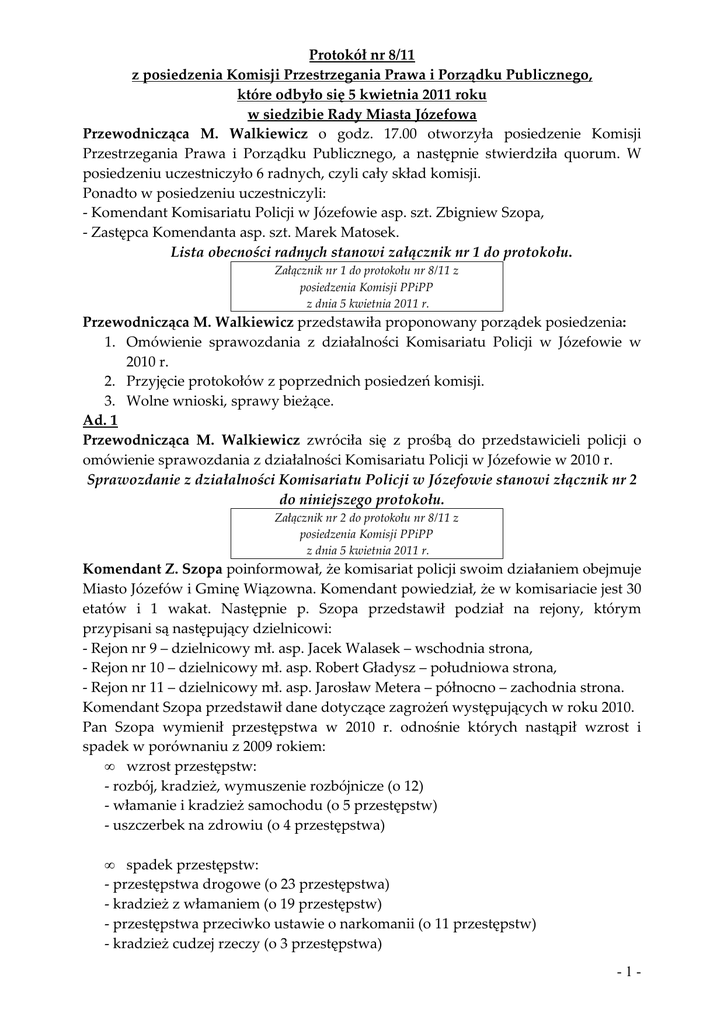 Protokół nr 8/11 z posiedzenia Komisji Przestrzegania Prawa i Porządku Publicznego, które odbyło się 5 kwietnia 2011 roku w siedzibie Rady Miasta Józefowa Przewodnicząca M. Walkiewicz o godz. 17.00 otworzyła posiedzenie Komisji Przestrzegania Prawa i Porządku Publicznego, a następnie stwierdziła quorum. W posiedzeniu uczestniczyło 6 radnych, czyli cały skład komisji. Ponadto w posiedzeniu uczestniczyli: - Komendant Komisariatu Policji w Józefowie asp. szt. Zbigniew Szopa, - Zastępca Komendanta asp. szt. Marek Matosek. Lista obecności radnych stanowi załącznik nr 1 do protokołu. Załącznik nr 1 do protokołu nr 8/11 z posiedzenia Komisji PPiPP z dnia 5 kwietnia 2011 r. Przewodnicząca M. Walkiewicz przedstawiła proponowany porządek posiedzenia: 1. Omówienie sprawozdania z działalności Komisariatu Policji w Józefowie w 2010 r. 2. Przyjęcie protokołów z poprzednich posiedzeń komisji. 3. Wolne wnioski, sprawy bieżące. Ad. 1 Przewodnicząca M. Walkiewicz zwróciła się z prośbą do przedstawicieli policji o omówienie sprawozdania z działalności Komisariatu Policji w Józefowie w 2010 r. Sprawozdanie z działalności Komisariatu Policji w Józefowie stanowi złącznik nr 2 do niniejszego protokołu. Załącznik nr 2 do protokołu nr 8/11 z posiedzenia Komisji PPiPP z dnia 5 kwietnia 2011 r. Komendant Z. Szopa poinformował, że komisariat policji swoim działaniem obejmuje Miasto Józefów i Gminę Wiązowna. Komendant powiedział, że w komisariacie jest 30 etatów i 1 wakat. Następnie p. Szopa przedstawił podział na rejony, którym przypisani są następujący dzielnicowi: - Rejon nr 9 – dzielnicowy mł. asp. Jacek Walasek – wschodnia strona, - Rejon nr 10 – dzielnicowy mł. asp. Robert Gładysz – południowa strona, - Rejon nr 11 – dzielnicowy mł. asp. Jarosław Metera – północno – zachodnia strona. Komendant Szopa przedstawił dane dotyczące zagrożeń występujących w roku 2010. Pan Szopa wymienił przestępstwa w 2010 r. odnośnie których nastąpił wzrost i spadek w porównaniu z 2009 rokiem: • wzrost przestępstw: - rozbój, kradzież, wymuszenie rozbójnicze (o 12) - włamanie i kradzież samochodu (o 5 przestępstw) - uszczerbek na zdrowiu (o 4 przestępstwa) • spadek przestępstw: - przestępstwa drogowe (o 23 przestępstwa) - kradzież z włamaniem (o 19 przestępstw) - przestępstwa przeciwko ustawie o narkomanii (o 11 przestępstw) - kradzież cudzej rzeczy (o 3 przestępstwa) -1- - uszkodzenie mienia (o 3 przestępstwa) - bójka i pobicie (o 2 przestępstwa) Komendant opowiedział o współpracy Policji ze Strażą Miejską, która w szczególności polegała na wykonywaniu wspólnych patroli. Łącznie w 2010 roku odbyło się 89 patroli (57 patroli na I zmianie, 32 patrole na II zmianie). Komendant wymienił ujęte w sprawozdaniu wyniki uzyskane w czasie wspólnych patroli. W następnej kolejności p. Z. Szopa omówił główne kierunki działania Komisariatu Policji w Józefowie. Pod koniec wypowiedzi p. Szopa poinformował, że na odprawie rocznej Komendant Powiatowy pozytywnie ocenił pracę jednostki policyjnej w Józefowie. Radny C. Łukaszewski spytał co należy rozumieć pod pojęciem przestępstwo drogowe. Komendant Z. Szopa powiedział, że zgodnie z kodeksem drogowym przestępstwem drogowym jest np. prowadzenie pojazdu w stanie nietrzeźwym, ale przestępstwem nie jest np. przekroczenie prędkości. Radny C. Łukaszewski spytał w które rejony miasta kierowane są służby ponadnormatywne. Komendant Z. Szopa odpowiedział, że w rejony najbardziej zagrożone, które wybierane są na podstawie analiz czy zgłoszeń np. Burmistrza. Radny C. Łukaszewski spytał, czy patrolowane są również dalsze obszary miasta. Komendant Z. Szopa powiedział, że patrole wysyłane były również na teren Michalina i w okolice Górek. Radny C. Łukaszewski spytał o przyczyny wzrostu rozbojów, kradzieży i włamań w porównaniu z rokiem 2009. Komendant Z. Szopa powiedział, że wzrost jest nieznaczny, a większa liczba wiąże się ze zwiększoną skutecznością i aktywnością policji. Radna L. Sibilska poruszyła temat dotyczący spotkań policji z młodzieżą szkolną. Radna powiedziała, że w ubiegłych latach jej zdaniem takich spotkań było za mało, a są one bardzo potrzebne. Komendant Z. Szopa poinformował, że jeśli jest zapotrzebowanie na tego typu spotkania to należy zgłosić to mł. asp. Annie Wasilewicz z Komendy Powiatowej Policji, która zajmuje się m.in. organizacją prelekcji. Następnie komendant poinformował, że kontakt z młodzieżą polega też na tym, iż w godzinach rannych w okolice szkół kierowane są patrole policji. Pan Szopa dodał, że policjant może również wejść na teren szkoły. Przewodnicząca M. Walkiewicz powiedziała, że w poprzednim posiedzeniu komisji udział brał przewodniczący MKRPA p. W. Glinka, który opowiadał o kontrolach punktów sprzedaży alkoholu. Przewodnicząca przypomniała, że p. Glinka mówił, iż takie kontrole mają charakter prewencyjny, ponieważ muszą być zapowiedziane. Komendant Z. Szopa potwierdził, że obecnie kontrole punktów sprzedaży alkoholu musza być zapowiedziane. Radna H. Dudek która była członkiem Miejskiej Komisji Rozwiązywania Problemów Alkoholowych poinformowała, że przed każdą zapowiedzianą kontrolą komisja obserwowała punkt sprzedaży, o czym już nie informowano właściciela sklepu. Komendant Z. Szopa wspomniał, że prócz kontroli MKRPA punkty sprzedaży alkoholu bez zapowiedzi może skontrolować policja. -2- Przewodnicząca M. Walkiewicz spytała dlaczego w godzinach rannych jest więcej patroli niż w godzinach popołudniowych. Komendant Z. Szopa odpowiedział, że dotychczas było większe zapotrzebowanie na patrole szkolne. Przewodnicząca M. Walkiewicz przypomniała, że na posiedzeniu komisji, w którym uczestniczył aspirant Mirosław Lech, radna A. Masik informowała o zdarzeniu, które