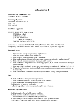 Laboratorium 1 Powtórka SQL - zapytania SQL Pracujemy w SQL Developer. Dane do połączenia: Hostname: oracle4.icis.pcz.pl Port: 1521 SID: oracle4 Struktura zapytania SELECT [DISTINCT] lista_wyrazen FROM lista_relacji [WHERE warunki] [GROUP BY kryteria [HAVING warunki]] [ORDER BY kryteria [DESC]]; Ćwiczenia na 4 tabelach: STUDENCI, PRACOWNICY, POJAZDY, KIEROWCY Przeglądany zawartość i budowę tabel. Proszę wykonać w SQL poniższe zapytania. Zapytania proste 1. 2. 3. 4. 5. 6. Wyświetlenie nazwy zalogowanego użytkownika Lista wszystkich informacji o studentach. Lista nazwisk studentów złożonych z 3 znaków. Lista studentów specjalności „Zintegrowane systemy zarządzania i analizy danych”. Lista różnych imion męskich nie dłuższych niż 6 znaków. Lista studentów, których nazwiska zaczynają się na A, B, C albo D posortowana malejąco po nazwiskach. 7. Lista wszystkich studentek o nazwisku zaczynającym się na literę R i kolejne (S, T, U, ...). 8. Wszystkie informacje o studentach będących na studiach stacjonarnych, przynajmniej na dwa sposoby. 9. Lista całkowitych dochodów wszystkich pracowników, którzy nie są dyrektorami. Daty 10. Lista studentów, którzy urodzili się w marcu. 11. Lista studentów (imiona i nazwisko) wraz z ich wiekiem. 12. Lista studentów, którzy urodzili się w sobotę. 13. Liczba dni od naszego urodzenia. 14. Dzień tygodnia, w którym rozpoczęła się II woja światowa. Zapytania z grupowaniem 15. Liczba studentów na każdym roku studiów. 16. Lista nazwisk studentów, które się powtarzają. 17. Liczba studentów na każdym z rodzajów studiów. 18. Liczba studentów na każdej specjalności, ale tylko tych z II-stopnia. 19. Wyświetlić nazwiska osób, które mają ten sam dzień urodzenia :) 20. Wyświetlić najdłuższe nazwiska wśród studentów. 21. Wyświetlić statystykę występowania imion w tabeli STUDENCI. 22. Dla dociekliwych: W statystyce imion można uwzględnić pierwsze imię (jeśli student ma dwa) pomijając drugie. Np. do liczby wystąpień imienia MARCIN dojdzie też MARCIN, JACEK. 23. Wyświetlić średnią płacę wszystkich pracowników. 24. Wyświetlić maksymalne zarobki w każdym z działów, tabela PRACOWNICY. 25. Maksymalne i minimalne zarobki na danym stanowisku. 26. Z tabeli PRACOWNICY wyświetlić dział, który jest najliczniejszy. 27. Z tabeli POJAZDY wyświetlić listę marek samochodów wraz z ich liczbą jeśli jest ona większa niż 100. Złączenia 28. Na tabeli PRACOWNICY wyświetlić kolumny: NR_AKT, NAZWISKO, STANOWISKO, KIEROWNIK, SZEF. Ostatnia kolumna powinna zawierać nazwisko kierownika danego pracownika. 29. Wyświetlić liczbę wszystkich rekordów otrzymaną z iloczynu kartezjańskiego z tabel KIEROWCY i POJAZDY. 30. Wyświetlić nazwę właściciela (imię i nazwisko w jednej kolumnie) wraz z marką i kolorem samochodu. 31. Wyświetlić nazwę właściciela (imię i nazwisko w jednej kolumnie) wraz z jego numerem ID i liczbą jego samochodów.