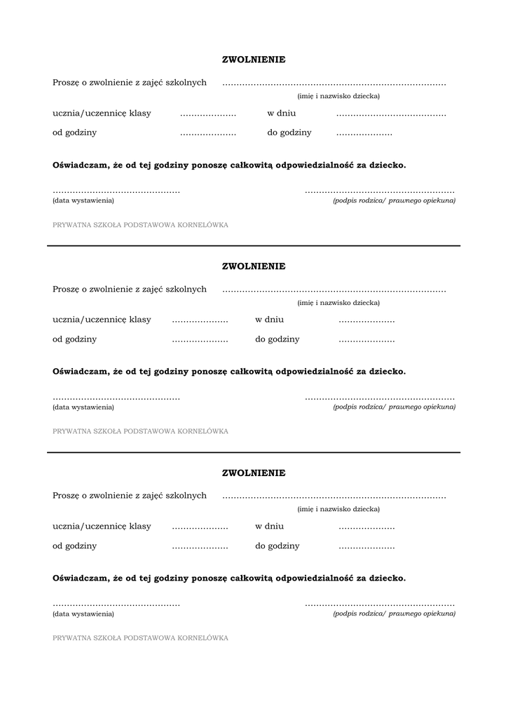 ZWOLNIENIE Proszę o zwolnienie z zajęć szkolnych ……………………………………….…………………………… (imię i nazwisko dziecka) ucznia/uczennicę klasy ……………….. w dniu …………………….………….. od godziny ……………….. do godziny ……………….. Oświadczam, że od tej godziny ponoszę całkowitą odpowiedzialność za dziecko. ……………………………………… …………………………………..………… (podpis rodzica/ prawnego opiekuna) (data wystawienia) PRYWATNA SZKOŁA PODSTAWOWA KORNELÓWKA ZWOLNIENIE Proszę o zwolnienie z zajęć szkolnych ……………………………………….…………………………… (imię i nazwisko dziecka) ucznia/uczennicę klasy ……………….. w dniu ……………….. od godziny ……………….. do godziny ……………….. Oświadczam, że od tej godziny ponoszę całkowitą odpowiedzialność za dziecko. ……………………………………… …………………………………..………… (podpis rodzica/ prawnego opiekuna) (data wystawienia) PRYWATNA SZKOŁA PODSTAWOWA KORNELÓWKA ZWOLNIENIE Proszę o zwolnienie z zajęć szkolnych ……………………………………….…………………………… (imię i nazwisko dziecka) ucznia/uczennicę klasy ……………….. w dniu ……………….. od godziny ……………….. do godziny ……………….. Oświadczam, że od tej godziny ponoszę całkowitą odpowiedzialność za dziecko. ……………………………………… (data wystawienia) PRYWATNA SZKOŁA PODSTAWOWA KORNELÓWKA …………………………………..………… (podpis rodzica/ prawnego opiekuna)