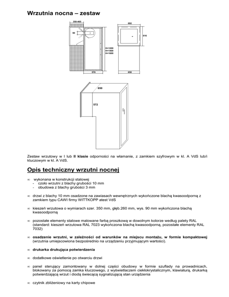 Wrzutnia nocna – zestaw 350-465 692 90 616 H=1200 H=1400 H=1600 570 650 650 572 Zestaw wrzutowy w I lub II klasie odporności na włamanie, z zamkiem szyfrowym w kl. A VdS lub/i kluczowym w kl. A VdS. Opis techniczny wrzutni nocnej • wykonana w konstrukcji stalowej - czoło wrzutni z blachy grubości 10 mm - obudowa z blachy grubości 3 mm • drzwi z blachy 10 mm osadzone na zawiasach wewnętrznych wykończone blachą kwasoodporną z zamkiem typu CAWI firmy WITTKOPP atest VdS • kieszeń wrzutowa o wymiarach szer. 350 mm, głęb.260 mm, wys. 90 mm wykończona blachą kwasoodporną • pozostałe elementy stalowe malowane farbą proszkową w dowolnym kolorze według palety RAL (standard: kieszeń wrzutowa RAL 7023 wykończona blachą kwasoodporną, pozostałe elementy RAL 7032) • osadzenie wrzutni, w zależności od warunków na miejscu montażu, w formie kompaktowej (wrzutnia umiejscowiona bezpośrednio na urządzeniu przyjmującym wartości). • drukarka drukująca potwierdzenia • dodatkowe oświetlenie po otwarciu drzwi • panel sterujący zamontowany w dolnej części obudowy w formie szuflady na prowadnicach, blokowany za pomocą zamka kluczowego, z wyświetlaczem ciekłokrystalicznym, klawiaturą, drukarką potwierdzającą wrzut i diodą świecącą sygnalizującą stan urządzenia • czytnik zbliżeniowy na karty chipowe • dwa czujniki fotooptyczne • zasilacz buforowany 1,3 Ah Zastosowanie Kontrola i rejestracja zdarzeń bankowej mechanicznej wrzutni nocnej. Funkcje - identyfikacja klienta poprzez wprowadzenie pin-kodu z klawiatury, składającego się z dowolnej liczby cyfr (max.8) lub poprzez zbliżenie karty chipowej do czytnika - odblokowanie drzwi zewnętrznych wrzutni oraz urządzenia wrzutowego - detekcja wrzutu depozytu - wydruk potwierdzający wrzut zawierający: nazwę banku, datę i godzinę, pin-kod klienta oraz ilość dokonanych wrzutów - zapamiętanie w pamięci systemu zdarzeń związanych z obsługą klienta - kontrola i rejestracja innych zdarzeń związanych z pracą systemu (zapełnienie wrzutni, wprowadzanie danych, uszkodzenie czujnika, ewentualna awaria itp.) - podgląd zdarzeń i pin-kodów klientów z pamięci systemu na wyświetlaczu lub wydruk na drukarce potwierdzającej - obsługa wrzutni przez personel banku po wprowadzeniu specjalnego kodu bankowego - tworzenie raportu dziennego z dokonanych wrzutów Specyfikacja techniczna Ilość pin-kodów klientów: Ilość zapamiętanych zdarzeń: Max. Liczba wrzutów przez jednego klienta: 256 8-cyfrowych pin-kodów 256 ostatnich zdarzeń 99 Sterowanie: mikroprocesor pamięci kodów i zdarzeń niezależnie podtrzymywana zegar/kalendarz niezależnie podtrzymywany Interfejsy: drukarka potwierdzająca drukarka raportująca klawiatura 12 znakowa lub czytnik zbliżeniowy na karty chipowe Detekcja wrzutów: 2 czujniki fotooptyczne Zasilanie: 220V/50Hz awaryjne 12V DC, 5-6 godzin Moc pobierana: 10W