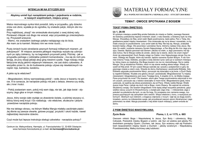 INTENCJA MI NA STYCZEŃ 2010 Abyśmy umieli być narzędziami pokoju i pojednania w rodzinie, w naszych wspólnotach, miejscu pracy MATERIAŁY FORMACYJNE DLA WSPÓLNOT RYCERSTWA NIEPOKALANEJ – STYCZEŃ 2010 ROKU TEMAT: OWOCE SPOTKANIA Z BOGIEM Matce nieznośnego synka ktoś poradził, żeby w przypadku, gdy dziecko znów coś zbroi, wysłała je do ogródka, by znalazło patyk, którym złoi mu skórę. Przy najbliższej „okazji” nie omieszkała skorzystać z owej dobrej rady. Ponieważ chłopak coś długo nie wracał, więc przywołała go zniecierpliwiona. Przyszedł wreszcie: - Mamo, nie znalazłem żadnego patyka nadającego się do bicia. Ale mam za to kamień. Możesz nim we mnie rzucić... Pusty śmiech budzi określanie pewnych formacji militarnych mianem „sił pokojowych”. W miejsce zarzewia jakiegoś niepokoju wysyła się uzbrojonych po zęby żołnierzy, by na bagnetach przynosili pokój. Później - jak w przypadku jednego z oddziałów polskich komandosów - ma się do nich pretensję, że przy okazji jakiejś akcji giną niewinni cywile. Tego rodzaju misje faktycznie służą jakimś niejasnym interesom, nie zaś dobru człowieka. A wszystko przez to, że do budowania pokoju używa się niewłaściwych narzędzi: kija, kamienia, karabinu. A jakie są te właściwe? - Błogosławieni, którzy wprowadzają pokój! – woła Jezus w kazaniu na górze. A to oznacza, że narzędzie pokoju nie jest z żelaza, drewna czy skały, ale z krwi i kości. - Pokój zostawiam wam, pokój mój wam daję, nie tak, jak daje świat - słyszymy Jego głos w innym miejscu. Jezus, który swoje ciało wydaje za zbawienie świata, a później wszyscy ci, którzy biorą swój krzyż i Go naśladują - oto właściwe, skuteczne i jedyne prawdziwe narzędzia pokoju. Nie ma takiego obrazu, na którym Matka Maryja miałaby zaciśnięte pięści. Jej dłonie są zawsze otwarte, gotowe przyjąć, przytulić i ukoić każde, nawet najbardziej nieznośne dziecko. Czyż może być lepsza instrukcja obsługi człowieka - narzędzia pokoju? Centrum św. Maksymiliana, Harmęże, ul. Franciszkańska 12, 32-600 Oświęcim www.harmeze.franciszkanie.pl; e-mail: [email protected]. TEKST PISMA ŚWIĘTEGO: Łk 1, 26-56 W szóstym miesiącu posłał Bóg anioła Gabriela do miasta w Galilei, zwanego Nazaret, do Dziewicy poślubionej mężowi imieniem Józef, z rodu Dawida; a Dziewicy było na imię Maryja. Wszedłszy do Niej, anioł rzekł: Bądź pozdrowiona, łaski pełna, Pan z Tobą, błogosławiona jesteś między niewiastami. Ona zmieszała się na te słowa i rozważała, co by miało znaczyć to pozdrowienie. Lecz anioł rzekł do Niej: Nie bój się, Maryjo, znalazłaś bowiem łaskę u Boga. Oto poczniesz i porodzisz Syna, któremu nadasz imię Jezus. Będzie On wielki i zostanie nazwany Synem Najwyższego, a Pan Bóg da Mu tron Jego praojca, Dawida. Będzie panował nad domem Jakuba na wieki, a Jego panowaniu nie będzie końca. Na to Maryja rzekła do anioła: Jakże się to stanie, skoro nie znam męża? Anioł Jej odpowiedział: Duch Święty zstąpi na Ciebie i moc Najwyższego okryje Cię cieniem. Dlatego też Święte, które się narodzi, będzie nazwane Synem Bożym. A oto również krewna Twoja, Elżbieta, poczęła w swej starości syna i jest już w szóstym miesiącu ta, którą miano za niepłodną. Dla Boga bowiem nie ma nic niemożliwego. Na to rzekła Maryja: Oto ja służebnica Pańska, niech mi się stanie według słowa twego. Wtedy odszedł od Niej anioł. W tym czasie Maryja wybrała się i poszła z pośpiechem w góry do pewnego miasta w ziemi Judy. Weszła do domu Zachariasza i pozdrowiła Elżbietę. Gdy Elżbieta usłyszała pozdrowienie Maryi, poruszyło się dzieciątko w jej łonie, a Duch Święty napełnił Elżbietę. Wydała ona głośny okrzyk i powiedziała: Błogosławionaś Ty między niewiastami i błogosławiony jest owoc Twojego łona. A skądże mi to, że Matka mojego Pana przychodzi do mnie? Oto bowiem, skoro głos Twego pozdrowienia zabrzmiał w moich uszach, poruszyło się z radości dzieciątko w moim łonie. Błogosławiona [jest], która uwierzyła, że spełnią się słowa powiedziane Jej od Pana. Wtedy rzekła Maryja: Wielbi dusza moja Pana i raduje się duch mój w Bogu, moim Zbawcy. Bo wejrzał na uniżenie Służebnicy swojej. Oto bowiem błogosławić mnie będą odtąd wszystkie pokolenia, gdyż wielkie rzeczy uczynił mi Wszechmocny; a święte jest Jego imię – i miłosierdzie Jego z pokoleń na pokolenia dla tych, co się Go boją. On przejawia moc ramienia swego, rozprasza pyszniących się zamysłami serc swoich. Strąca władców z tronu, a wywyższa pokornych. Głodnych syci dobrami, a bogaczy odprawia z niczym. Ujął się za sługą swoim, Izraelem, pomny na miłosierdzie swoje, jak przyobiecał naszym ojcom Abrahamowi i jego potomstwu na wieki. Maryja pozostała u niej około trzech miesięcy; potem wróciła do domu. Z PISM ŚWIĘTEGO MAKSYMILIANA: Życie Boże Pisma, t. 2, nr 1175, s. 665 Owocem miłości Boga i Niepokalanej to Jezus, Syn Boży i człowieczy, BógCzłowiek, Pośrednik miedzy Bogiem a ludźmi. Jak Syn od wieków jest jakoby Pośrednikiem pomiędzy Ojcem i Duchem, tak Jezus, Syn wcielony stał się Pośrednikiem bezpośrednim między Ojcem a Duchem – jakoby wcielonym – Niepokalaną. Przedstawicielką, Matką duchową całej ludzkości. WYJAŚNIENIE TEKSTÓW: ROZWAŻANIE: Próba syntezy W obecnym numerze Materiałów Formacyjnych chcemy zamknąć cykl rozważań związanych ze Sceną Zwiastowania Najświętszej Maryi Panny. Chcemy jeszcze raz, tym razem całościowo, spojrzeć na tę scenę i podsumowując to, co do tej pory zostało już powiedziane, podjąć rozważania o owocach i konsekwencjach tego wydarzenia. Spróbujemy spojrzeć na scenę Zwiastowania w inny niż dotychczas sposób. Spróbujmy w inny sposób podjąć lekturę Pisma Świętego. Zamiast wgłębiać się w treść i znaczenie poszczegó