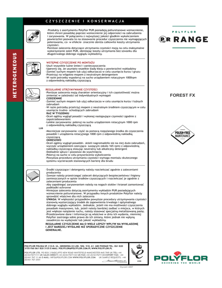 CZYSZCZENIE I KONSERWACJA -Produkty z asortymentu Polyflor PUR posiadają poliuretanowe wzmocnienie, które chroni posadzkę poprzez wzmocnienie jej odporności na zabrudzenia i zarysowania. W połączeniu z najwyższej jakości gładkim wykończeniem powierzchni pozwala to na stosowanie procedur czyszczenia nie wymagających polerowania, co- w efekcie- znacznie obniża całkowite koszty utrzymania czystości. Poniższe zalecenia dotyczące utrzymania czystości mają na celu maksymalne wykorzystanie zalet PUR, obniżając koszty utrzymania bez szwanku dla długotrwałego dobrego wyglądu wykładziny. WSTĘPNE CZYSZCZENIE PO MONTAŻU -Usuń wszystkie luźne śmieci i zanieczyszczenia -Upewnij się, że usunięto wszelkie ślady kleju z powierzchni wykładziny -Zamieć suchym mopem lub użyj odkurzacza w celu usunięcia kurzu i gruzu -Przetrzyj na wilgotno mopem z neutralnym detergentem -W razie potrzeby wypoleruj na sucho urządzeniem rotacyjnym 1000rpm z odpowiednią nakładką czyszczącą REGULARNE UTRZYMYWANIE CZYSTOŚCI -Poniższe zalecenia mają charakter orientacyjny i ich częstotliwość można zmieniać w zależności od indywidualnych wymagań CODZIENNIE -Zamieć suchym mopem lub użyj odkurzacza w celu usunięcia kurzu i luźnych zabrudzeń -W razie potrzeby przetrzyj mopem z neutralnym środkiem czyszczącym w celu usunięcia trudno- schodzących zabrudzeń RAZ W TYGODNIU -Oceń ogólny wygląd posadzi i wykonaj następujące czynności zgodnie z zapotrzebowaniem: -Lekkie zarysowania: poleruj na sucho urządzeniem rotacyjnym 1000 rpm z odpowiednią nakładką czyszczącą LUB -Mocniejsze zarysowania: czyść za pomocą rozpylanego środka do czyszczenia posadzki i urządzenia rotacyjnego 1000 rpm z odpowiednią nakładką czyszczącą OKRESOWO -Oceń ogólny wygląd posadzki. Jeżeli nagromadziło sie na niej dużo zabrudzeń, wyczyść urządzeniem szorująco- suszącym (około 165 rpm) z odpowiednią nakładką czyszczącą stosując neutralny lub alkaliczny detergent -Dokładnie spłucz i pozostaw do wyschnięcia -Poleruj na sucho w celu przywrócenia wykończenia -Powyższa procedura utrzymania czystości wymaga montażu skutecznego systemu wycieraczek stanowiących barierę dla brudu -Środki czyszczące i detergenty należy rozcieńczać zgodnie z zaleceniami producenta -Zawsze należy przestrzegać zaleceń dotyczących bezpieczeństwa i higieny zamieszczonych w opisie środków czyszczących i rozcieńczać je zgodnie z zaleceniami producenta -Aby zapobiegać zarysowaniom należy na nogach stołów i krzeseł zamontować podkładki ochronne -Niniejsze zalecenia dotyczą asortymentu wykładzin PUR posiadających wzmocnienie poliuretanowe. W przypadku innych produktów Polyflor należy sprawdzić właściwe dla nich zalecenia UWAGA: W większości przypadków powyższe procedury utrzymywania czystości stanowią wystarczający środek do zapewnienia trwałego i optymalnego dobrego wyglądu wykładzin. Jednakże, jeżeli nie ma możliwości czyszczenia posadzek maszynowo, lub, jeżeli należy bardziej zadbać o miejsca, w których jest większe natężenie ruchu, należy stosować specjalną metalizowaną pastę. -Przedstawione dane i informacje są właściwe w dniu ich wydania, niemniej Polyflor zastrzega sobie prawo do ich zmiany, które jednak nie wpłyną zasadniczo na wydajność lub jakość wykładziny. REGULARNE CZYSZCZENIE MA O WIELE LEPSZY WPŁYW NA WYKŁADZINĘ I JEST BARDZIEJ WYDAJNE NIŻ SPORADYCZNE CZYSZCZENIE GENERALNE. POLYFLOR POLSKA SP. Z O.O. UL. GRONOWA 22 LOK. 506- 510, 61- 680 POZNAŃ TEL. 061 820 3155 FAX 061 820 3135 E-MAIL: [email protected] WWW.POLYFLOR.PL POLYFLOR LTD. PO BOX 3 RADCLIFFE NEW ROAD WHITEFIELD MANCHESTER M45 7NR UK TEL:+44 (0)1617671111 UK SALES DIRECT:+44 (0)1617671122 UK FAX:+44 (0)1617671128 EXPORT FAX: +44 (0)161 767 11 66 E-MAIL: [email protected] WWW.POLYFLOR.COM UK SAMPLE REQUESTS: +44 (0)161 767 2551 Styczeń 2007 FOREST FX