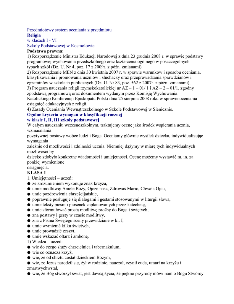 Przedmiotowy system oceniania z przedmiotu Religia w klasach I