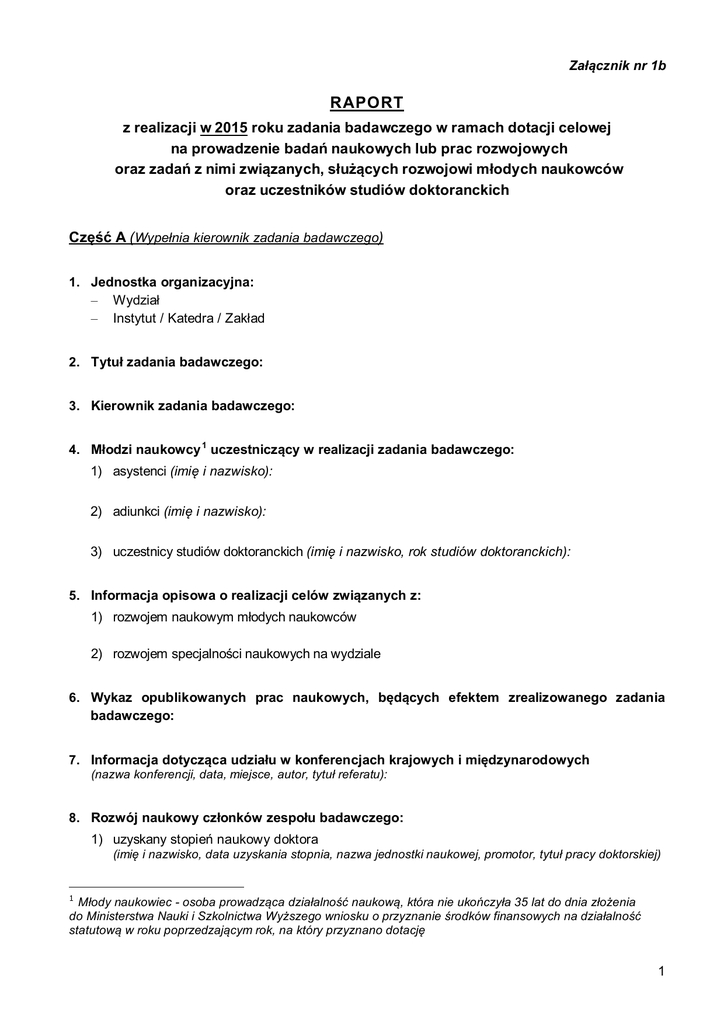 Załącznik nr 1b RAPORT z realizacji w 2015 roku zadania badawczego w ramach dotacji celowej na prowadzenie badań naukowych lub prac rozwojowych oraz zadań z nimi związanych, służących rozwojowi młodych naukowców oraz uczestników studiów doktoranckich Część A (Wypełnia kierownik zadania badawczego) 1. Jednostka organizacyjna: – Wydział – Instytut / Katedra / Zakład 2. Tytuł zadania badawczego: 3. Kierownik zadania badawczego: 4. Młodzi naukowcy 1 uczestniczący w realizacji zadania badawczego: 1) asystenci (imię i nazwisko): 2) adiunkci (imię i nazwisko): 3) uczestnicy studiów doktoranckich (imię i nazwisko, rok studiów doktoranckich): 5. Informacja opisowa o realizacji celów związanych z: 1) rozwojem naukowym młodych naukowców 2) rozwojem specjalności naukowych na wydziale 6. Wykaz opublikowanych prac naukowych, będących efektem zrealizowanego zadania badawczego: 7. Informacja dotycząca udziału w konferencjach krajowych i międzynarodowych (nazwa konferencji, data, miejsce, autor, tytuł referatu): 8. Rozwój naukowy członków zespołu badawczego: 1) uzyskany stopień naukowy doktora (imię i nazwisko, data uzyskania stopnia, nazwa jednostki naukowej, promotor, tytuł pracy doktorskiej) 1 Młody naukowiec - osoba prowadząca działalność naukową, która nie ukończyła 35 lat do dnia złożenia do Ministerstwa Nauki i Szkolnictwa Wyższego wniosku o przyznanie środków finansowych na działalność statutową w roku poprzedzającym rok, na który przyznano dotację 1 2) otwarte przewody doktorskie (imię i nazwisko, data otwarcia przewodu, nazwa jednostki naukowej, promotor, tytuł pracy doktorskiej) 3) uzyskany stopień naukowy doktora habilitowanego (imię i nazwisko, data uzyskania stopnia, nazwa jednostki naukowej) 4) zaawansowane habilitacje (imię i nazwisko, nazwa jednostki naukowej, planowany termin wszczęcia procedury habilitacyjnej) ................................................................................................................. Kierownik zadania badawczego /podpis/ ................................................................................................................. Dyrektor Instytutu lub Kierownik Katedry / Kierownik Zakładu /podpis i pieczęć/ Część B (Wypełnia Wydziałowa Komisja ds. Badań Naukowych) 9. Badania zostały wykonane zgodnie z wnioskiem: tak nie uwagi: 10. Ocena wyników badań: praca o ważnym znaczeniu dla nauki 2 praca użyteczna dla praktyki gospodarczej lub kultury narodowej przygotowanie stanowiska badawczego opracowanie nowej metody badawczej praca porządkująca (popularyzująca) dotychczasowy stan wiedzy praca stanowiąca przyczynek do dalszych badań uwagi: 11. Decyzja Wydziałowej Komisji ds. Badań Naukowych o przyjęciu zadania badawczego: zadanie badawcze przyjęte zadanie badawcze przyjęte z uwagami uwagi: zadanie badawcze odrzucone powody odrzucenia zadania: Podpisy Wydziałowej Komisji ds. Badań Naukowych 1. ……….....…..…………………..…….…….......………..…. (imię i nazwisko, tytuł / stopień naukowy) 2. ……….....…..…………………..…….…….......………..…. (imię i nazwisko, tytuł / stopień naukowy) 3. ……….....…..…………………..…….…….......………..…. (imię i nazwisko, tytuł / stopień naukowy) 4. ……….....…..…………………..…….…….......………..…. (imię i nazwisko tytuł / stopień naukowy) …...……………….…..…..... (podpis) …...……………….…..…..... (podpis) …...……………….…..…..... (podpis) …...……………….…..…..... (podpis) Zielona Góra, dnia …...……………….…..…..... 3 Część C (Akceptacja Dziekana Wydziału) Akceptuję ................................................................................................................. Dziekan /podpis i pieczęć/ 4