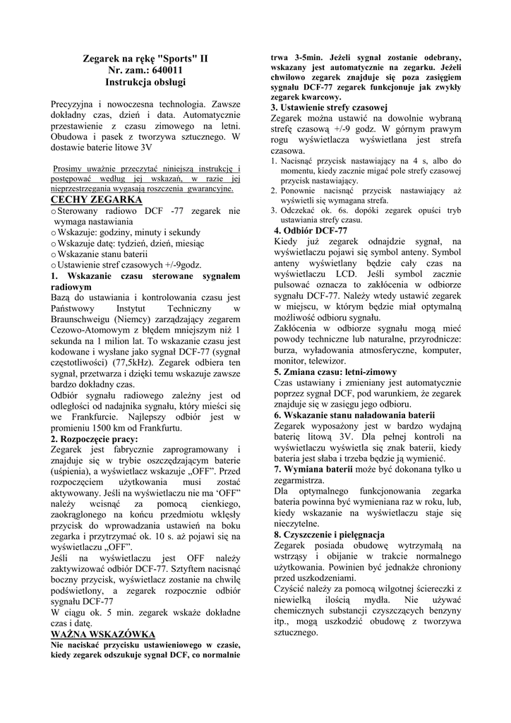 Zegarek na rękę "Sports" II Nr. zam.: 640011 Instrukcja obsługi Precyzyjna i nowoczesna technologia. Zawsze dokładny czas, dzień i data. Automatycznie przestawienie z czasu zimowego na letni. Obudowa i pasek z tworzywa sztucznego. W dostawie baterie litowe 3V Prosimy uważnie przeczytać niniejszą instrukcję i postępować według jej wskazań, w razie jej nieprzestrzegania wygasają roszczenia gwarancyjne. CECHY ZEGARKA o Sterowany radiowo DCF -77 zegarek nie wymaga nastawiania o Wskazuje: godziny, minuty i sekundy o Wskazuje datę: tydzień, dzień, miesiąc o Wskazanie stanu baterii o Ustawienie stref czasowych +/-9godz. 1. Wskazanie czasu sterowane sygnałem radiowym Bazą do ustawiania i kontrolowania czasu jest Państwowy Instytut Techniczny w Braunschweigu (Niemcy) zarządzający zegarem Cezowo-Atomowym z błędem mniejszym niż 1 sekunda na 1 milion lat. To wskazanie czasu jest kodowane i wysłane jako sygnał DCF-77 (sygnał częstotliwości) (77,5kHz). Zegarek odbiera ten sygnał, przetwarza i dzięki temu wskazuje zawsze bardzo dokładny czas. Odbiór sygnału radiowego zależny jest od odległości od nadajnika sygnału, który mieści się we Frankfurcie. Najlepszy odbiór jest w promieniu 1500 km od Frankfurtu. 2. Rozpoczęcie pracy: Zegarek jest fabrycznie zaprogramowany i znajduje się w trybie oszczędzającym baterie (uśpienia), a wyświetlacz wskazuje „OFF”. Przed rozpoczęciem użytkowania musi zostać aktywowany. Jeśli na wyświetlaczu nie ma ‘OFF” należy wcisnąć za pomocą cienkiego, zaokrąglonego na końcu przedmiotu wklęsły przycisk do wprowadzania ustawień na boku zegarka i przytrzymać ok. 10 s. aż pojawi się na wyświetlaczu „OFF”. Jeśli na wyświetlaczu jest OFF należy zaktywizować odbiór DCF-77. Sztyftem nacisnąć boczny przycisk, wyświetlacz zostanie na chwilę podświetlony, a zegarek rozpocznie odbiór sygnału DCF-77 W ciągu ok. 5 min. zegarek wskaże dokładne czas i datę. WAŻNA WSKAZÓWKA Nie naciskać przycisku ustawieniowego w czasie, kiedy zegarek odszukuje sygnał DCF, co normalnie trwa 3-5min. Jeżeli sygnał zostanie odebrany, wskazany jest automatycznie na zegarku. Jeżeli chwilowo zegarek znajduje się poza zasięgiem sygnału DCF-77 zegarek funkcjonuje jak zwykły zegarek kwarcowy. 3. Ustawienie strefy czasowej Zegarek można ustawić na dowolnie wybraną strefę czasową +/-9 godz. W górnym prawym rogu wyświetlacza wyświetlana jest strefa czasowa. 1. Nacisnąć przycisk nastawiający na 4 s, albo do momentu, kiedy zacznie migać pole strefy czasowej przycisk nastawiający. 2. Ponownie nacisnąć przycisk nastawiający aż wyświetli się wymagana strefa. 3. Odczekać ok. 6s. dopóki zegarek opuści tryb ustawiania strefy czasu. 4. Odbiór DCF-77 Kiedy już zegarek odnajdzie sygnał, na wyświetlaczu pojawi się symbol anteny. Symbol anteny wyświetlany będzie cały czas na wyświetlaczu LCD. Jeśli symbol zacznie pulsować oznacza to zakłócenia w odbiorze sygnału DCF-77. Należy wtedy ustawić zegarek w miejscu, w którym będzie miał optymalną możliwość odbioru sygnału. Zakłócenia w odbiorze sygnału mogą mieć powody techniczne lub naturalne, przyrodnicze: burza, wyładowania atmosferyczne, komputer, monitor, telewizor. 5. Zmiana czasu: letni-zimowy Czas ustawiany i zmieniany jest automatycznie poprzez sygnał DCF, pod warunkiem, że zegarek znajduje się w zasięgu jego odbioru. 6. Wskazanie stanu naładowania baterii Zegarek wyposażony jest w bardzo wydajną baterię litową 3V. Dla pełnej kontroli na wyświetlaczu wyświetla się znak baterii, kiedy bateria jest słaba i trzeba będzie ją wymienić. 7. Wymiana baterii może być dokonana tylko u zegarmistrza. Dla optymalnego funkcjonowania zegarka bateria powinna być wymieniana raz w roku, lub, kiedy wskazanie na wyświetlaczu staje się nieczytelne. 8. Czyszczenie i pielęgnacja Zegarek posiada obudowę wytrzymałą na wstrząsy i obijanie w trakcie normalnego użytkowania. Powinien być jednakże chroniony przed uszkodzeniami. Czyścić należy za pomocą wilgotnej ściereczki z niewielką ilością mydła. Nie używać chemicznych substancji czyszczących benzyny itp., mogą uszkodzić obudowę z tworzywa sztucznego.