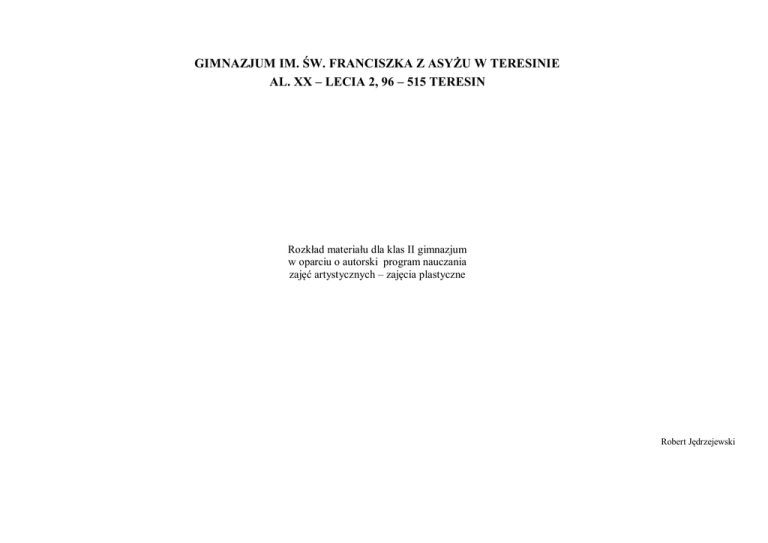 GIMNAZJUM IM. ŚW. FRANCISZKA Z ASYŻU W TERESINIE AL. XX – LECIA 2, 96 – 515 TERESIN Rozkład materiału dla klas II gimnazjum w oparciu o autorski program nauczania zajęć artystycznych – zajęcia plastyczne Robert Jędrzejewski PODSTAWA PROGRAMOWA ZAJĘCIA ARTYSTYCZNE ZAJĘCIA PLASTYCZNE III etap edukacyjny I. Odbiór wypowiedzi i wykorzystanie zawartych w nich informacji – percepcja sztuki. II. Tworzenie wypowiedzi – ekspresja przez sztukę. III. Analiza i interpretacja tekstów kultury – recepcja sztuki. ROZKŁAD MATERIAŁU NAUCZANIA – ZAJĘCIA ARTYSTYCZNE ZAJĘCIA PLASTYCZNE III etap edukacyjny dla klasy II Lp. Tematyka zajęć Zagadnienia programowe i treści szczegółowe Problemy plastyczne i środki realizacji Umiejętności Wymagania podstawowe 1 2 3 1. Zapoznanie z programem nauczania i kryteriami oceniania. Zrozumienie wzajemnych oczekiwań i zobowiązań w wymiarach nauczyciel, klasa, uczeń. 2– 3. Zaczarowane wakacje – praca plastyczna. Kompozycje malarskie 4 Techniki pracy plastycznej Uwagi 6 7 ponadpodstawowe 5 Pogadanka. Uczeń wykonuje Uczeń wykonuje rysunek z zastosowaniem określonej gamy barwnej, Ujęcie ekspresyjne. prace na miarę prace samodzielnie na kredkami, blok przestrzeni, ekspresji. swoich lekcjach, A3. możliwości; estetycznie. starannie, przynosi przybory na zajęcia. 45. Wojna liter z alfabetu. „Abecadło” – Julian Tuwim. Swobodne kompozycje malarskie z zastosowaniem określonej gamy barwnej, iluzji, przestrzeni, ekspresji. 67. Plakat ekologiczny św. Franciszek z Asyżu patron ekologii. 89. Kosz z warzywami – szkice węglem. Statyka i dynamika w kompozycji plastycznej (barwy i kierunki). Uczeń wykonuje prace na miarę swoich możliwości; przynosi przybory na zajęcia. Uczeń wykonuje prace samodzielnie na lekcjach, starannie, estetycznie. Farby plakatowe, blok A3. Uczeń potrafi wykonać plakat Potrafi wycinać wzdłuż linii. nożyczki, blok techniczny. Zadanie pracy domowej. (kredki świecowe, blok A3) 1214. Wykonanie dekoracji świątecznej. Projektowanie i wykonywanie Przypinanie na gazetce gotowych Uczeń przestrzennych elementów elementów. wykonać dekoracyjnych. w potrafi Papieroplastyka pracę Gotowe elementy technice dekoracji, szpilki, papieroplastyki. pinezki. Zachowuje porządek podczas pracy, dokładnie wypełnia polecenia nauczyciela. 1516. Pałac Królowej Śniegu – praca plastyczna. Inspiracja fr. tekstu J. Ch. Andersena – Uczeń potrafi Uczeń stosuje Percepcja, farby panorama. wykonać pracę perspektywę akwarelowe, blok inspirowaną powietrzną. A3. tekstem literackim. 1718. Drzewo w porach roku. (wyrażenie w kompozycji abstrakcji inspirowanej muzyką „Poranek” E. Grieg) Interpretacja plastyczna utworu Ekspresyjne ujęcie tematu. Wartości Uczeń próbuje Uczeń potrafi Farby plakatowe, F. Schuberta pt. „Lipa”. wyrazowe gamy barwnej (barwy dokonać dokonać plastycznej blok A4. ciepłe, czyste, złamane). plastycznej interpretacji dzieła interpretacji muzycznego. dzieła muzycznego. 1920. Martwa natura. Martwa natura – interpretacja przestrzeni. Operowanie światłem i kolorem dla Uczeń stosuje Uczeń potrafi Farby plakatowe oddania wrażeń. Barwy czyste. Uczeń barwy czyste. analizować na barwnym kompozycję martwej (jednolitym) tle, natury. ustawiona martwa stosuje barwy czyste. natura. 2122. Wariacje nt. jajka. 2324. Witraż – siła światła i koloru. 2527. Bohater animowany – malowanie na płótnie. Malowanie na płótnie. 2829. Drzewo „jest groźne”. Fantastyczny las – ujęcie ekspresyjne. Rozbudzanie wyobraźni. Udział w konkursie. płótno, farby Statyka i dynamika w kompozycji Uczeń zna Kolaż, współpraca plastycznej. Faktura – utrwalenie pojęcie statyka w grupie. wiedzy o różnych rodzajach faktur. i dynamika. Utrwala wiedzę o różnych rodzajach faktur. 30. Ocena pracy uczniów w II semestrze. Przypomnienie kryteriów oceniania. Ocena pracy uczniów na lekcji. Wystawienie ocen. WSO i PSO Pozostałe godziny mogą być wykorzystane według uznania nauczyciela na dekoracje i prace okolicznościowe, ilustrowanie wrażeń z wycieczek, imprez, udział w konkursach szkolnych i pozaszkolnych itp. Tematyka zajęć, dobór metod, czas trwania i realizacji modyfikowane według potrzeb ze względu na możliwości i umiejętności uczniów oraz dostępne środki i materiały.