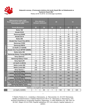 Załącznik cenowy „Promocyjne telefony dla taryfy Heyah Mix na Doładowania w Systemie Heyah Mix” Ważny od 04.12.2013r. do chwili jego wycofania. Maksymalna liczba Cykli Rozliczeniowych dla spełnienia Zobowiązania DDK: Zestaw Model Telefonu Kwota Minimalna 24 w ofercie z tańszym telefonem 24 12 50 30 50 30 50 30 Nokia 100 1 1 1 1 1 1 Alcatel 20.05 1 1 1 1 1 69 Samsung E2600 1 1 1 1 49 129 Alcatel 20.10 1 1 1 29 69 169 Nokia 206 1 19 1 89 129 349 Alcatel One Touch Fire (4012) 1 29 1 129 249 449 Samsung C3350 1 89 1 129 249 449 Samsung S5610 1 99 1 149 249 449 LG Swift L3 II (E430) 1 69 1 149 199 329 Alcatel One Touch M’POP (5020D) 1 99 1 199 299 499 Nokia Asha 302 1 129 1 199 299 499 Samsung Galaxy Young (S6310N) 1 149 49 249 349 549 Sony Xperia E 1 249 149 419 489 689 Samsung Galaxy Trend 1 249 169 389 499 689 Sony Xperia M 149 419 349 649 749 949 LG Swift L5 (E610) 29 229 189 429 499 699 Nokia Lumia 520 69 299 249 449 549 729 Nokia Lumia 625 249 519 449 749 849 1049 749 849 1049 1 49 129 129 249 449 149 249 449 249 349 549 389 499 689 149 199 329 Sony Xperia J 249 569 449 Samsung E2600 1 1 1 + zestaw słuchawkowy Samsung Samsung C3350 1 89 1 + zestaw słuchawkowy Samsung Samsung S5610 1 99 1 + zestaw słuchawkowy Samsung Samsung Galaxy Young (S6310N) 1 149 49 + zestaw słuchawkowy Samsung Samsung Galaxy Trend 1 249 169 + zestaw słuchawkowy Samsung Telefony o szczególnie ograniczonej dostępności: LG Swift L3 (E400) 1 69 1 1 T-Mobile Polska S.A. z siedzibą w Warszawie, ul. Marynarska 12, 02-674 Warszawa. Spółka zarejestrowana w Sądzie Rejonowym dla m.st. Warszawy w Warszawie, XIII Wydział Gospodarczy Krajowego Rejestru Sądowego, nr KRS 0000391193, NIP 526-1040-567, Regon 011417295, Kapitał zakładowy 471 mln złotych, kapitał wpłacony w całości. Samsung C3520 1 1 1 1 49 199 Nokia Asha 203 1 1 1 1 69 249 Sony Xperia tipo (ST21i) 1 119 89 279 299 499 Samsung Galaxy mini 2 1 179 49 329 349 549 Samsung Galaxy Y (S5360) 1 1 1 129 149 349 Opłata za telefony podana jest w złotych i zawiera podatek VAT. 2 T-Mobile Polska S.A. z siedzibą w Warszawie, ul. Marynarska 12, 02-674 Warszawa. Spółka zarejestrowana w Sądzie Rejonowym dla m.st. Warszawy w Warszawie, XIII Wydział Gospodarczy Krajowego Rejestru Sądowego, nr KRS 0000391193, NIP 526-1040-567, Regon 011417295, Kapitał zakładowy 471 mln złotych, kapitał wpłacony w całości.