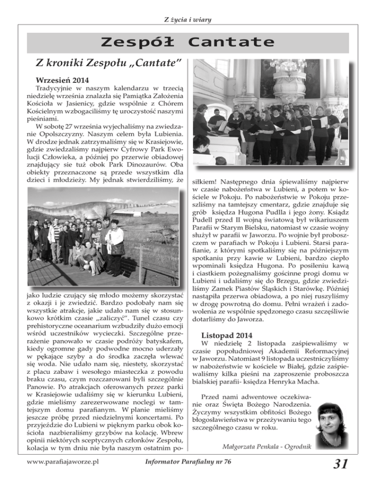 Z życia i wiary Zespół Cantate Z kroniki Zespołu „Cantate” Wrzesień 2014 Tradycyjnie w naszym kalendarzu w trzecią niedzielę września znalazła się Pamiątka Założenia Kościoła w Jasienicy, gdzie wspólnie z Chórem Kościelnym wzbogaciliśmy tę uroczystość naszymi pieśniami. W sobotę 27 września wyjechaliśmy na zwiedzanie Opolszczyzny. Naszym celem była Lubienia. W drodze jednak zatrzymaliśmy się w Krasiejowie, gdzie zwiedzaliśmy najpierw Cyfrowy Park Ewolucji Człowieka, a później po przerwie obiadowej znajdujący sie tuż obok Park Dinozaurów. Oba obiekty przeznaczone są przede wszystkim dla dzieci i młodzieży. My jednak stwierdziliśmy, że jako ludzie czujący się młodo możemy skorzystać z okazji i je zwiedzić. Bardzo podobały nam się wszystkie atrakcje, jakie udało nam się w stosunkowo krótkim czasie „zaliczyć”. Tunel czasu czy prehistoryczne oceanarium wzbudziły dużo emocji wśród uczestników wycieczki. Szczególne przerażenie panowało w czasie podróży batyskafem, kiedy ogromne gady podwodne mocno uderzały w pękające szyby a do środka zaczęła wlewać się woda. Nie udało nam się, niestety, skorzystać z placu zabaw i wesołego miasteczka z powodu braku czasu, czym rozczarowani byli szczególnie Panowie. Po atrakcjach oferowanych przez parki w Krasiejowie udaliśmy się w kierunku Lubieni, gdzie mieliśmy zarezerwowane noclegi w tamtejszym domu parafianym. W planie mieliśmy jeszcze próbę przed niedzielnymi koncertami. Po przyjeździe do Lubieni w pięknym parku obok kościoła nazbieraliśmy grzybów na kolację. Wbrew opinii niektórych sceptycznych członków Zespołu, kolacja w tym dniu nie była naszym ostatnim powww.parafiajaworze.pl siłkiem! Następnego dnia śpiewaliśmy najpierw w czasie nabożeństwa w Lubieni, a potem w kościele w Pokoju. Po nabożeństwie w Pokoju przeszliśmy na tamtejszy cmentarz, gdzie znajduje się grób księdza Hugona Pudlla i jego żony. Ksiądz Pudell przed II wojną światową był wikariuszem Parafii w Starym Bielsku, natomiast w czasie wojny służył w parafii w Jaworzu. Po wojnie był proboszczem w parafiach w Pokoju i Lubieni. Starsi parafianie, z którymi spotkaliśmy się na późniejszym spotkaniu przy kawie w Lubieni, bardzo ciepło wpominali księdza Hugona. Po posileniu kawą i ciastkiem pożegnaliśmy gościnne progi domu w Lubieni i udaliśmy się do Brzegu, gdzie zwiedziliśmy Zamek Piastów Śląskich i Starówkę. Później nastąpiła przerwa obiadowa, a po niej ruszyliśmy w drogę powrotną do domu. Pełni wrażeń i zadowolenia ze wspólnie spędzonego czasu szczęśliwie dotarliśmy do Jaworza. Listopad 2014 W niedzielę 2 listopada zaśpiewaliśmy w czasie popołudniowej Akademii Reformacyjnej w Jaworzu. Natomiast 9 listopada uczestniczyliśmy w nabożeństwie w kościele w Białej, gdzie zaśpiewaliśmy kilka pieśni na zaproszenie proboszcza bialskiej parafii- księdza Henryka Macha. Przed nami adwentowe oczekiwanie oraz Święta Bożego Narodzenia. Życzymy wszystkim obfitości Bożego błogosławieństwa w przeżywaniu tego szczególnego czasu w roku. Małgorzata Penkala - Ogrodnik Informator Parafialny nr 76 31