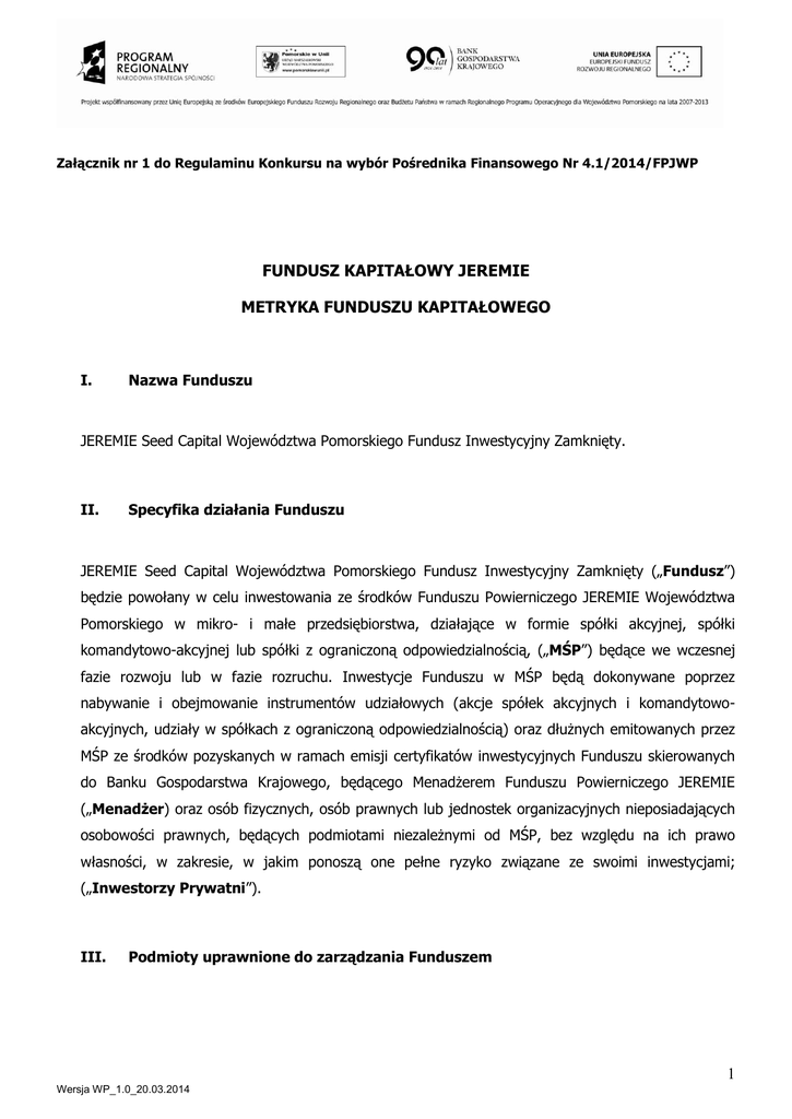 Załącznik nr 1 do Regulaminu Konkursu na wybór Pośrednika Finansowego Nr 4.1/2014/FPJWP FUNDUSZ KAPITAŁOWY JEREMIE METRYKA FUNDUSZU KAPITAŁOWEGO I. Nazwa Funduszu JEREMIE Seed Capital Województwa Pomorskiego Fundusz Inwestycyjny Zamknięty. II. Specyfika działania Funduszu JEREMIE Seed Capital Województwa Pomorskiego Fundusz Inwestycyjny Zamknięty („Fundusz”) będzie powołany w celu inwestowania ze środków Funduszu Powierniczego JEREMIE Województwa Pomorskiego w mikro- i małe przedsiębiorstwa, działające w formie spółki akcyjnej, spółki komandytowo-akcyjnej lub spółki z ograniczoną odpowiedzialnością, („MŚP”) będące we wczesnej fazie rozwoju lub w fazie rozruchu. Inwestycje Funduszu w MŚP będą dokonywane poprzez nabywanie i obejmowanie instrumentów udziałowych (akcje spółek akcyjnych i komandytowoakcyjnych, udziały w spółkach z ograniczoną odpowiedzialnością) oraz dłużnych emitowanych przez MŚP ze środków pozyskanych w ramach emisji certyfikatów inwestycyjnych Funduszu skierowanych do Banku Gospodarstwa Krajowego, będącego Menadżerem Funduszu Powierniczego JEREMIE („Menadżer) oraz osób fizycznych, osób prawnych lub jednostek organizacyjnych nieposiadających osobowości prawnych, będących podmiotami niezależnymi od MŚP, bez względu na ich prawo własności, w zakresie, w jakim ponoszą one pełne ryzyko związane ze swoimi inwestycjami; („Inwestorzy Prywatni”). III. Podmioty uprawnione do zarządzania Funduszem 1 Wersja WP_1.0_20.03.2014 1. Podmiot, który utworzy Fundusz i będzie zarządzał Funduszem („Pośrednik Finansowy”) zostanie wybrany w drodze konkursu („Konkurs”) na podstawie zasad ustalonych w regulaminie konkursu przez Menadżera. Dopuszcza się wybranie większej liczby Pośredników Finansowych – w takim przypadku każdy wybrany w ramach Konkursu Pośrednik Finansowy będzie zobowiązany do utworzenia jednego Funduszu. 2. Podmiotami uprawnionymi do udziału w konkursie są: 1) towarzystwa funduszy inwestycyjnych w rozumieniu ustawy z dnia 27 maja 2004 r. o funduszach inwestycyjnych (Dz. U. z 2004 r., Nr 146, poz. 1546, z późn. zm.), („Ustawa o funduszach”); 2) podmioty, którym towarzystwo funduszy inwestycyjnych powierzyło lub zamierza powierzyć zarządzanie portfelem inwestycyjnym Funduszu na podstawie art. 45a ust. 1 w zw. z art. 46 ust. 3 Ustawy o funduszach, przy czym podmioty, o których mowa w pkt 2) powyżej mogą brać udział w Konkursie wyłącznie występując łącznie z towarzystwem funduszy inwestycyjnych, o którym mowa w pkt 1) powyżej. 3. Warunkiem uczestniczenia w konkursie jest spełnienie przez Pośrednika Finansowego łącznie następujących warunków: 1) prowadzenia albo zamiaru prowadzenia działalności na terenie województwa pomorskiego; 2) posiadania potencjału finansowego i kadrowego (1 doradca inwestycyjny, 2 pracowników z wykształceniem wyższym i doświadczeniem co najmniej 2 lata w instytucjach finansowych, w tym w szczególności w zakresie oceny projektów inwestycyjnych lub oceny ryzyka kredytowego) do prowadzenia działalności inwestycyjnej związanej z funkcjonowaniem Funduszu na terytorium województwa pomorskiego; 3) posiadania planu pozyskania Inwestorów Prywatnych, w tym zapewnienia na etapie składania wniosku konkursowego listów intencyjnych lub umów zawartych z Inwestorami Prywatnymi dotyczących wpłat w wysokości nie mniejszej niż 50% łącznej sumy, którą Pośrednik Finansowy zamierza pozyskać do Funduszu od Inwestorów Prywatnych; 4) dysponowania odpowiednimi standardami proceduralnymi oraz organizacyjnymi, w tym posiadania akceptowanych w sektorze finansowym metod oceny ryzyka oraz procedur i metod oceny projektów inwestycyjnych, jak też procedur i metod zarządzania konfliktem interesów. 4. W ramach oceny merytorycznej zgłoszeń konkursowych analizowane będą w szczególności: 1) doświadczenie Pośrednika Finansowego w zakresie dokonywania inwestycji w MŚP; 2 Wersja WP_1.0_20.03.2014 2) doświadczenie Pośrednika Finansowego w zakresie utworzenia i zarządzania przynajmniej jednym funduszem inwestycyjnym zamkniętym; 3) proponowany poziom kosztów funkcjonowania Funduszu, w tym wynagrodzenia Pośrednika Finansowego; 4) plan pozyskania wpłat od Inwestorów Prywatnych oraz ich wysokość, w tym wysokość środków, na którą opiewać będą przedstawione przez Pośrednika Finansowego wraz ze zgłoszeniem konkursowym umowy lub listy intencyjne z potencjalnymi Inwestorami Prywatnymi. 5. Z udziału w konkursie wyłączone są podmioty, które: 1) podlegają wykluczeniu z ubiegania się o dofinansowanie na podstawie art. 207 Ustawy z dnia 27 sierpnia 2009 r. o finansach publicznych (Dz. U. z 2009 r., nr 157, poz. 1240); 2) pozostają w toku likwidacji, postępowania upadłościowego, naprawczego lub pod zarządem komisarycznym; 3) zakładają udzielenie wsparcia przedsiębiorstwom zagrożonym w rozumieniu pkt 9-11 komunikatu Komisji Europejskiej w sprawie Wytycznych wspólnotowych dotyczących pomocy państwa w celu ratowania i restrukturyzacji zagrożonych przedsiębiorstw (Dz. Urz. UE C 244 z 01.10.2004 r.). IV. Opis mechanizmu wsparcia 1. Menedżer dokona wpłaty na certyfikaty inwestycyjne Funduszu ze środków Funduszu Powierniczego JEREMIE Województwa Pomorskiego Funduszowi na zasadach określonych w Statucie i umowie zawartej przez Menedżera z Pośrednikiem Finansowym, określającej prawa i obowiązki stron w zakresie procesu utworzenia i zarządzania Funduszem („Umowa”). 2. Pośrednik Finansowy będzie obowiązany do zarządzania Funduszem zgodnie z Wytycznymi Wspólnotowymi w sprawie pomocy państwa na wspieranie inwestycji kapitału podwyższonego ryzyka w małych i średnich przedsiębiorstwach (Dz.Urz.UE 2006/C 194/02), postanowieniami Umowy, Statutu oraz bezwzględnie obowiązującymi przepisami prawa, w tym w szczególności Ustawy o funduszach, na zasadach rynkowych. 3. Docelowa wartość akt