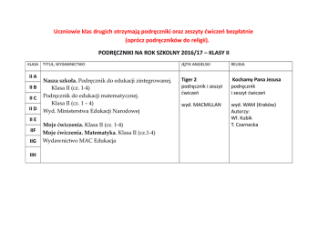Uczniowie klas drugich otrzymają podręczniki oraz zeszyty ćwiczeń bezpłatnie (oprócz podręczników do religii). PODRĘCZNIKI NA ROK SZKOLNY 2016/17 – KLASY II KLASA TYTUŁ, WYDAWNICTWO II A II B II C II D II E IIF IIG IIH Nasza szkoła. Podręcznik do edukacji zintegrowanej. Klasa II (cz. 1-4) Podręcznik do edukacji matematycznej. Klasa II (cz. 1 – 4) Wyd. Ministerstwa Edukacji Narodowej Moje ćwiczenia. Klasa II (cz. 1-4) Moje ćwiczenia. Matematyka. Klasa II (cz.1-4) Wydawnictwo MAC Edukacja JĘZYK ANGIELSKI RELIGIA Tiger 2 podręcznik i zeszyt ćwiczeń Kochamy Pana Jezusa podręcznik i zeszyt ćwiczeń wyd. MACMILLAN wyd. WAM (Kraków) Autorzy: Wł. Kubik T. Czarnecka