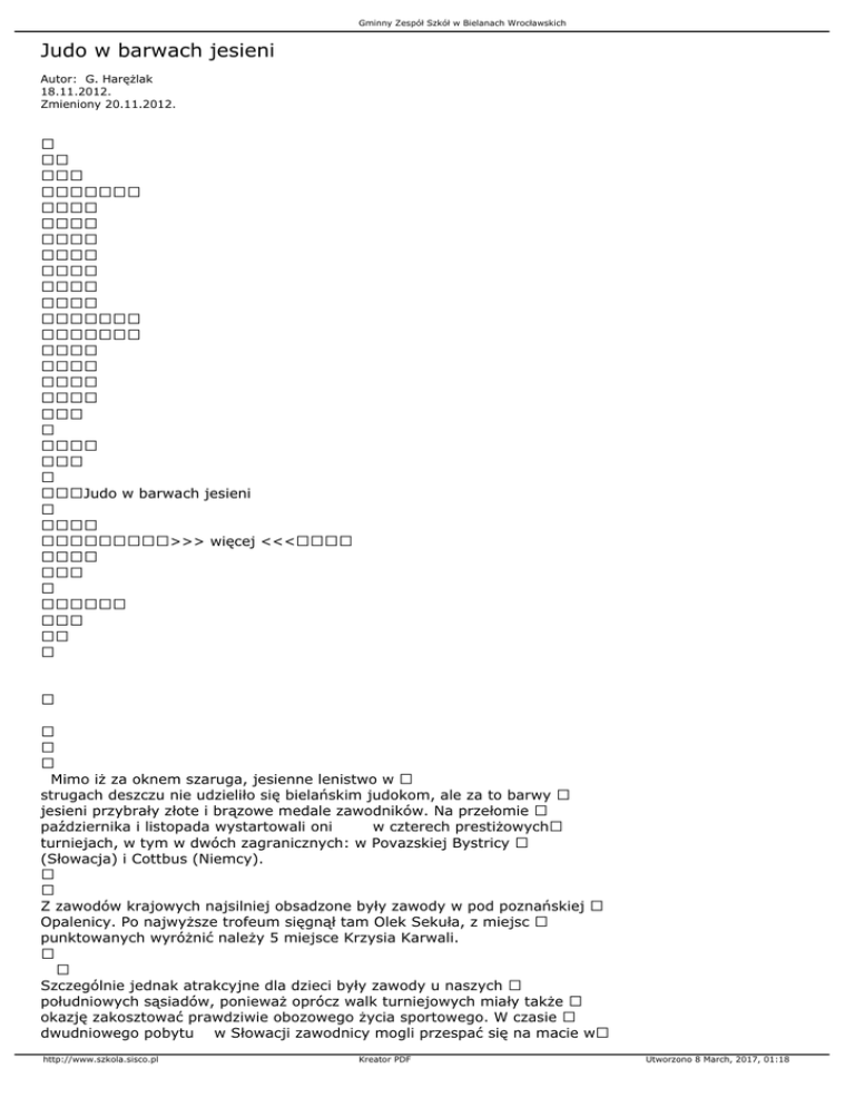 Gminny Zespół Szkół w Bielanach Wrocławskich Judo w barwach jesieni Autor: G. Harężlak 18.11.2012. Zmieniony 20.11.2012. Judo w barwach jesieni >>> więcej <<< Mimo iż za oknem szaruga, jesienne lenistwo w strugach deszczu nie udzieliło się bielańskim judokom, ale za to barwy jesieni przybrały złote i brązowe medale zawodników. Na przełomie października i listopada wystartowali oni w czterech prestiżowych turniejach, w tym w dwóch zagranicznych: w Povazskiej Bystricy (Słowacja) i Cottbus (Niemcy). Z zawodów krajowych najsilniej obsadzone były zawody w pod poznańskiej Opalenicy. Po najwyższe trofeum sięgnął tam Olek Sekuła, z miejsc punktowanych wyróżnić należy 5 miejsce Krzysia Karwali. Szczególnie jednak atrakcyjne dla dzieci były zawody u naszych południowych sąsiadów, ponieważ oprócz walk turniejowych miały także okazję zakosztować prawdziwie obozowego życia sportowego. W czasie dwudniowego pobytu w Słowacji zawodnicy mogli przespać się na macie w http://www.szkola.sisco.pl Kreator PDF Utworzono 8 March, 2017, 01:18 Gminny Zespół Szkół w Bielanach Wrocławskich hali sportowej , przyrządzić z trenerami posiłki w polowych warunkach i poczuć niepowtarzalną atmosferę wspólnej podróży. Najważniejsze pozostały oczywiście wyniki sportowe . Mimo, iż tym razem udało się przywieźć tylko jeden medal brązowy wywalczony przez Jakuba Saję, pozostałe także niezbyt odległe miejsca (m. in. 5 lokata Wiktora Byrki po bohatersko wygranych dwóch walkach) przyniosły wiele satysfakcji, a przede wszystkim bezcenne doświadczenia. Start w Niemczech medalowo przyniósł podobne wyniki (brązowy medal Wojtka Wargockiego), ale był dla nas lekcją techniki, woli walki i wyznaczył dalszy kierunek rozwoju. Na szczególną uwagę zasługują tu 4 wygrane w pięknym stylu walki jedynego medalisty Wojtka, który pochodzi z bardzo usportowionej rodziny. Brat Wojtka – Michał, multimedalista bielańskiej sekcji judo, stawiający także pierwsze kroki w turniejach tenisa ziemnego, zdobywający już pierwsze punkty rankingowe w tej dyscyplinie, za sprawą swoich sukcesów sportowych jest także laureatem Stypendium Sportowego Wójta Gminy Kobierzyce. Z sekcji judo tego zaszczytu sięgnął także Maciek Kuczer. Młodszemu z braci Wargockich – Wojtkowi życzymy dalszych sukcesów na tatami, a poczynania sportowe Michała będziemy wspierać, bez względu na to, którą z dyscyplin wybierze. Mimo intensywnej startowo jesieni w końcówce roku nie zamierzamy składać pasów. Już 25. listopada czeka na nas tatami w Świdnicy, a już od dziś rozpoczynamy odliczanie i przygotowania do III edycji Bielańskiego Turnieju Mikołajkowego Funny Judo, na który wszystkich sympatyków tego sportu serdecznie zapraszamy. Trener Grzegorz Harężlak http://www.szkola.sisco.pl Kreator PDF Utworzono 8 March, 2017, 01:18