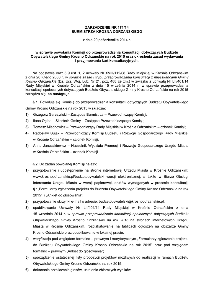 ZARZĄDZENIE NR 171/14 BURMISTRZA KROSNA ODRZAŃSKIEGO z dnia 29 października 2014 r. w sprawie powołania Komisji do przeprowadzenia konsultacji dotyczących Budżetu Obywatelskiego Gminy Krosno Odrzańskie na rok 2015 oraz określenia zasad wydawania i przyjmowania kart konsultacyjnych. Na podstawie oraz § 9 ust. 1, 2 uchwały Nr XVIII/112/08 Rady Miejskiej w Krośnie Odrzańskim z dnia 20 lutego 2008 r. w sprawie zasad i trybu przeprowadzania konsultacji z mieszkańcami Gminy Krosno Odrzańskie (Dz. Urz. Woj. Lub. Nr 21, poz. 488 ze zm.) w związku z uchwałą Nr LII/401/14 Rady Miejskiej w Krośnie Odrzańskim z dnia 15 września 2014 r. w sprawie przeprowadzenia konsultacji społecznych dotyczących Budżetu Obywatelskiego Gminy Krosno Odrzańskie na rok 2015 zarządza się, co następuje: § 1. Powołuje się Komisję do przeprowadzenia konsultacji dotyczących Budżetu Obywatelskiego Gminy Krosno Odrzańskie na rok 2015 w składzie: 1) Grzegorz Garczyński – Zastępca Burmistrza – Przewodniczący Komisji; 2) Ilona Ogiba – Skarbnik Gminy – Zastępca Przewodniczącego Komisji; 3) Tomasz Miechowicz – Przewodniczący Rady Miejskiej w Krośnie Odrzańskim – członek Komisji; 4) Radosław Sujak – Przewodniczący Komisji Budżetu i Rozwoju Gospodarczego Rady Miejskiej w Krośnie Odrzańskim – członek Komisji; 5) Anna Januszkiewicz – Naczelnik Wydziału Promocji i Rozwoju Gospodarczego Urzędu Miasta w Krośnie Odrzańskim – członek Komisji. § 2. Do zadań powołanej Komisji należy: 1) przygotowanie i udostępnienie na stronie internetowej Urzędu Miasta w Krośnie Odrzańskim: www.krosnoodrzanskie.pl/budzetobywatelski wersji elektronicznej, a także w Biurze Obsługi Interesanta Urzędu Miasta w wersji papierowej, druków wymaganych w procesie konsultacji, tj.: „Formularzy zgłoszenia projektu do Budżetu Obywatelskiego Gminy Krosno Odrzańskie na rok 2015” i „Ankiet do głosowania”; 2) przygotowanie skrzynki e-mail o adresie: [email protected]; 3) opublikowanie Uchwały Nr LII/401/14 Rady Miejskiej w Krośnie Odrzańskim z dnia 15 września 2014 r. w sprawie przeprowadzenia konsultacji społecznych dotyczących Budżetu Obywatelskiego Gminy Krosno Odrzańskie na rok 2015 na stronach internetowych Urzędu Miasta w Krośnie Odrzańskim, rozplakatowanie na tablicach ogłoszeń na obszarze Gminy Krosno Odrzańskie oraz opublikowanie w lokalnej prasie; 4) weryfikacja pod względem formalno – prawnym i merytorycznym „Formularzy zgłoszenia projektu do Budżetu Obywatelskiego Gminy Krosno Odrzańskie na rok 2015” oraz pod względem formalno – prawnym „Ankiet do głosowania”; 5) sporządzenie ostatecznej listy propozycji projektów możliwych do realizacji w ramach Budżetu Obywatelskiego Gminy Krosno Odrzańskie na rok 2015; 6) dokonanie przeliczenia głosów, ustalenie zbiorczych wyników; 7) sporządzenie protokołu z przeprowadzonych konsultacji oraz przekazanie go wraz z dokumentacją zgromadzoną podczas procesu konsultacji Burmistrzowi Krosna Odrzańskiego; 8) wykonywanie powierzonych obowiązków zgodnie z zasadami, o których mowa w § 3. § 3. Szczegółowe zasady zgłaszania i wyboru propozycji do „Budżetu Obywatelskiego Gminy Krosno Odrzańskie na rok 2015 oraz określenia zasad wydawania i przyjmowania kart konsultacyjnych” stanowią załącznik do niniejszego Zarządzenia. § 4. Wykonanie zarządzenia powierza się Skarbnikowi Gminy Krosno Odrzańskie. § 5. Zarządzenie wchodzi w życie z dniem podpisania. BURMISTRZ Marek Cebula Załącznik do Zarządzenia Nr 171/14 Burmistrza Krosna Odrzańskiego z dnia 29 października 2014 r. Zasady Budżetu Obywatelskiego Gminy Krosno Odrzańskie na rok 2015 oraz wydawania i przyjmowania kart konsultacyjnych Rozdział 1 Postanowienia Ogólne 1. Mając na celu zwiększenie udziału mieszkańców w projektowaniu lokalnych wydatków oraz chcąc pobudzić aktywność obywatelską i stworzyć warunki do rozwoju społeczeństwa obywatelskiego tworzy się w Gminie Krosno Odrzańskie tzw. Budżet Obywatelski. 2. Budżet Obywatelski należy rozumieć jako formę konsultacji społecznych w sprawie przeznaczenia części wydatków z ogólnego budżetu Gminy na wskazane przez mieszkańców propozycje zadań, które mieszczą się w kompetencji gminy. 3. Pula środków, jakie zostaną przeznaczone na realizację zadań z Budżetu Obywatelskiego Gminy Krosno Odrzańskie w roku 2015, zwanego dalej Budżetem Obywatelskim, wyniesie 360.000 zł (słownie: trzysta sześćdziesiąt tysięcy złotych). Rozdział 2 Zgłaszanie projektów 1. Propozycje projektów inwestycyjnych do zrealizowania w ramach Budżetu Obywatelskiego może zgłosić każdy mieszkaniec Gminy Krosno Odrzańskie posiadający czynne prawo wyborcze i wpisany do rejestru wyborców. 2. Proponowane projekty mogą dotyczyć realizacji zadań na terenach będących wyłączną własnością Gminy Krosno Odrzańskie oraz mieszczących się w kompetencjach Gminy. 3. Szacunkowy koszt realizacji pojedynczego zgłoszonego projektu nie może przekroczyć kwoty 72.000 zł (słownie: siedemdziesiąt dwa tysięcy złotych). 4. Jedna osoba może złożyć maksymalnie 3 propozycje zadania inwestycyjnego na Formularzu zgłoszenia projektu do Budżetu Obywatelskiego Gminy Krosno Odrzańskie na rok 2015 stanowiącym załącznik nr 1 do Uchwały Nr LII/401/14 Rady Miejskiej w Krośnie Odrzańskim z dnia 15 września 2014 r. w sprawie przeprowadzenia konsultacji społecznych dotyczących Budżetu Obywatelskiego Gminy Krosno Odrzańskie na rok 2015 zwanym dalej Formularzem. 5. Każda propozycja zadania powinna być złożona na odrębnym Formularzu. 6. Zgłaszane propozycje do Budżetu Obywatelskiego mogą mieć charakter wyłącznie inwestycyjny, a nie remontowy. 7. Celem zgłoszenia projektu należy wypełnić Formularz, który można pobrać ze strony internetowej Urzędu Miasta w Krośnie Odrzańskim www.krosnoodrzanskie.pl/budzetobywatelski, a także w wersji 