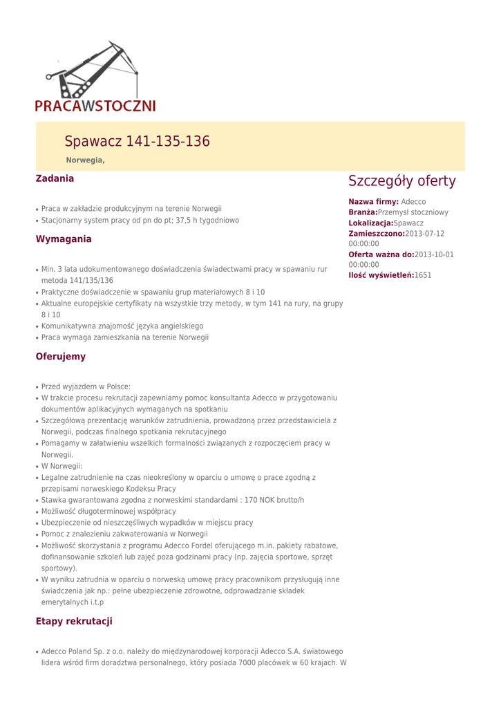 Spawacz 141-135-136 Norwegia, Zadania ● ● Praca w zakładzie produkcyjnym na terenie Norwegii Stacjonarny system pracy od pn do pt; 37,5 h tygodniowo Wymagania ● ● ● ● ● Min. 3 lata udokumentowanego doświadczenia świadectwami pracy w spawaniu rur metoda 141/135/136 Praktyczne doświadczenie w spawaniu grup materiałowych 8 i 10 Aktualne europejskie certyfikaty na wszystkie trzy metody, w tym 141 na rury, na grupy 8 i 10 Komunikatywna znajomość języka angielskiego Praca wymaga zamieszkania na terenie Norwegii Oferujemy ● ● ● ● ● ● ● ● ● ● ● ● Przed wyjazdem w Polsce: W trakcie procesu rekrutacji zapewniamy pomoc konsultanta Adecco w przygotowaniu dokumentów aplikacyjnych wymaganych na spotkaniu Szczegółową prezentację warunków zatrudnienia, prowadzoną przez przedstawiciela z Norwegii, podczas finalnego spotkania rekrutacyjnego Pomagamy w załatwieniu wszelkich formalności związanych z rozpoczęciem pracy w Norwegii. W Norwegii: Legalne zatrudnienie na czas nieokreślony w oparciu o umowę o prace zgodną z przepisami norweskiego Kodeksu Pracy Stawka gwarantowana zgodna z norweskimi standardami : 170 NOK brutto/h Możliwość długoterminowej współpracy Ubezpieczenie od nieszczęśliwych wypadków w miejscu pracy Pomoc z znalezieniu zakwaterowania w Norwegii Możliwość skorzystania z programu Adecco Fordel oferującego m.in. pakiety rabatowe, dofinansowanie szkoleń lub zajęć poza godzinami pracy (np. zajęcia sportowe, sprzęt sportowy). W wyniku zatrudnia w oparciu o norweską umowę pracy pracownikom przysługują inne świadczenia jak np.: pełne ubezpieczenie zdrowotne, odprowadzanie składek emerytalnych i.t.p Etapy rekrutacji ● Adecco Poland Sp. z o.o. należy do międzynarodowej korporacji Adecco S.A. światowego lidera wśród firm doradztwa personalnego, który posiada 7000 placówek w 60 krajach. W Szczegóły oferty Nazwa firmy: Adecco Branża:Przemysł stoczniowy Lokalizacja:Spawacz Zamieszczono:2013-07-12 00:00:00 Oferta ważna do:2013-10-01 00:00:00 Ilość wyświetleń:1651 ● ● Polsce działamy od 1994 roku. Swoją wiedzą i doświadczeniem służymy w ponad 50 lokalizacjach na terenie kraju. W 2007 roku pracę dzięki Adecco Poland znalazło ponad 34 000 osób. Adecco Poland Sp. z o.o. jest Agencją Pośrednictwa Pracy (numer wpisu do rejestru 364/1a oraz 364/1b), Agencją Doradztwa Personalnego (numer wpisu do rejestru 364/2) oraz Agencją Pracy Tymczasowej (numer wpisu do rejestru 364/3). Aktualnie prowadzimy dla naszego norweskiego klienta rekrutację na stanowisko : Spawacz 141/135/136