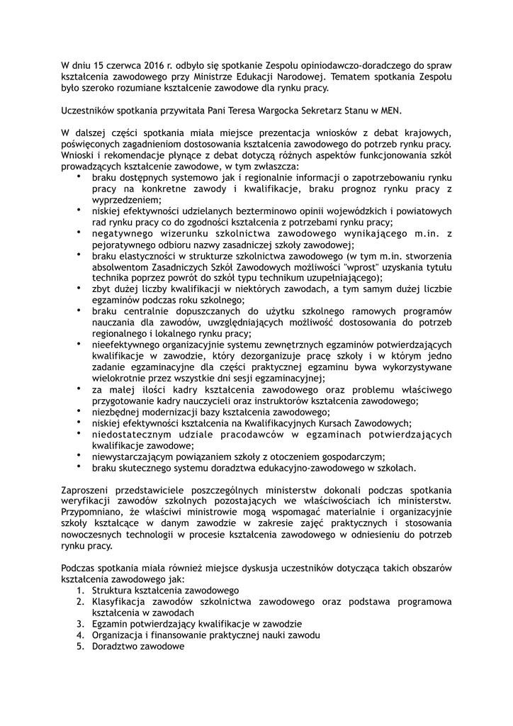 W dniu 15 czerwca 2016 r. odbyło się spotkanie Zespołu opiniodawczo-doradczego do spraw kształcenia zawodowego przy Ministrze Edukacji Narodowej. Tematem spotkania Zespołu było szeroko rozumiane kształcenie zawodowe dla rynku pracy. Uczestników spotkania przywitała Pani Teresa Wargocka Sekretarz Stanu w MEN. W dalszej części spotkania miała miejsce prezentacja wniosków z debat krajowych, poświęconych zagadnieniom dostosowania kształcenia zawodowego do potrzeb rynku pracy. Wnioski i rekomendacje płynące z debat dotyczą różnych aspektów funkcjonowania szkół prowadzących kształcenie zawodowe, w tym zwłaszcza: • braku dostępnych systemowo jak i regionalnie informacji o zapotrzebowaniu rynku pracy na konkretne zawody i kwalifikacje, braku prognoz rynku pracy z wyprzedzeniem; • niskiej efektywności udzielanych bezterminowo opinii wojewódzkich i powiatowych rad rynku pracy co do zgodności kształcenia z potrzebami rynku pracy; • negatywnego wizerunku szkolnictwa zawodowego wynikającego m.in. z pejoratywnego odbioru nazwy zasadniczej szkoły zawodowej; • braku elastyczności w strukturze szkolnictwa zawodowego (w tym m.in. stworzenia absolwentom Zasadniczych Szkół Zawodowych możliwości "wprost" uzyskania tytułu technika poprzez powrót do szkół typu technikum uzupełniającego); • zbyt dużej liczby kwalifikacji w niektórych zawodach, a tym samym dużej liczbie egzaminów podczas roku szkolnego; • braku centralnie dopuszczanych do użytku szkolnego ramowych programów nauczania dla zawodów, uwzględniających możliwość dostosowania do potrzeb regionalnego i lokalnego rynku pracy; • nieefektywnego organizacyjnie systemu zewnętrznych egzaminów potwierdzających kwalifikacje w zawodzie, który dezorganizuje pracę szkoły i w którym jedno zadanie egzaminacyjne dla części praktycznej egzaminu bywa wykorzystywane wielokrotnie przez wszystkie dni sesji egzaminacyjnej; • za małej ilości kadry kształcenia zawodowego oraz problemu właściwego przygotowanie kadry nauczycieli oraz instruktorów kształcenia zawodowego; • niezbędnej modernizacji bazy kształcenia zawodowego; • niskiej efektywności kształcenia na Kwalifikacyjnych Kursach Zawodowych; • niedostatecznym udziale pracodawców w egzaminach potwierdzających kwalifikacje zawodowe; • niewystarczającym powiązaniem szkoły z otoczeniem gospodarczym; • braku skutecznego systemu doradztwa edukacyjno-zawodowego w szkołach. Zaproszeni przedstawiciele poszczególnych ministerstw dokonali podczas spotkania weryfikacji zawodów szkolnych pozostających we właściwościach ich ministerstw. Przypomniano, że właściwi ministrowie mogą wspomagać materialnie i organizacyjnie szkoły kształcące w danym zawodzie w zakresie zajęć praktycznych i stosowania nowoczesnych technologii w procesie kształcenia zawodowego w odniesieniu do potrzeb rynku pracy. Podczas spotkania miała również miejsce dyskusja uczestników dotycząca takich obszarów kształcenia zawodowego jak: 1. Struktura kształcenia zawodowego 2. Klasyfikacja zawodów szkolnictwa zawodowego oraz podstawa programowa kształcenia w zawodach 3. Egzamin potwierdzający kwalifikacje w zawodzie 4. Organizacja i finansowanie praktycznej nauki zawodu 5. Doradztwo zawodowe W spotkaniu uczestniczyli: SŁAWOMIR WITTKOWICZ, BARBARA BELICKA, MIROSŁAW GÓRCZYŃSKI
