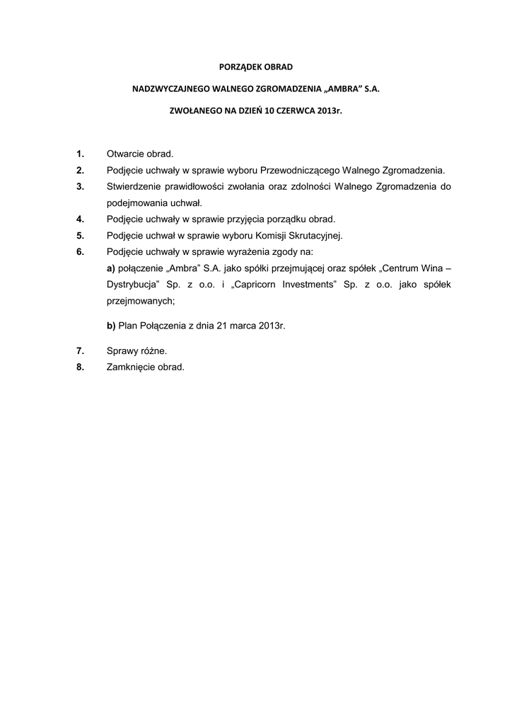 PORZĄDEK OBRAD NADZWYCZAJNEGO WALNEGO ZGROMADZENIA „AMBRA” S.A. ZWOŁANEGO NA DZIEŃ 10 CZERWCA 2013r. 1. Otwarcie obrad. 2. Podjęcie uchwały w sprawie wyboru Przewodniczącego Walnego Zgromadzenia. 3. Stwierdzenie prawidłowości zwołania oraz zdolności Walnego Zgromadzenia do podejmowania uchwał. 4. Podjęcie uchwały w sprawie przyjęcia porządku obrad. 5. Podjęcie uchwał w sprawie wyboru Komisji Skrutacyjnej. 6. Podjęcie uchwały w sprawie wyrażenia zgody na: a) połączenie „Ambra” S.A. jako spółki przejmującej oraz spółek „Centrum Wina – Dystrybucja” Sp. z o.o. i „Capricorn Investments” Sp. z o.o. jako spółek przejmowanych; b) Plan Połączenia z dnia 21 marca 2013r. 7. Sprawy różne. 8. Zamknięcie obrad.
