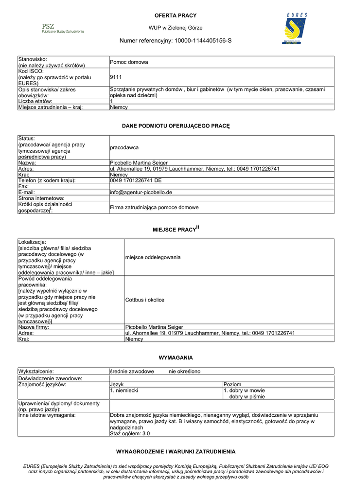 OFERTA PRACY WUP w Zielonej Górze Numer referencyjny: 10000-1144405156-S Stanowisko: (nie należy używać skrótów) Kod ISCO: (należy go sprawdzić w portalu EURES) Opis stanowiska/ zakres obowiązków: Liczba etatów: Miejsce zatrudnienia – kraj: Pomoc domowa 9111 Sprzątanie prywatnych domów , biur i gabinetów (w tym mycie okien, prasowanie, czasami opieka nad dziećmi) 1 Niemcy DANE PODMIOTU OFERUJĄCEGO PRACĘ Status: (pracodawca/ agencja pracy tymczasowej/ agencja pośrednictwa pracy) Nazwa: Adres: Kraj: Telefon (z kodem kraju): Fax: E-mail: Strona internetowa: Krótki opis działalności gospodarczeji: pracodawca Picobello Martina Seiger ul. Ahornallee 19, 01979 Lauchhammer, Niemcy, tel.: 0049 1701226741 Niemcy 0049 1701226741 DE [email protected] Firma zatrudniająca pomoce domowe MIEJSCE PRACYii Lokalizacja: [siedziba główna/ filia/ siedziba pracodawcy docelowego (w przypadku agencji pracy tymczasowej)/ miejsce oddelegowania pracownika/ inne – jakie] Powód oddelegowania pracownika: [należy wypełnić wyłącznie w przypadku gdy miejsce pracy nie jest główną siedzibą/ filią/ siedzibą pracodawcy docelowego (w przypadku agencji pracy tymczasowej)] Nazwa firmy: Adres: Kraj: miejsce oddelegowania Cottbus i okolice Picobello Martina Seiger ul. Ahornallee 19, 01979 Lauchhammer, Niemcy, tel.: 0049 1701226741 Niemcy WYMAGANIA Wykształcenie: Doświadczenie zawodowe: Znajomość języków: Uprawnienia/ dyplomy/ dokumenty (np. prawo jazdy): Inne istotne wymagania: średnie zawodowe Język 1. niemiecki nie określono Poziom 1. dobry w mowie dobry w piśmie Dobra znajomość języka niemieckiego, nienaganny wygląd, doświadczenie w sprzątaniu wymagane, prawo jazdy kat. B i własny samochód, elastyczność, gotowość do pracy w nadgodzinach Staż ogółem: 3.0 WYNAGRODZENIE I WARUNKI ZATRUDNIENIA EURES (Europejskie Służby Zatrudnienia) to sieć współpracy pomiędzy Komisją Europejską, Publicznymi Służbami Zatrudnienia krajów UE/ EOG oraz innych organizacji partnerskich, w celu dostarczania informacji, usług pośrednictwa pracy i poradnictwa zawodowego dla pracodawców i pracowników chcących skorzystać z zasady wolnego przepływu osób Wysokość pensji brutto: Wysokość pensji netto: Waluta, w jakiej wypłacana jest pensja: Rodzaj stawki wynagrodzenia: (godzinowa/ tygodniowa/ miesięczna/ roczna/ inna) Premie: Dodatkowe świadczenia (zakwaterowanie, wyżywienie, koszty związane ze zmianą miejsca zamieszkania, koszty podróży itp.): Nazwa firmy, z którą zostanie podpisana umowa: Rodzaj umowy: (umowa o pracę, umowa zlecenia, wolontariat, praktyka zawodowa/ staż, praca zdalna, agencja pracy tymczasowej, inne): Wymiar czasu pracy (praca na pełen etat/ część etatu): Czas trwania umowy: (nieokreślony/ określony) 8,70 0,00 Euro Liczba godzin tygodniowo: Zmiany i praca w dni wolne: Data rozpoczęcia: Inne informacje: 60,00 Praca na niepełny etat- 60 lub 80 godzin w miesiącu. 2016-06-20 Praca na niepełny etat- 60 lub 80 godzin w miesiącu. Czasowy ze stawką godzinową brak danych Pracodawca pomaga w znaleznieniu zakwaterowania. Picobello Martina Seiger umowa o pracę niepełny etat Data wygaśnięcia umowy (w przypadku umowy na czas określony): nieokreślony SPOSÓB SKŁADANIA WNIOSKU Wymagane dokumenty (list motywacyjny, CV itp.): Język, w którym muszą być sporządzone przedkładane dokumenty: Do kogo należy wysłać dokumenty: (do pracodawcy/ doradcy EURES) Gdzie należy wysłać dokumenty: (adres, adres e-mail, nr faksu z kodem kraju itp.) Dane teleadresowe doradcy EURES lub przedstawiciela pracodawcy: (nazwisko, adres, telefon, fax, e-mail itp.) CV ze zdjęciem niemiecki do pracodawcy preferowany kontakt telefoniczny 0049 1701226741 adres E-mail [email protected] DODATKOWE INFORMACJE Informacji w języku niemieckim udziela Pani Seiger 0049 1701226741 WAŻNOŚĆ 2016-06-14 Data publikacji: Termin przedkładania podań o pracę / zakończenia ważności oferty: Uprzejmie informujemy, że skontaktujemy się wyłącznie z wybranymi kandydatami. UWAGA: 1. Umowa z zagranicznym pracodawcą jest zawierana, co do zasady, zgodnie z prawem kraju zatrudnienia. Oznacza to, że wszystkie roszczenia odnośnie warunków, które obejmuje umowa, można kierować wyłącznie do odpowiedniego sądu w kraju zatrudnienia. Publiczne służby zatrudnienia (EURES) nie mogą pośredniczyć ani reprezentować pracownika w sądzie kraju zatrudnienia w przypadku sporu z pracodawcą. 2. Publiczne służby zatrudnienia (EURES) dokładają wszelkich starań, aby zapewnić rzetelność i wiarygodność ofert pracy zgłoszonych w lokalnym urzędzie pracy. Należy wyjaśnić, że oferta pracy została zgłoszona przez stronę trzecią i EURES nie odpowiada za ewentualne rozbieżności między warunkami pracy określonymi w ofercie pracy i warunkami oferowanymi przez potencjalnego pracodawcę. 3. Publiczne służby zatrudnienia (EURES) informują, że będą zbierać, przetwarzać i przekazywać potencjalnym pracodawcom zgodnie z przepisami dotyczącymi ochrony danych osobowych wszystkie dane osobowe dostarczone przez osoby poszukujące pracy. EURES (Europejskie Służby Zatrudnienia) to sieć współpracy pomiędzy Komisją Europejską, Publicznymi Służbami Zatrudnienia krajów UE/ EOG oraz innych organizacji partnerskich, w celu dostarczania informacji, usług pośrednictwa pracy i poradnictwa zawodowego dla pracodawców i pracowników chcących skorzystać z zasady wolnego przepływu osób iInformacje o firmie, takie jak: status prawny, sektor, typ działalności, rodzaj produktów lub świadczonych usług, data rozpoczęcia działalności gospodarczej, liczba pracowników itp. iiMiejsce, w którym będzie wykonywana praca. Należy wypełnić w przypadku gdy: 1) miejsce wykonywania pracy jest inne niż siedziba podmiotu oferującego pracę, 2) pracę oferuje agencja pośrednictwa pracy/ agencja pracy tymczasowej. EURES (Europejskie Służby Zatrudnienia) to sieć wspó