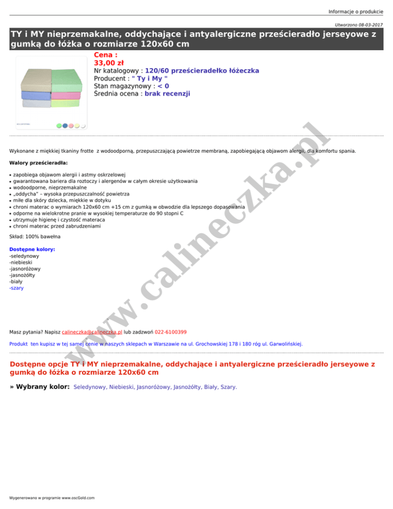 Informacje o produkcie Utworzono 08-03-2017 TY i MY nieprzemakalne, oddychające i antyalergiczne prześcieradło jerseyowe z gumką do łóżka o rozmiarze 120x60 cm Cena : 33,00 zł pl Nr katalogowy : 120/60 prześcieradełko łóżeczka Producent : " Ty i My " Stan magazynowy : < 0 Średnia ocena : brak recenzji Wykonane z miękkiej tkaniny frotte z wodoodporną, przepuszczającą powietrze membraną, zapobiegającą objawom alergii, dla komfortu spania. ● ● ● ● ● ● ● ● zapobiega objawom alergii i astmy oskrzelowej gwarantowana bariera dla roztoczy i alergenów w całym okresie użytkowania wodoodporne, nieprzemakalne „oddycha” – wysoka przepuszczalność powietrza miłe dla skóry dziecka, miękkie w dotyku chroni materac o wymiarach 120x60 cm +15 cm z gumką w obwodzie dla lepszego dopasowania odporne na wielokrotne pranie w wysokiej temperaturze do 90 stopni C utrzymuje higienę i czystość materaca chroni materac przed zabrudzeniami ec ● zk a. Walory prześcieradła: in Skład: 100% bawełna w .c al Dostępne kolory: -seledynowy -niebieski -jasnoróżowy -jasnożółty -biały -szary w Masz pytania? Napisz [email protected] lub zadzwoń 022-6100399 w Produkt ten kupisz w tej samej cenie w naszych sklepach w Warszawie na ul. Grochowskiej 178 i 180 róg ul. Garwolińskiej. Dostępne opcje TY i MY nieprzemakalne, oddychające i antyalergiczne prześcieradło jerseyowe z gumką do łóżka o rozmiarze 120x60 cm » Wybrany kolor: Seledynowy, Niebieski, Jasnoróżowy, Jasnożółty, Biały, Szary. Wygenerowano w programie www.oscGold.com