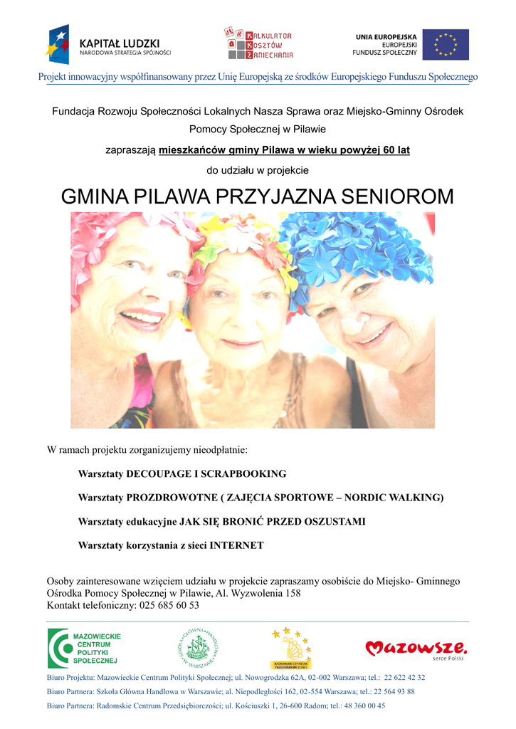 Projekt innowacyjny współfinansowany przez Unię Europejską ze środków Europejskiego Funduszu Społecznego Fundacja Rozwoju Społeczności Lokalnych Nasza Sprawa oraz Miejsko-Gminny Ośrodek Pomocy Społecznej w Pilawie zapraszają mieszkańców gminy Pilawa w wieku powyżej 60 lat do udziału w projekcie GMINA PILAWA PRZYJAZNA SENIOROM W ramach projektu zorganizujemy nieodpłatnie: Warsztaty DECOUPAGE I SCRAPBOOKING Warsztaty PROZDROWOTNE ( ZAJĘCIA SPORTOWE – NORDIC WALKING) Warsztaty edukacyjne JAK SIĘ BRONIĆ PRZED OSZUSTAMI Warsztaty korzystania z sieci INTERNET Osoby zainteresowane wzięciem udziału w projekcie zapraszamy osobiście do Miejsko- Gminnego Ośrodka Pomocy Społecznej w Pilawie, Al. Wyzwolenia 158 Kontakt telefoniczny: 025 685 60 53 Biuro Projektu: Mazowieckie Centrum Polityki Społecznej; ul. Nowogrodzka 62A, 02-002 Warszawa; tel.: 22 622 42 32 Biuro Partnera: Szkoła Główna Handlowa w Warszawie; al. Niepodległości 162, 02-554 Warszawa; tel.: 22 564 93 88 Biuro Partnera: Radomskie Centrum Przedsiębiorczości; ul. Kościuszki 1, 26-600 Radom; tel.: 48 360 00 45