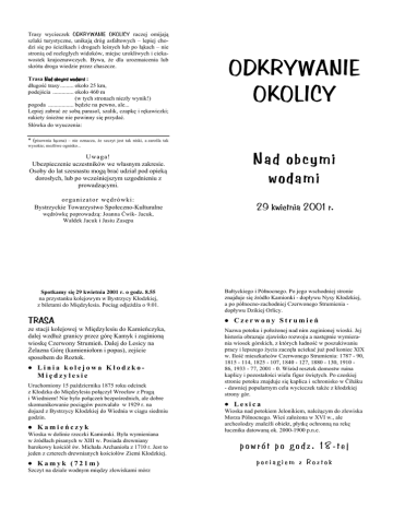 Trasy wycieczek ODKRYWANIE OKOLICY raczej omijają szlaki turystyczne, unikają dróg asfaltowych – lepiej chodzi się po ścieŜkach i drogach leśnych lub po łąkach – nie stronią od rozległych widoków, miejsc urokliwych i ciekawostek krajoznawczych. Bywa, Ŝe dla urozmaicenia lub skrótu droga wiedzie przez chaszcze. Trasa Nad obcymi wodami : długość trasy......... około 25 km, podejścia .............. około 460 m (w tych stronach niezły wynik!) pogoda ................. będzie na pewno, ale... Lepiej zabrać ze sobą parasol, szalik, czapkę i rękawiczki; rakiety śnieŜne nie powinny się przydać. Słówka do wyuczenia: ODKRYWANIE OKOLICY * (pisownia łączna) – nie oznacza, Ŝe szczyt jest tak niski, a zarośla tak wysokie; moŜliwe ognisko... Uwaga! Ubezpieczenie uczestników we własnym zakresie. Osoby do lat szesnastu mogą brać udział pod opieką dorosłych, lub po wcześniejszym uzgodnieniu z prowadzącymi. Nad obcymi wodami o r ganizato r węd r ó wki: Bystrzyckie Towarzystwo Społeczno-Kulturalne 29 kwietnia 2001 r. wędrówkę poprowadzą: Joanna Ćwik- Jacuk, Waldek Jacuk i Jasiu Zasępa Spotkamy się 29 kwietnia 2001 r. o godz. 8.55 na przystanku kolejowym w Bystrzycy Kłodzkiej, z biletami do Międzylesia. Pociąg odjeŜdŜa o 9.01. Bałtyckiego i Północnego. Po jego wschodniej stronie znajduje się źródło Kamionki - dopływu Nysy Kłodzkiej, a po północno-zachodniej Czerwonego Strumienia dopływu Dzikiej Orlicy. TRASA • Czerwony Strumień ze stacji kolejowej w Międzylesiu do Kamieńczyka, dalej wzdłuŜ granicy przez górę Kamyk i zaginioną wioskę Czerwony Strumień. Dalej do Lesicy na śelazna Górę (kamieniołom i popas), zejście sposobem do Roztok. Nazwa potoku i połoŜonej nad nim zaginionej wioski. Jej historia obrazuje zjawisko rozwoju a następnie wymierania wiosek górskich, z których ludność w poszukiwaniu pracy i lepszego Ŝycia zaczęła uciekać juŜ pod koniec XIX w. Ilość mieszkańców Czerwonego Strumienia: 1787 - 90, 1815 - 114, 1825 - 107, 1840 - 127, 1880 - 130, 1910 86, 1933 - 77, 2001 - 0. Wśród resztek domostw ruina kaplicy i pozostałości wielu figur świętych. Po czeskiej stronie potoku znajduje się kaplica i schronisko w Čiháku - dawniej popularnym celu wycieczek takŜe z kłodzkiej strony gór. • Linia kolejowa KłodzkoMiędzylesie Uruchomiony 15 października 1875 roku odcinek z Kłodzka do Międzylesia połączył Wrocław z Pragą i Wiedniem! Nie było połączeń bezpośrednich, ale dobre skomunikowanie pociągów pozwalało w 1929 r. na dojazd z Bystrzycy Kłodzkiej do Wiednia w ciągu siedmiu godzin. • Kamieńczyk Wioska w dolinie rzeczki Kamionki. Była wymieniana w źródłach pisanych w XIII w. Posiada drewniany barokowy kościół św. Michała Archanioła z 1710 r. Jest to jeden z czterech drewnianych kościołów Ziemi Kłodzkiej. • Kamyk (721m) Szczyt na dziale wodnym między zlewiskami mórz • Lesica Wioska nad potokiem Jelonikiem, naleŜącym do zlewiska Morza Pólnocnego. Wieś załoŜona w XVI w., ale archeolodzy znaleźli obiekt, płytkę ochronną na rekę łucznika datowaną ok. 2000-1900 p.n.e. powrót po godz. 18-tej pociagiem z Roztok
