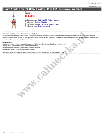 Informacje o produkcie Utworzono 08-03-2017 Bright Starts skoczek Baby Einstein BS60332 - huśtawka skacząca Cena : 199,00 zł 181,60 zł Nr katalogowy : BS 60332 Baby Hopser Producent : Bright Starts Stan magazynowy : brak w magazynie Średnia ocena : brak recenzji zk a. Główne cechy: Regulowany pasek połączony ze sprężyną zapewni dziecku mnóstwo atrakcji podczas podskakiwania Solidny zacisk zapewni bezpieczne mocowanie do drzwi Kontrast kolorów wspomaga rozwój zmysłu wzroku dziecka Dodatkowe zabawki wspomagające rozwój dziecka pl Rozpocznij przygodę z podwodnym światem Baby Einstein. Wszystkie dzieci uwielbiają podskakiwać, a dzięki dodatkowym zabawkom, żywym kolorom i wzorom ta zabawa będzie jeszcze bardziej atrakcyjna. Bezpieczne lustereczko zachęci do odkrywania własnego odbicia, gryzak w kształcie rozgwiazdy, grzechotka żółwik oraz karty z miękkiej i szeleszczącej tkaniny będą dodatkową atrakcją dla maluszka. w w w .c al in ec Skoczek przeznaczony dla dzieci samodzielnie siedzących (ok. 6 miesiąca) do maksymalnie 12kg. Wygenerowano w programie www.oscGold.com