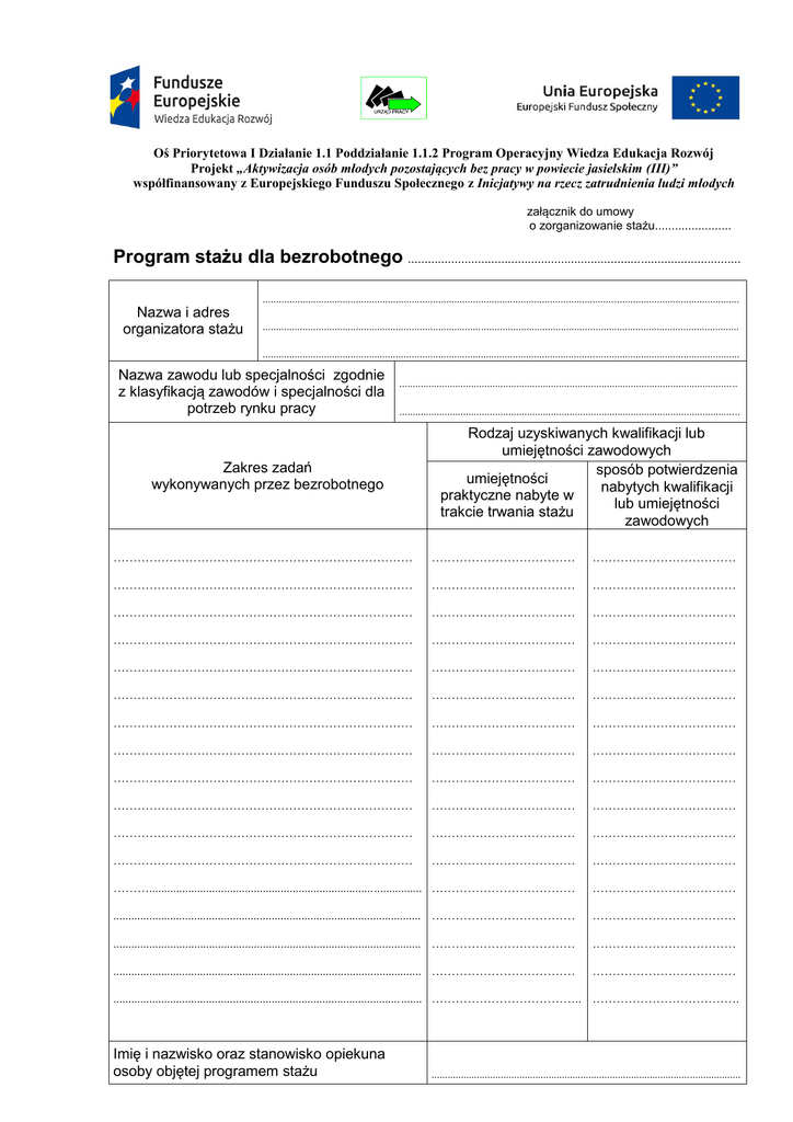 Oś Priorytetowa I Działanie 1.1 Poddziałanie 1.1.2 Program Operacyjny Wiedza Edukacja Rozwój Projekt „Aktywizacja osób młodych pozostających bez pracy w powiecie jasielskim (III)” współfinansowany z Europejskiego Funduszu Społecznego z Inicjatywy na rzecz zatrudnienia ludzi młodych załącznik do umowy o zorganizowanie stażu....................... Program stażu dla bezrobotnego .................................................................................................... ................................................................................................................................................................................... Nazwa i adres organizatora stażu ................................................................................................................................................................................... ................................................................................................................................................................................... Nazwa zawodu lub specjalności zgodnie z klasyfikacją zawodów i specjalności dla potrzeb rynku pracy ............................................................................................................................... ................................................................................................................................ Zakres zadań wykonywanych przez bezrobotnego Rodzaj uzyskiwanych kwalifikacji lub umiejętności zawodowych sposób potwierdzenia umiejętności nabytych kwalifikacji praktyczne nabyte w lub umiejętności trakcie trwania stażu zawodowych ………………………………………………………………… ……………………………… ……………………………… ………………………………………………………………… ……………………………… ……………………………… ………………………………………………………………… ……………………………… ……………………………… ………………………………………………………………… ……………………………… ……………………………… ………………………………………………………………… ……………………………… ……………………………… ………………………………………………………………… ……………………………… ……………………………… ………………………………………………………………… ……………………………… ……………………………… ………………………………………………………………… ……………………………… ……………………………… ………………………………………………………………… ……………………………… ……………………………… ………………………………………………………………… ……………………………… ……………………………… ………………………………………………………………… ……………………………… ……………………………… ………………………………………………………………… ……………………………… ……………………………… ………........................................................................................... ……………………………… ……………………………… ....................................................................................................... ……………………………… ……………………………… ....................................................................................................... ……………………………… ……………………………… ....................................................................................................... ……………………………… ……………………………… ....................................................................................................... ……………………………….. ………………………………. Imię i nazwisko oraz stanowisko opiekuna osoby objętej programem stażu ....................................................................................................................