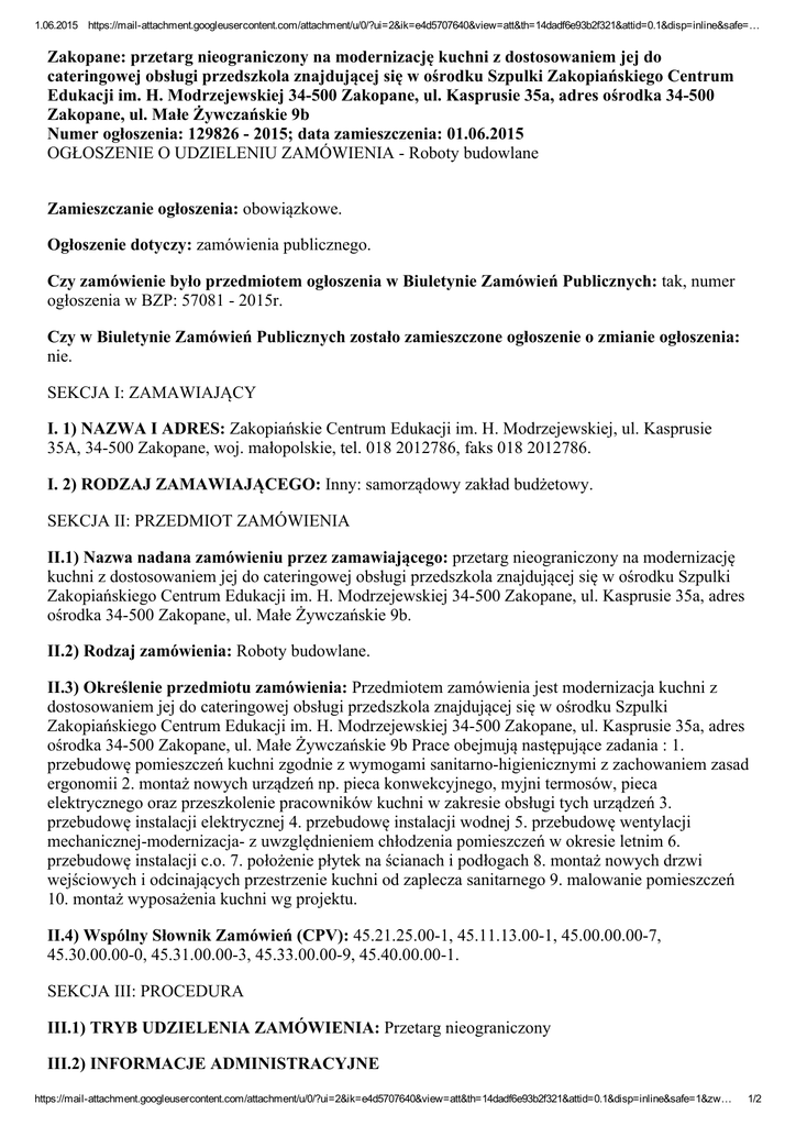1.06.2015 https://mailattachment.googleusercontent.com/attachment/u/0/?ui=2&ik=e4d5707640&view=att&th=14dadf6e93b2f321&attid=0.1&disp=inline&safe=… Zakopane: przetarg nieograniczony na modernizację kuchni z dostosowaniem jej do cateringowej obsługi przedszkola znajdującej się w ośrodku Szpulki Zakopiańskiego Centrum Edukacji im. H. Modrzejewskiej 34500 Zakopane, ul. Kasprusie 35a, adres ośrodka 34500 Zakopane, ul. Małe Żywczańskie 9b Numer ogłoszenia: 129826 2015; data zamieszczenia: 01.06.2015 OGŁOSZENIE O UDZIELENIU ZAMÓWIENIA Roboty budowlane Zamieszczanie ogłoszenia: obowiązkowe. Ogłoszenie dotyczy: zamówienia publicznego. Czy zamówienie było przedmiotem ogłoszenia w Biuletynie Zamówień Publicznych: tak, numer ogłoszenia w BZP: 57081 2015r. Czy w Biuletynie Zamówień Publicznych zostało zamieszczone ogłoszenie o zmianie ogłoszenia: nie. SEKCJA I: ZAMAWIAJĄCY I. 1) NAZWA I ADRES: Zakopiańskie Centrum Edukacji im. H. Modrzejewskiej, ul. Kasprusie 35A, 34500 Zakopane, woj. małopolskie, tel. 018 2012786, faks 018 2012786. I. 2) RODZAJ ZAMAWIAJĄCEGO: Inny: samorządowy zakład budżetowy. SEKCJA II: PRZEDMIOT ZAMÓWIENIA II.1) Nazwa nadana zamówieniu przez zamawiającego: przetarg nieograniczony na modernizację kuchni z dostosowaniem jej do cateringowej obsługi przedszkola znajdującej się w ośrodku Szpulki Zakopiańskiego Centrum Edukacji im. H. Modrzejewskiej 34500 Zakopane, ul. Kasprusie 35a, adres ośrodka 34500 Zakopane, ul. Małe Żywczańskie 9b. II.2) Rodzaj zamówienia: Roboty budowlane. II.3) Określenie przedmiotu zamówienia: Przedmiotem zamówienia jest modernizacja kuchni z dostosowaniem jej do cateringowej obsługi przedszkola znajdującej się w ośrodku Szpulki Zakopiańskiego Centrum Edukacji im. H. Modrzejewskiej 34500 Zakopane, ul. Kasprusie 35a, adres ośrodka 34500 Zakopane, ul. Małe Żywczańskie 9b Prace obejmują następujące zadania : 1. przebudowę pomieszczeń kuchni zgodnie z wymogami sanitarnohigienicznymi z zachowaniem zasad ergonomii 2. montaż nowych urządzeń np. pieca konwekcyjnego, myjni termosów, pieca elektrycznego oraz przeszkolenie pracowników kuchni w zakresie obsługi tych urządzeń 3. przebudowę instalacji elektrycznej 4. przebudowę instalacji wodnej 5. przebudowę wentylacji mechanicznejmodernizacja z uwzględnieniem chłodzenia pomieszczeń w okresie letnim 6. przebudowę instalacji c.o. 7. położenie płytek na ścianach i podłogach 8. montaż nowych drzwi wejściowych i odcinających przestrzenie kuchni od zaplecza sanitarnego 9. malowanie pomieszczeń 10. montaż wyposażenia kuchni wg projektu. II.4) Wspólny Słownik Zamówień (CPV): 45.21.25.001, 45.11.13.001, 45.00.00.007, 45.30.00.000, 45.31.00.003, 45.33.00.009, 45.40.00.001. SEKCJA III: PROCEDURA III.1) TRYB UDZIELENIA ZAMÓWIENIA: Przetarg nieograniczony III.2) INFORMACJE ADMINISTRACYJNE https://mailattachment.googleusercontent.com/attachment/u/0/?ui=2&ik=e4d5707640&view=att&th=14dadf6e93b2f321&attid=0.1&disp=inline&safe=1&zw… 1/2 1.06.2015 https://mailattachment.googleusercontent.com/attachment/u/0/?ui=2&ik=e4d5707640&view=att&th=14dadf6e93b2f321&attid=0.1&disp=inline&safe=… Zamówienie dotyczy projektu/programu finansowanego ze środków Unii Europejskiej: nie SEKCJA IV: UDZIELENIE ZAMÓWIENIA IV.1) DATA UDZIELENIA ZAMÓWIENIA: 29.05.2015. IV.2) LICZBA OTRZYMANYCH OFERT: 2. IV.3) LICZBA ODRZUCONYCH OFERT: 0. IV.4) NAZWA I ADRES WYKONAWCY, KTÓREMU UDZIELONO ZAMÓWIENIA: P.B.U. PRANICA Adam Pranica 34404 Klikuszowa 72, Klikuszowa 72, 34404 Klikuszowa, kraj/woj. małopolskie. IV.5) Szacunkowa wartość zamówienia (bez VAT): 687613,43 PLN. IV.6) INFORMACJA O CENIE WYBRANEJ OFERTY ORAZ O OFERTACH Z NAJNIŻSZĄ I NAJWYŻSZĄ CENĄ Cena wybranej oferty: 657730,42 Oferta z najniższą ceną: 657730,42 / Oferta z najwyższą ceną: 715492,97 Waluta: PLN. https://mailattachment.googleusercontent.com/attachment/u/0/?ui=2&ik=e4d5707640&view=att&th=14dadf6e93b2f321&attid=0.1&disp=inline&safe=1&zw… 2/2