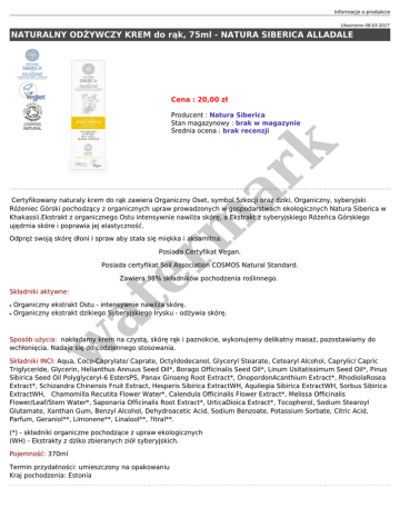 Informacje o produkcie Utworzono 08-03-2017 NATURALNY ODŻYWCZY KREM do rąk, 75ml - NATURA SIBERICA ALLADALE Cena : 20,00 zł er m ar k Producent : Natura Siberica Stan magazynowy : brak w magazynie Średnia ocena : brak recenzji Certyfikowany naturaly krem do rąk zawiera Organiczny Oset, symbol Szkocji oraz dziki, Organiczny, syberyjski Różeniec Górski pochodzący z organicznych upraw prowadzonych w gospodarstwach ekologicznych Natura Siberica w Khakassii.Ekstrakt z organicznego Ostu intensywnie nawilża skórę, a Ekstrakt z syberyjskiego Różeńca Górskiego ujędrnia skóre i poprawia jej elastyczność. Odpręż swoją skórę dłoni i spraw aby stała się miękka i aksamitna. Posiada Certyfikat Vegan. Posiada certyfikat Soil Association COSMOS Natural Standard. Zawiera 98% składników pochodzenia roślinnego. ● ● at Składniki aktywne: Organiczny ekstrakt Ostu - intensywnie nawilża skórę. Organiczny ekstrakt dzikiego Syberyjskiego Irysku - odżywia skórę. w Sposób użycia: nakładamy krem na czystą, skórę rąk i paznokcie, wykonujemy delikatny masaż, pozostawiamy do wchłonięcia. Nadaje się do codziennego stosowania. Składniki INCI: Aqua, Coco-Caprylate/ Caprate, Octyldodecanol, Glyceryl Stearate, Cetearyl Alcohol, Caprylic/ Capric Triglyceride, Glycerin, Helianthus Annuus Seed Oil*, Borago Officinalis Seed Oil*, Linum Usitatissimum Seed Oil*, Pinus Sibirica Seed Oil Polyglyceryl-6 EstersPS, Panax Ginseng Root Extract*, OnopordonAcanthium Extract*, RhodiolaRosea Extract*, Schizandra Chinensis Fruit Extract, Hesperis Sibirica ExtractWH, Aquilegia Sibirica ExtractWH, Sorbus Sibirica ExtractWH, Chamomilla Recutita Flower Water*, Calendula Officinalis Flower Extract*, Melissa Officinalis Flower/Leaf/Stem Water*, Saponaria Officinalis Root Extract*, UrticaDioica Extract*, Tocopherol, Sodium Stearoyl Glutamate, Xanthan Gum, Benzyl Alcohol, Dehydroacetic Acid, Sodium Benzoate, Potassium Sorbate, Citric Acid, Parfum, Geraniol**, Limonene**, Linalool**, ?itral**. (*) - składniki organiczne pochodzące z upraw ekologicznych (WH) - Ekstrakty z dziko zbieranych ziół syberyjskich. Pojemność: 370ml Termin przydatności: umieszczony na opakowaniu Kraj pochodzenia: Estonia
