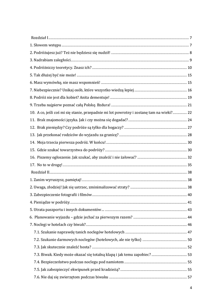 Rozdział I ........................................................................................................................................... 7 1. Słowem wstępu .............................................................................................................................. 7 2. Podróżujesz już? Też nie będziesz się nudził! ............................................................................. 8 3. Nadrabiam zaległości..................................................................................................................... 9 4. Podróżniczy teoretycy. Znasz ich? .............................................................................................. 10 5. Tak dłużej być nie może! ............................................................................................................. 15 6. Masz wymówkę, nie masz wspomnień! ..................................................................................... 15 7. Niebezpiecznie? Unikaj osób, które wszystko wiedzą lepiej .................................................... 16 8. Podróż nie jest dla kobiet? Anita dementuje! ............................................................................ 19 9. Trzeba najpierw poznać całą Polskę. Bzdura! ........................................................................... 21 10. A co, jeśli coś mi się stanie, przepadnie mi lot powrotny i zostanę tam na wieki? .............. 22 11. Brak znajomości języka. Jak i czy można się dogadać? .......................................................... 24 12. Brak pieniędzy? Czy podróże są tylko dla bogaczy? .............................................................. 27 13. Jak przekonać rodziców do wyjazdu za granicę? ................................................................... 28 14. Moja trzecia pierwsza podróż. W końcu! ................................................................................ 30 15. Gdzie szukać towarzystwa do podróży? ................................................................................. 30 16. Piszemy ogłoszenie. Jak szukać, aby znaleźć i nie żałować? ................................................. 32 17. No to w drogę! ........................................................................................................................... 35 Rozdział II........................................................................................................................................ 38 1. Zanim wyruszysz, pamiętaj! ........................................................................................................ 38 2. Uwaga, złodziej! Jak się ustrzec, zminimalizować straty? ........................................................ 38 3. Zabezpieczenie fotografii i filmów.............................................................................................. 40 4. Pieniądze w podróży. ................................................................................................................... 41 5. Utrata paszportu i innych dokumentów… ................................................................................. 43 6. Planowanie wyjazdu – gdzie jechać za pierwszym razem? ..................................................... 44 7. Noclegi w hotelach czy biwak?.................................................................................................... 46 7.1. Szukanie naprawdę tanich noclegów hotelowych ............................................................. 47 7.2. Szukanie darmowych noclegów (hotelowych, ale nie tylko) ............................................ 50 7.3. Jak skutecznie znaleźć hosta? .............................................................................................. 52 7.3. Biwak. Kiedy może okazać się totalną klapą i jak temu zapobiec? ................................... 53 7.4. Bezpieczeństwo podczas noclegu pod namiotem .............................................................. 55 7.5. Jak zabezpieczyć ekwipunek przed kradzieżą? .................................................................. 55 7.6. Nie daj się zwierzętom podczas biwaku ............................................................................. 57 4 7.7. O czym jeszcze trzeba pamiętać? Kilka złotych przykazań ............................................... 60 8. Twoje własne mieszkanie. Wybieranie dobrego namiotu ........................................................ 61 9. Czy ciepły śpiwór musi być drogi? ............................................................................................. 63 10. Na czym spać? ............................................................................................................................ 64 10.1. Karimata. Czy to ma jeszcze sens? Na co zwrócić uwagę? .............................................. 65 10.2. Mata samopompująca – zbędny bajer? Jaką wybrać? ..................................................... 66 11. Jedzenie w podróży .................................................................................................................. 68 11.1. Stołowanie się, gotowanie samemu czy kompromis? ..................................................... 68 11.2. Gotowanie samemu. Jaką kuchenkę wybrać? ................................................................... 70 11.3. Gotowanie w podróży. Porady, ciekawostki i pożyteczne triki ...................................... 75 12. Ekwipunek, czyli co zabrać i w co się spakować? .................................................................. 76 12.1. Wszystko o sakwach rowerowych.................................................................................... 77 12.2. Plecak plecakowi nierówny............................................................................................... 87 12.3. Lista rzeczy do zabrania ze sobą w podróż .................................