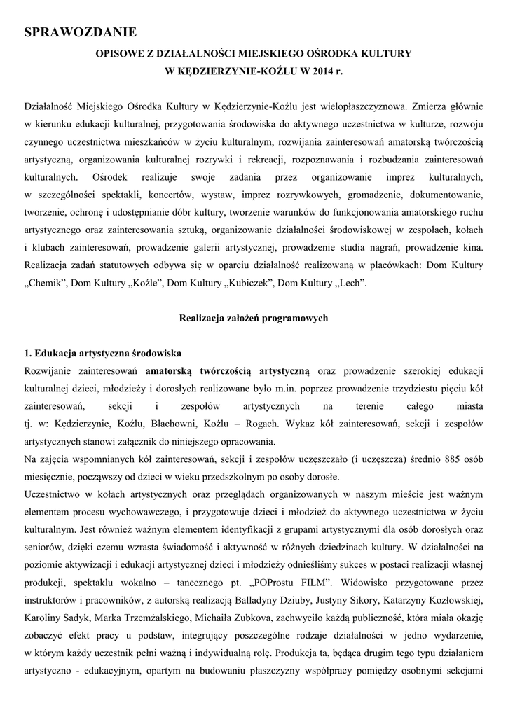 SPRAWOZDANIE OPISOWE Z DZIAŁALNOŚCI MIEJSKIEGO OŚRODKA KULTURY W KĘDZIERZYNIE-KOŹLU W 2014 r. Działalność Miejskiego Ośrodka Kultury w Kędzierzynie-Koźlu jest wielopłaszczyznowa. Zmierza głównie w kierunku edukacji kulturalnej, przygotowania środowiska do aktywnego uczestnictwa w kulturze, rozwoju czynnego uczestnictwa mieszkańców w życiu kulturalnym, rozwijania zainteresowań amatorską twórczością artystyczną, organizowania kulturalnej rozrywki i rekreacji, rozpoznawania i rozbudzania zainteresowań kulturalnych. Ośrodek realizuje swoje zadania przez organizowanie imprez kulturalnych, w szczególności spektakli, koncertów, wystaw, imprez rozrywkowych, gromadzenie, dokumentowanie, tworzenie, ochronę i udostępnianie dóbr kultury, tworzenie warunków do funkcjonowania amatorskiego ruchu artystycznego oraz zainteresowania sztuką, organizowanie działalności środowiskowej w zespołach, kołach i klubach zainteresowań, prowadzenie galerii artystycznej, prowadzenie studia nagrań, prowadzenie kina. Realizacja zadań statutowych odbywa się w oparciu działalność realizowaną w placówkach: Dom Kultury „Chemik”, Dom Kultury „Koźle”, Dom Kultury „Kubiczek”, Dom Kultury „Lech”. Realizacja założeń programowych 1. Edukacja artystyczna środowiska Rozwijanie zainteresowań amatorską twórczością artystyczną oraz prowadzenie szerokiej edukacji kulturalnej dzieci, młodzieży i dorosłych realizowane było m.in. poprzez prowadzenie trzydziestu pięciu kół zainteresowań, sekcji i zespołów artystycznych na terenie całego miasta tj. w: Kędzierzynie, Koźlu, Blachowni, Koźlu – Rogach. Wykaz kół zainteresowań, sekcji i zespołów artystycznych stanowi załącznik do niniejszego opracowania. Na zajęcia wspomnianych kół zainteresowań, sekcji i zespołów uczęszczało (i uczęszcza) średnio 885 osób miesięcznie, począwszy od dzieci w wieku przedszkolnym po osoby dorosłe. Uczestnictwo w kołach artystycznych oraz przeglądach organizowanych w naszym mieście jest ważnym elementem procesu wychowawczego, i przygotowuje dzieci i młodzież do aktywnego uczestnictwa w życiu kulturalnym. Jest również ważnym elementem identyfikacji z grupami artystycznymi dla osób dorosłych oraz seniorów, dzięki czemu wzrasta świadomość i aktywność w różnych dziedzinach kultury. W działalności na poziomie aktywizacji i edukacji artystycznej dzieci i młodzieży odnieśliśmy sukces w postaci realizacji własnej produkcji, spektaklu wokalno – tanecznego pt. „POProstu FILM”. Widowisko przygotowane przez instruktorów i pracowników, z autorską realizacją Balladyny Dziuby, Justyny Sikory, Katarzyny Kozłowskiej, Karoliny Sadyk, Marka Trzemżalskiego, Michaiła Zubkova, zachwyciło każdą publiczność, która miała okazję zobaczyć efekt pracy u podstaw, integrujący poszczególne rodzaje działalności w jedno wydarzenie, w którym każdy uczestnik pełni ważną i indywidualną rolę. Produkcja ta, będąca drugim tego typu działaniem artystyczno - edukacyjnym, opartym na budowaniu płaszczyzny współpracy pomiędzy osobnymi sekcjami i zespołami, była prezentowana nie tylko na terenie miasta. Grupa młodych artystów ze Studia Piosenki, zespołu tanecznego SPIN, Teatru Tańca RoArte oraz Centrum Tańca „Fiesta”, wykonująca spektakl, prezentowała się na scenie Miejskiego Ośrodka Kultury w Głubczycach oraz w Opolu, na II Wojewódzkim Przeglądzie Twórczości Artystycznej „Opolskie Szmaragdy”, organizowanym przez Urząd Marszałkowski Województwa Opolskiego. Ponadto spektakl był prezentowany wraz z produkcjami sekcji teatralnej, prowadzonej przez Waldemara Lankaufa, na Międzynarodowym Festiwalu Teatrów Amatorskich „Dostavnicko s divadlem” w czeskim Prerovie. W ramach edukacji artystycznej Studio Piosenki prowadzone przez Justynę Sikorę i Tadeusza Bratusa przygotowało wiele programów scenicznych i koncertów prezentowanych mieszkańcom miasta, do najbardziej widowiskowych należą: „Lata 20-te, lata 30-te” oraz „Hity z satelity”, które swą premierę miały podczas Dni Miasta 2014. Realizacja edukacji artystycznej obejmuje praktycznie wszystkie grupy wiekowe. W odpowiedzi na potrzeby mieszkańców rozstała rozszerzona działalności dla najmłodszych. W ramach Akademii Przedszkolaka umożliwiono odbywanie zajęć dla grup 3-4 latków. 2. Rozszerzenie i umocnienie amatorskiego ruchu artystycznego W celu rozszerzenia i wzmocnienia amatorskiego ruchu artystycznego aktywizowane są środowiska dzieci, młodzieży i dorosłych, poprzez zaproszenie do uczestnictwa w festiwalach, przeglądach, konkursach, spotkaniach artystycznych oraz innych formach. Do najbardziej rozpoznawanych, cyklicznych wydarzeń artystycznych, współorganizowanych m.in. z placówkami oświatowymi, organizacjami pozarządowymi i innymi, należą: Konkurs teatralny „Teatromania Przedszkolaka”, Festiwal Piosenki Harcerskiej „Muzyczne Spotkania”, Biesiady Kozielskie – „Lekcje śpiewania”, „Siła Słowa” – Przegląd Twórczości Hip-Hopowej. Wernisaże – w 2014 roku odbyło się 17 wernisaży i wystaw prac artystów z terenu naszego miasta, kraju i za granicy, prezentowane w dwóch galeriach: „Galerii Sztuk Wszelakich” w Domu Kultury „Chemik” oraz w „Galerii na Strychu" w Domu Kultury „Koźle”. Miejsca te są ważnym elementem procesu twórczego oraz pozwalają na prezentowanie prac w odpowiedniej oprawie szerokiemu gronu odbiorców z Kędzierzyna – Koźla. Przeglądy organizowane w naszych placówkach umożliwiają dzieciom, młodzieży i dorosłym dostrzeżenie ich talentów oraz prezentację umiejętności, jak również udzielenie wsparcia edukacyjnego w postaci zaproszenia do uczestnictwa w kołach zainteresowań i sekcjach. W wielu przypadkach młodzi twórcy mają okazję nawiązania współpracy z MOK przy organizacji wydarzeń kulturalnych, prezentując własny dorobek artystyczn