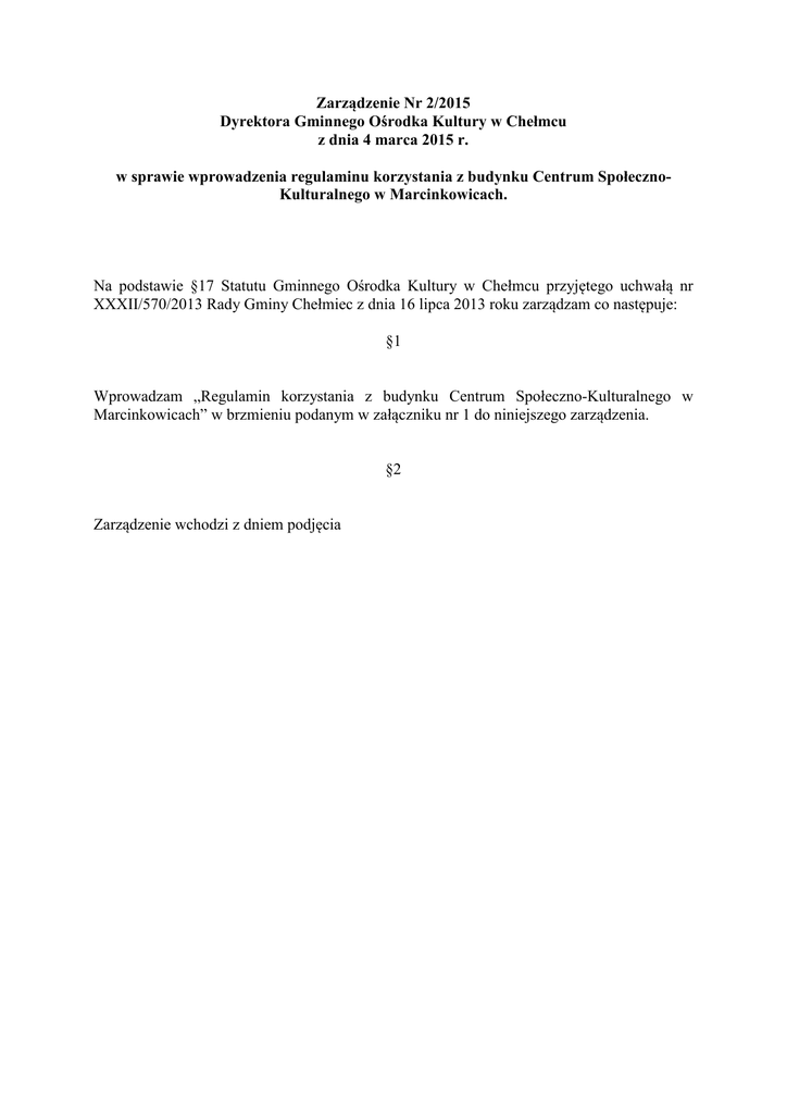 Zarządzenie Nr 2/2015 Dyrektora Gminnego Ośrodka Kultury w Chełmcu z dnia 4 marca 2015 r. w sprawie wprowadzenia regulaminu korzystania z budynku Centrum SpołecznoKulturalnego w Marcinkowicach. Na podstawie §17 Statutu Gminnego Ośrodka Kultury w Chełmcu przyjętego uchwałą nr XXXII/570/2013 Rady Gminy Chełmiec z dnia 16 lipca 2013 roku zarządzam co następuje: §1 Wprowadzam „Regulamin korzystania z budynku Centrum Społeczno-Kulturalnego w Marcinkowicach” w brzmieniu podanym w załączniku nr 1 do niniejszego zarządzenia. §2 Zarządzenie wchodzi z dniem podjęcia Załącznik nr 1 do Zarządzenia nr 2/2015 Dyrektora GOK w Chełmcu z dnia 4 marca 2015 roku Regulamin korzystania z budynku Centrum Społeczno-Kulturalnego w Marcinkowicach I Postanowienia ogólne. 1. Centrum Społeczno-Kulturalne w Marcinkowicach funkcjonuje w strukturach Gminnego Ośrodka Kultury w Chełmcu i udostępniane jest osobom pełnoletnim. 2. W przypadku organizowania w Centrum Społeczno-Kulturalnym przedsięwzięć z udziałem osób niepełnoletnich, opiekun budynku udostępnia pomieszczenia osobom pełnoletnim, które odpowiadają za bezpieczeństwo osób nieletnich. 3. Centrum Społeczno-Kulturalne w Marcinkowicach jest miejscem spotkań mieszkańców wsi, zgodnie z potrzebami lokalnej społeczności oraz miejscem, gdzie prowadzona jest działalność statutowa Gminnego Ośrodka Kultury w Chełmcu w zakresie upowszechniania i ochrony kultury. 4. Administratorem Centrum Społeczno-Kulturalnego w Marcinkowicach jest opiekun. 5. Godziny otwarcia Centrum Społeczno-Kulturalnego w Marcinkowicach określa harmonogram, dostosowany do potrzeb mieszkańców. 6. Opiekunem Centrum Społeczno-Kulturalnego w Marcinkowicach jest osoba wyznaczona przez Dyrektora Gminnego Ośrodka Kultury w Chełmcu. 7. Klucze do Centrum Społeczno-Kulturalnego w Marcinkowicach posiada opiekun oraz inne osoby do tego upoważnione przez Dyrektora Gminnego Ośrodka Kultury w Chełmcu. 8. Osoby posiadające klucze oraz indywidualne kody alarmu, ponoszą odpowiedzialność materialną za powierzony im sprzęt i urządzenia stanowiące wyposażenie Centrum Społeczno-Kulturalnego w Marcinkowicach i zobowiązane są do prowadzenia rejestru podmiotów, którym udostępnia się obiekt w celu przeniesienia na te osoby odpowiedzialności materialnej za szkody wyrządzone na obiekcie w trakcie jego użytkowania. II. OPIEKUN Centrum Społeczno-Kulturalnego w Marcinkowicach. Do obowiązków opiekuna należy: 1) utrzymywanie stałego kontaktu z Dyrektorem Gminnego Ośrodka Kultury w Chełmcu w sprawach dotyczących organizowania i wykorzystania obiektu dla celów społecznokulturalnych. 2) utrzymywanie dobrych relacji z mieszkańcami sołectwa oraz z podmiotami działającymi na ich terenie. 3) dbanie o czystość obiektu i przyległego terenu, oraz zapewnienie bezpiecznego korzystania z obiektu. 4) dbanie o urządzenia i sprzęt znajdujący się w obiekcie oraz na przyległym terenie. 5) udostępnianie obiektu zgodnie z ustalonym harmonogramem, na zebrania i spotkania wiejskie, zajęcia z instruktorem, wystawy, zapoznanie osób z obiektem oraz z regulaminem korzystania z obiektu, przekazanie sprzętu i urządzeń osobom uprawnionym, odbiór obiektu po zakończeniu zebrań, spotkań czy zajęć. 6) współorganizowanie imprez środowiskowych. 7) informowanie mieszkańców sołectwa o planowanych imprezach. 8) zgłaszanie do Gminnego Ośrodka Kultury w Chełmcu: usterek, awarii, potrzeb bieżących. 9) prowadzenie rejestru udostępniania obiektu. 10) dbanie o oszczędność energii elektrycznej (szczególnie przy korzystaniu z ogrzewania). III. ZASADY KORZYSTANIA Z CENTRUM SPOŁECZNOKULTURALNEGO W MARCINKOWICACH. 1. Osoby uprawnione do korzystania z Centrum Społeczno-Kulturalnego w Marcinkowicach: dzieci i młodzież w ramach zajęć prowadzonych pod opieką osoby dorosłej, w godzinach otwarcia obiektu, członkowie kół gospodyń wiejskich oraz innych organizacji działających w danym środowisku, kół zainteresowań zgodnie z harmonogramem zajęć, mieszkańcy wsi Marcinkowice w ramach zorganizowanych inicjatyw lokalnych, takich jak imprezy kulturalne, szkolenia prowadzone przez osoby z zewnątrz itp. 2. Udostępnienie obiektu odbywa się po dokładnym ustaleniu zasad korzystania z opiekunem Centrum Społeczno-Kulturalnego w Marcinkowicach. 3.Udostępnienie obiektu powinno zostać wpisane do rejestru korzystania z obiektu z podaniem danych osoby, której powierza się obiekt. 4. Osoba, której udostępniony jest obiekt Centrum Społeczno-Kulturalnego w Marcinkowicach ponosi odpowiedzialność za zniszczenie mienia, w tym za działania osób, którymi się opiekuje, jeśli w wyniku ich działania powstały szkody materialne. 5. Uczestnicy spotkań, imprez odbywających się w Centrum Społeczno-Kulturalnym w Marcinkowicach zobowiązani są do przestrzegania niniejszego regulaminu. IV. REGULAMIN UCZESTNIKA ZAJĘĆ W CENTRUM SPOŁECZNOKULTURALNYM W MARCINKOWICACH. 1. Uczestnik zajęć zobowiązany jest dbać o sprzęt będący w jego dyspozycji. W przypadku zniszczenia lub uszkodzenia sprzętu lub innego mienia będącego na stanie Centrum Społeczno-Kulturalnego w Marcinkowicach, również przez inne osoby, zobowiązany jest niezwłocznie powiadomić o tym opiekuna obiektu. 2. Zabrania się przychodzenia do obiektu pod wpływem alkoholu i środków odurzających. 3. Na terenie obiektu nie wolno spożywać alkoholu, palić papierosów i używać środków odurzających. 4. Mienie należące do Centrum Społeczno-Kulturalnego w Marcinkowicach (zabawki, gry, materiały plastyczne itp.) nie może być przywłaszczane przez uczestników ani wynoszone poza teren obiektu. 5. Opiekun obiektu może pozbawić uczestnika prawa uczęszczania do Centrum SpołecznoKulturalnego w Marcinkowicach w przypadku, gdy: - uczestnik zajęć dopuści się agresywnego zachowania wobec opiekuna obiektu, instruktora lub innego uczestnika zajęć, - uczestnik swoim z