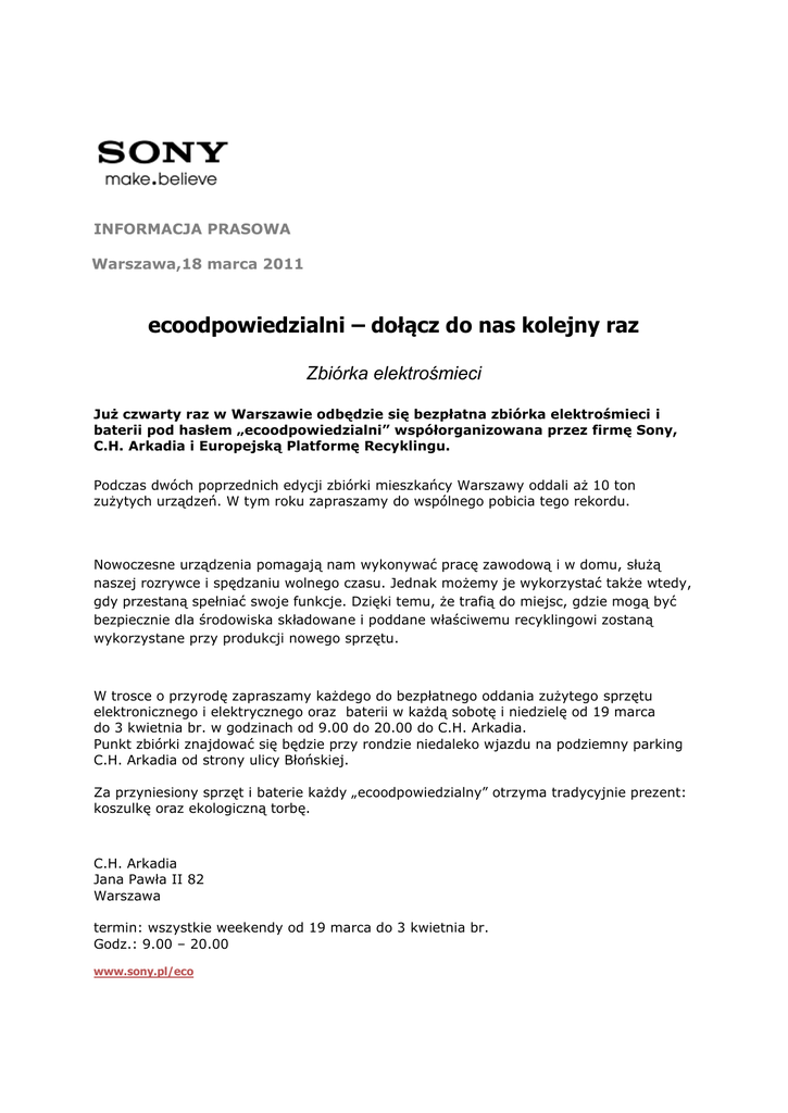 INFORMACJA PRASOWA Warszawa,18 marca 2011 ecoodpowiedzialni – dołącz do nas kolejny raz Zbiórka elektrośmieci Już czwarty raz w Warszawie odbędzie się bezpłatna zbiórka elektrośmieci i baterii pod hasłem „ecoodpowiedzialni” współorganizowana przez firmę Sony, C.H. Arkadia i Europejską Platformę Recyklingu. Podczas dwóch poprzednich edycji zbiórki mieszkańcy Warszawy oddali aż 10 ton zużytych urządzeń. W tym roku zapraszamy do wspólnego pobicia tego rekordu. Nowoczesne urządzenia pomagają nam wykonywać pracę zawodową i w domu, służą naszej rozrywce i spędzaniu wolnego czasu. Jednak możemy je wykorzystać także wtedy, gdy przestaną spełniać swoje funkcje. Dzięki temu, że trafią do miejsc, gdzie mogą być bezpiecznie dla środowiska składowane i poddane właściwemu recyklingowi zostaną wykorzystane przy produkcji nowego sprzętu. W trosce o przyrodę zapraszamy każdego do bezpłatnego oddania zużytego sprzętu elektronicznego i elektrycznego oraz baterii w każdą sobotę i niedzielę od 19 marca do 3 kwietnia br. w godzinach od 9.00 do 20.00 do C.H. Arkadia. Punkt zbiórki znajdować się będzie przy rondzie niedaleko wjazdu na podziemny parking C.H. Arkadia od strony ulicy Błońskiej. Za przyniesiony sprzęt i baterie każdy „ecoodpowiedzialny” otrzyma tradycyjnie prezent: koszulkę oraz ekologiczną torbę. C.H. Arkadia Jana Pawła II 82 Warszawa termin: wszystkie weekendy od 19 marca do 3 kwietnia br. Godz.: 9.00 – 20.00 www.sony.pl/eco Sony zastrzega sobie możliwość wprowadzenia zmian po ukazaniu się niniejszej informacji. Informacja o Sony: Sony jest producentem innowacyjnego sprzętu audio, wideo, telekomunikacyjnego i informatycznego przeznaczonego na rynek masowy i dla odbiorców profesjonalnych. Sony słynie ze swoich urządzeń audiowizualnych, takich jak telewizory LCD High Definition BRAVIA™, cyfrowe aparaty Cyber-shot™, kamery Handycam® i odtwarzacze MP3 Walkman®, jak również z komputerów osobistych VAIO™ i profesjonalnego sprzętu studyjnego HD, w tym systemów XDCAM™ HD. Działalność w branży elektronicznej, muzycznej, kinowej, gier i internetowej umożliwia Sony oferowanie pełnego łańcucha wartości HD i zapewnia firmie miejsce w czołówce światowych marek rozrywki cyfrowej. Obecny stan zatrudnienia na całym świecie wynosi około 170 000 osób. Poprzez długoterminowe umowy z organizacjami piłkarskimi – firma jest oficjalnym sponsorem Ligi Mistrzów UEFA do roku 2012, oficjalnym partnerem FIFA do roku 2014 i globalnym sponsorem rozgrywek FIFA World Cup™ w latach 2010 i 2014 – Sony rozbudza emocje wśród milionów fanów futbolu z całego świata. „Sony”, „WALKMAN”, „VAIO”, „Cyber-shot”, „Handycam”, „BRAVIA” i „XDCAM” są zastrzeżonymi znakami handlowymi lub znakami handlowymi Sony Corporation. Wszystkie inne znaki handlowe lub zastrzeżone znaki handlowe stanowią własność odpowiednich właścicieli.