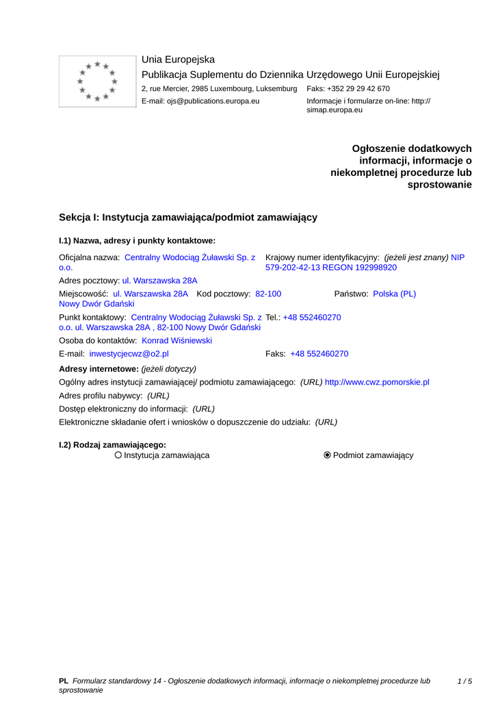 Unia Europejska Publikacja Suplementu do Dziennika Urzędowego Unii Europejskiej 2, rue Mercier, 2985 Luxembourg, Luksemburg Faks: +352 29 29 42 670 E-mail: [email protected] Informacje i formularze on-line: http:// simap.europa.eu Ogłoszenie dodatkowych informacji, informacje o niekompletnej procedurze lub sprostowanie Sekcja I: Instytucja zamawiająca/podmiot zamawiający I.1) Nazwa, adresy i punkty kontaktowe: Oficjalna nazwa: Centralny Wodociąg Żuławski Sp. z o.o. Krajowy numer identyfikacyjny: (jeżeli jest znany) NIP 579-202-42-13 REGON 192998920 Adres pocztowy: ul. Warszawska 28A Miejscowość: ul. Warszawska 28A Nowy Dwór Gdański Kod pocztowy: 82-100 Państwo: Polska (PL) Punkt kontaktowy: Centralny Wodociąg Żuławski Sp. z Tel.: +48 552460270 o.o. ul. Warszawska 28A , 82-100 Nowy Dwór Gdański Osoba do kontaktów: Konrad Wiśniewski E-mail: [email protected] Faks: +48 552460270 Adresy internetowe: (jeżeli dotyczy) Ogólny adres instytucji zamawiającej/ podmiotu zamawiającego: (URL) http://www.cwz.pomorskie.pl Adres profilu nabywcy: (URL) _____ Dostęp elektroniczny do informacji: (URL) _____ Elektroniczne składanie ofert i wniosków o dopuszczenie do udziału: (URL) _____ I.2) Rodzaj zamawiającego: Instytucja zamawiająca Podmiot zamawiający PL Formularz standardowy 14 - Ogłoszenie dodatkowych informacji, informacje o niekompletnej procedurze lub sprostowanie 1/5 Sekcja II: Przedmiot zamówienia II.1.1) Nazwa nadana zamówieniu: Roboty budowlane dot. Projektu: „Poprawa jakości oraz ograniczenie strat wody w Centralnym Wodociągu Żuławskim” – etap I II.1.2) Krótki opis zamówienia lub zakupu: (podano w pierwotnym ogłoszeniu) Przedmiotem zamówienia są Roboty związane z realizacją Projektu pn. „Poprawa jakości oraz ograniczenie strat wody w Centralnym Wodociągu Żuławskim” – etap I Zakres rzeczowy realizacji Projektu obejmuje: -budowę na terenie Zakładu Produkcji Wody w Ząbrowie stacji uzdatniania wody o wydajności 800 m3/ h wraz ze wszystkimi urządzeniami i instalacjami technologicznymi do filtracji, napowietrzania, płukania, przepompowania, chlorowania, sterowania i AKPiA oraz pompownią II sto (sieciową) o wydajności 1200 m3/h, -remont istniejących zbiorników wody o pojemności łącznej 2000 m3 i budowę nowego zbiornika o pojemności 2260 m3, -przebudowę istniejących sieci na inwestowanym terenie, -budowę zaplecza wraz z pomieszczeniem laboratorium, -rozbiórkę i demontaż zbędnych obiektów i elementów wyposażenia SUW, -budowę odstojnika wód popłucznych wraz z przebudową sieci i urządzeń do odprowadzenia tych wód i gromadzenia osadu, -system monitorowania sieci magistralnej w punktach węzłowych (10 szt) oraz system monitorowania 20 studni na ujęciu wody. Stacja Uzdatniania Wody w Ząbrowie wchodzi w skład układu technologicznego ujęcia wód podziemnych Letniki. Ujęcie zlokalizowane jest w delcie Wisły, we wschodniej części Żuław Wiślanych, w obrębie Żuław Elbląskich, wzdłuż prawego brzegu Nogatu. W skład ujęcia wchodzą również studnie eksploatujące wodę z poziomu plejstoceńsko-holoceńskiego i kredowego poziomu wodonośnego. Nie przewiduje się zmiany sposobu użytkowania istniejących terenów w związku z zamierzeniem inwestycyjnym. Nowa stacja uzdatniania wody powstanie na terenie istniejącej stacji uzdatniania wody, z koniecznością utrzymania jej w ciągłej eksploatacji. W pierwszej kolejności zostanie zbudowana i uruchomiona nowa stacja (faza I), następnie dojdzie do wyłączenia starej stacji i jej rozbiórka oraz ukończenie robót w obszarach porozbiórkowych (faza II). Wykonawca sporządzi projekt rozruchu, a także zaprojektuje i zbuduje obejścia sieciowe wody na czas rozruchu oraz połączy układ technologiczny nowego SUW z istniejącym, tak by woda pobierana na czas rozruchu mogła być uzdatniona i wtłoczona do sieci. Stacja jest realizowana na działce nr 9 obręb Ząbrowo, odległej 1 km od wsi Ząbrowo nad rzeką Nogat, gmina Stare Pole, powiat malborski. Działka Nr 9 stanowi własność Inwestora. W zakres Robót wchodzi kompletna realizacja Projektu wraz z dostawami i montażem urządzeń, rozruchem technologicznym, zgodnie z dokumentacją projektową i specyfikacjami technicznymi. Do zadań Wykonawcy należy także przeszkolenie pracowników, wykonanie dokumentacji powykonawczej, prowadzenie prób eksploatacyjnych oraz wykonanie wszystkich innych prac koniecznych do użytkowania SUW, zgodnie z obowiązującym prawem oraz określonym przez Zamawiającego przeznaczeniem. Obowiązkiem wykonawcy jest także wykonanie robót odtworzeniowych obejmujących w szczególności: uporządkowanie terenu, odtworzenie dróg dojazdowych do SUW oraz placów, chodników, terenów zielonych naruszonych w wyniku realizacji robót. Obowiązkiem wykonawcy jest uzyskanie w imieniu i na rzecz Zamawiającego pozwolenia na użytkowanie oraz opracowanie wniosku i uzyskanie pozwolenia wodnoprawnego dla Stacji uzdatniania wody. Wykonawca zobowiązuje się do wykonania Robót w sposób, który nie zakłóci normalnej pracy SUW, jak również zobowiązuje się do usunięcia wszelkich wad w Robotach. Szczegółowo opis przedmiotu zamówienia opisano w SIWZ. II.1.3) Wspólny Słownik Zamówień (CPV) Główny przedmiot Słownik główny 45232430 Słownik uzupełniający (jeżeli dotyczy) PL Formularz standardowy 14 - Ogłoszenie dodatkowych informacji, informacje o niekompletnej procedurze lub sprostowanie 2/5 Dodatkowe przedmioty Słownik główny 45100000 45200000 45110000 45111200 45231000 45231100 45231300 45232400 45232000 45231400 45300000 45400000 51900000 Słownik uzupełniający (jeżeli dotyczy) PL Formularz standardowy 14 - Ogłoszenie dodatkowych informacji, informacje o niekompletnej procedurze lub sprostowanie 3/5 Sekcja IV: Procedura IV.1)Rodzaj procedury (podano w pierwotnym ogłoszeniu) Otwarta Ograniczona Ograniczona przyspieszona Negocjacyjna Negocjacyjna przyspieszona Di