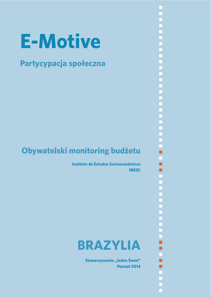 E-Motive Partycypacja społeczna Obywatelski monitoring budżetu Instituto de Estudos Socioeconômicos INESC BRAZYLIA Stowarzyszenie „Jeden Świat” Poznań 2014 E-MOTIVE równość emotions ruch equity emocje movement 'E-Motive to sieć organizacji z całego świata, które dzielą się wiedzą i doświadczeniem, by tworzyć innowacyjne i skuteczne rozwiązania dla wspólnych problemów. 'E-Motive umożliwia specjalistom i organizacjom z Afryki, Azji, Ameryki Łacińskiej i Europy nawiązanie kontaktów i poznawanie skutecznych metod pracy, stworzonych w krajach Globalnego Południa. 'E-Motive wspiera wymianę wiedzy i doświadczenia, tworząc warunki do wzajemnego uczenia się, z poszanowaniem równych praw wszystkich uczestniczących w programie organizacji. 'E-Motive to również uwrażliwianie szerokiego grona odbiorców na globalne współzależności i upowszechnianie nowych metod współpracy na rzecz rozwoju. 'E-Motive rozpoczął się w Holandii w 2006 r., jako jeden z innowacyjnych programów Oxfam Novib. Od tego czasu zorganizowano ponad 80 wymian z udziałem organizacji pozarządowych z Holandii i krajów Globalnego Południa. 'W 2014 r. pierwsze wymiany E-Motive w Polsce zorganizowało Stowarzyszenie „Jeden Świat” we współpracy z organizacjami z Laosu i Meksyku. Zmieniaj to, co bliskie. Inspiruj się tym, co odległe. 1 WPROWADZENIE Szanowni Członkowie Komisji, mam na imię Noureddine i jestem członkiem grupy, zajmującej się obywatelskim monitorowaniem budżetu. Przeanalizowaliśmy budżet naszej dzielnicy Indische Buurt. Na stronie 26 można przeczytać, że w wydatkach na rok 2013 przewidziano kwotę 197 milionów euro. Dane finansowe za rok 2011 wykazują wydatki rzędu 243 milionów. Czy dobrze rozumiemy, że w ciągu trzech lat planowane wydatki zmniejszą się o 43 miliony? – tak rozpoczęła się seria pytań podczas posiedzenia Komisji Polityki Społecznej Rady Dzielnicy Wschodniej Amsterdamu w czerwcu 2012 r. Pytania zadawał Noureddine Oulad El Hadj Sellama, mieszkaniec Indische Buurt, uczestnik projektu obywatelskiego monitoringu budżetu – pierwszego tego rodzaju eksperymentu w historii Holandii. Na przełomie 2011 i 2012 r. grupa przedstawicieli społeczności lokalnych postanowiła przyjrzeć się publicznym wydatkom w Amsterdamie, odczarować biurokratyczny żargon i nadać danym finansowym zrozumiałą formę. Wystąpienie tzw. przeciętnego mieszkańca podczas oficjalnego posiedzenia władz lokalnych było niecodziennym zjawiskiem. Podobne nastroje towarzyszyły pilotażowemu projektowi obywatelskiego monitorowania budżetu w Kaliszu i w Koninie. W jego realizację zaangażowali się działacze ruchów miejskich: Kaliskiej Inicjatywy Miejskiej i Akcji Konin, którzy do projektu „Liczy się miasto” zaprosili mieszkańców, przedstawicieli społeczności lokalnych i władze miejskie. Szczegółowe informacje na temat projektu można znaleźć na stronie www.liczysiemiasto.pl. Obywatelski monitoring budżetu trafił do Europy z Brazylii, gdzie wykorzystywany jest od ponad 20 lat przez Instituto de Estudos Socioeconômicos – INESC. Organizacja sięga po obywatelski monitoring budżetu, by upowszechniać znajomość praw człowieka i działać na rzecz ich przestrzegania na poziomie lokalnym, krajowym i globalnym. 2 INESC Idea' Instituto de Estudos Socioeconômicos (Instytut Studiów Socjoekonomicznych) – INESC jest niezależną brazylijską organizacją pozarządową, od 1979 r. działającą na rzecz pożytku publicznego. Głównym celem organizacji jest wzmocnienie demokracji i zapewnienie przestrzegania praw człowieka, poprzez budowanie społeczeństwa obywatelskiego i angażowanie obywateli w życie publiczne. Według INESC największym wyzwaniem stojącym przed społeczeństwem brazylijskim jest wyeliminowanie ubóstwa i nierówności społecznych. INESC wykorzystuje obywatelski monitoring budżetu, by zachęcać do publicznej debaty i upowszechniać nową koncepcję praw obywatelskich, opartą na idei odpowiedzialności społecznej i solidarności. Obywatelski monitoring budżetu' Obywatelski monitoring budżetu pomaga społecznościom i organizacjom pozarządowym aktywnie uczestniczyć w życiu publicznym: uczy rozumieć proces podejmowania decyzji dotyczących budżetów lokalnych, wzmacnia świadomość praw przysługujących obywatelom, zachęca ich, by domagali się od przedstawicieli władz podejmowania odpowiedzialnych decyzji. Istotną rolę w tym procesie odgrywa powszechna edukacja w ujęciu brazylijskiego pedagoga Paulo Freire, autora Pedagogii uciśnionych. Według Freire edukacja to wymiana wiedzy i doświadczenia w grupie, we wspólnocie, a jej celem jest wywołanie zmian organizacji społecznej, które przysłużą się wolności, równości i sprawiedliwości. Etapy obywatelskiego monitoringu budżetu: 1. Zebranie danych finansowych nt. wpływów i wydatków miasta, dzielnicy itp. 2. Analiza zebranych danych finansowych: skąd pochodzą wpływy do budżetu, na co wydawane są publiczne środki, czy pieniądze wydawane są gospodarnie i zgodnie z planem itd. 3. Infografiki: opracowanie zebranych danych w przejrzysty i czytelny dla każdego sposób. 4. Włączenie społeczności lokalnych: określenie rzeczywistych potrzeb mieszkańców. 5. Wypracowanie rekomendacji dla władz. 3 Prawa człowieka' Współczesna koncepcja praw człowieka to nie tylko deklaracja polityczna czy zbiór idei, ale system praw (międzynarodowych i krajowych), do których przestrzegania zobowiązane są zarówno poszczególne rządy, jak i cała społeczność międzynarodowa. Nadrzędną zasadą leżącą u podstaw praw człowieka jest godność i równość wszystkich ludzi. Państwa – sygnatariusze konwencji międzynarodowych, zobowiązują się: przestrzegać, chronić i upowszechniać prawa człowieka, stosować się do zaleceń organizacji międzynarodowych, dostosowywać prawo krajowe do umów międzynarodowych, udostępniać rzet