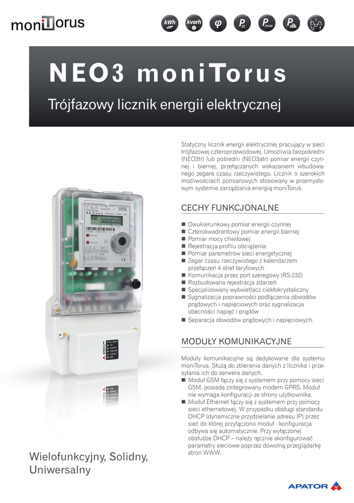 kWh kWh kvarh φ P (t) P max P I U f NEO 3 m on i Toru s Trójfazowy licznik energii elektrycznej Statyczny licznik energii elektrycznej pracujący w sieci trójfazowej czteroprzewodowej. Umożliwia bezpośredni (NEO3tr) lub pośredni (NEO3atr) pomiar energii czynnej i biernej, przełączanych wskazaniem wbudowanego zegara czasu rzeczywistego. Licznik o szerokich możliwościach pomiarowych stosowany w przemysłowym systemie zarządzania energią moniTorus. CECHY FUNKCJONALNE Dwukierunkowy pomiar energii czynnej Czterokwadrantowy pomiar energii biernej Pomiar mocy chwilowej Rejestracja profilu obciążenia Pomiar parametrów sieci energetycznej Zegar czasu rzeczywistego z kalendarzem przełączeń 4 stref taryfowych Komunikacja przez port szeregowy (RS-232) Rozbudowana rejestracja zdarzeń Specjalizowany wyświetlacz ciekłokrystaliczny Sygnalizacja poprawności podłączenia obwodów prądowych i napięciowych oraz sygnalizacja obecności napięć i prądów Separacja obwodów prądowych i napięciowych. MODUŁY KOMUNIKACYJNE Wielofunkcyjny, Solidny, Uniwersalny Moduły komunikacyjne są dedykowane dla systemu moniTorus. Służą do zbierania danych z licznika i przesyłania ich do serwera danych. Moduł GSM łączy się z systemem przy pomocy sieci GSM, posiada zintegrowany modem GPRS. Moduł nie wymaga konfiguracji ze strony użytkownika. Moduł Ethernet łączy się z systemem przy pomocy sieci ethernetowej. W przypadku obsługi standardu DHCP (dynamiczne przydzielanie adresu IP) przez sieć do której przyłączono moduł - konfiguracja odbywa się automatycznie. Przy wyłączonej obsłudze DHCP – należy ręcznie skonfigurować parametry sieciowe poprzez dowolną przeglądarkę stron WWW. NOWOCZESNE ZARZĄDZANIE ENERGIĄ DANE TECHNICZNE Model Sposób podłączenia NEO3tr NEO3atr bezpośredni pośredni, półpośredni Napięcie znamionowe Un [V] 3x230/400 3 x 58/100, 3 x 230/400 Prąd odniesienia Iref [A] 5 1 Prąd maksymalny Imax [A] 100 6 1 1 Klasa dokładności pomiaru en. czynnej Klasa dokładności pomiaru en. biernej [VA] Pobór mocy w torze prądowym (na fazę) Pobór mocy w torze napięciowym (na fazę) 2 <0,02 [W] / [VA] <1 / <10 [kV] 4 (AC 50 Hz), 6 (udary 1,2/50 μs) Wytrzymałość elektryczna izolacji [imp/kWh] Stałe impulsowania 2 <0,01 typowo: 500 imp/kWh typowo: 5000 imp/kWh Wewnętrzny, dokładność nie gorsza niż 0,5s/24h w temp. 23˚C, synchronizowany systemowo. Zegar Port szeregowy (RS-232). Prędkość transmisji konfigurowalna od 300 Bd do 9600 Bd. Obsługa protokołów PN-EN 62056-21 (IEC1107). Komunikacja Wyjście przekaźnikowe. Wyjścia LCD specjalizowany, 8 cyfr, dane opisane kodami OBIS (PN-EN 62056-61), dwie konfigurowalne listy komunikatów. Wyświetlacz od -25˚C do 55˚C Temperatura pracy od -30˚C do 70˚C IP 55, II kl. ochronności Obudowa PN-EN 50470-1 PN-EN 50470-3 PN-EN 62052-11 PN-EN 62053-23 PN-EN 62052-11 PN-EN 62053-21 PN-EN 62053-22 PN-EN 62053-23 327 230 Normy OZNACZENIE 20 NEO3 a t r rejestracja mocy i energii pomiar energii czynnej i biernej pomiar pośredni, półpośredni przeciążalność Imax/Iref 150 177 85 Niniejsza publikacja ma charakter informacyjny i nie stanowi oferty w rozumieniu prawa cywilnego. Prezentowane wykonania są przykładowe. Producent zastrzega sobie prawo do modyfikacji funkcjonalności licznika. PL.00059 | 2016 www.monitorus.pl www.apator.com
