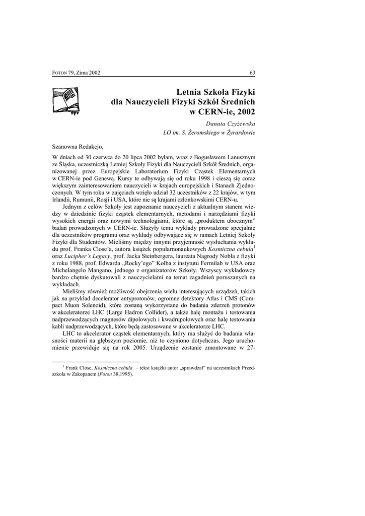 FOTON 79, Zima 2002 63 Letnia Szkoła Fizyki dla Nauczycieli Fizyki Szkół Średnich w CERN-ie, 2002 Danuta Czyżewska LO im. S. Żeromskiego w Żyrardowie Szanowna Redakcjo, W dniach od 30 czerwca do 20 lipca 2002 byłam, wraz z Bogusławem Lanusznym ze Śląska, uczestniczką Letniej Szkoły Fizyki dla Nauczycieli Szkół Średnich, organizowanej przez Europejskie Laboratorium Fizyki Cząstek Elementarnych w CERN-ie pod Genewą. Kursy te odbywają się od roku 1998 i cieszą się coraz większym zainteresowaniem nauczycieli w krajach europejskich i Stanach Zjednoczonych. W tym roku w zajęciach wzięło udział 32 uczestników z 22 krajów, w tym Irlandii, Rumunii, Rosji i USA, które nie są krajami członkowskimi CERN-u. Jednym z celów Szkoły jest zapoznanie nauczycieli z aktualnym stanem wiedzy w dziedzinie fizyki cząstek elementarnych, metodami i narzędziami fizyki wysokich energii oraz nowymi technologiami, które są „produktem ubocznym” badań prowadzonych w CERN-ie. Służyły temu wykłady prowadzone specjalnie dla uczestników programu oraz wykłady odbywające się w ramach Letniej Szkoły Fizyki dla Studentów. Mieliśmy między innymi przyjemność wysłuchania wykładu prof. Franka Close’a, autora książek popularnonaukowych Kosmiczna cebula1 oraz Lucipher’s Legacy, prof. Jacka Steinbergera, laureata Nagrody Nobla z fizyki z roku 1988, prof. Edwarda „Rocky’ego” Kolba z instytutu Fermilab w USA oraz Michelangelo Mangano, jednego z organizatorów Szkoły. Wszyscy wykładowcy bardzo chętnie dyskutowali z nauczycielami na temat zagadnień poruszanych na wykładach. Mieliśmy również możliwość obejrzenia wielu interesujących urządzeń, takich jak na przykład decelerator antyprotonów, ogromne detektory Atlas i CMS (Compact Muon Solenoid), które zostaną wykorzystane do badania zderzeń protonów w akceleratorze LHC (Large Hadron Collider), a także halę montażu i testowania nadprzewodzących magnesów dipolowych i kwadrupolowych oraz halę testowania kabli nadprzewodzących, które będą zastosowane w akceleratorze LHC. LHC to akcelerator cząstek elementarnych, który ma służyć do badania własności materii na głębszym poziomie, niż to czyniono dotychczas. Jego uruchomienie przewiduje się na rok 2005. Urządzenie zostanie zmontowane w 271 Frank Close, Kosmiczna cebula – tekst książki autor „sprawdzał” na uczestnikach Przedszkola w Zakopanem (Foton 38,1995). 64 FOTON 79, Zima 2002 kilometrowej długości tunelu, w którym przedtem znajdował się akcelerator LEP (Large Electron Positron Collider), co stwarza ogromne problemy techniczne. Ostatecznie LHC będzie zderzał wiązki protonów o energii zderzenia 14 TeV oraz wiązki jąder ołowiu o energii zderzenia 1150 TeV. Będzie to zatem akcelerator o najwyższej na świecie energii zderzenia i największej gęstości wiązki. Aby utrzymać wiązkę w tunelu, konieczne są bardzo silne pola magnetyczne, do wytworzenia których należy zastosować materiały nadprzewodzące. Z tego powodu urządzenie będzie pracowało w temperaturze około 300 stopni poniżej pokojowej, czyli niższej niż panuje w przestrzeni kosmicznej, a także będzie wymagało wytworzenia lepszej próżni, niż stwierdzono gdziekolwiek we Wszechświecie. Akcelerator LHC umożliwi odkrycie cząstek Higgsa, o ile istnieją, a także „supersymetrycznych” partnerów dla istniejących cząstek, co pozwoliłoby potwierdzić teorię unifikacji oddziaływań, zwaną supersymetrią (SUSY). Niestety, nie udało nam się zobaczyć podziemnego tunelu, gdyż obecnie nie jest dostępny dla zwiedzających z powodu prowadzonych w nim robót. Większość czasu przeznaczaliśmy na pracę w grupach, której celem było przygotowanie materiałów do wykorzystania przez nauczycieli fizyki podczas lekcji, przeredagowanie strony internetowej CERN-u dla ogólnego odbiorcy, opracowanie broszury informacyjnej na temat CERN-u dla nauczycieli fizyki, opracowanie stron internetowych dotyczących technologii wynikających z badań pro wadzonych w CERN-ie, a także zapoznanie się z programami komputerowymi i stronami internetowymi, które można wykorzystać w pracy w szkole, na przykład modelującymi zjawiska fizyczne lub umożliwiającymi przeprowadzanie doświadczeń na odległość. Materiały dla nauczycieli obejmują przykłady wykorzystania zdjęć z komór pęcherzykowych podczas lekcji fizyki, propozycje przedstawiania modelu standardowego uczniom oraz opracowania rzeczywistych doświadczeń prezentowanych przez uczestników Szkoły. Można je znaleźć w Internecie pod adresem http://teachers.web.cern.ch/teachers/. W pierwszym tygodniu zajęć liderzy grup przedstawiali uczestnikom tematykę i cel pracy grupy, aby wszyscy mogli wybrać coś dla siebie. Każdy z nas należał do jednej lub dwóch grup, a niekiedy przyłączał się do pracy w kolejnej grupie. Ja zajmowałam się modelem standardowym pod kierownictwem Petera Dunne’a z Wielkiej Brytanii oraz fotograficzną kroniką naszych zajęć pod okiem webmastera Rostislava Halasa z Czech. Czasami brałam udział w pracach grupy przygotowującej materiały z zastosowaniem zdjęć z komór pęcherzykowych, prowadzonej przez niezwykle charyzmatycznego Walijczyka, Grona Tudora Jonesa. W ramach „pracy domowej” podjęłam się, wspólnie z uczestnikiem ubiegłorocznej szkoły, Leszkiem Jabłońskim z Katowic, przetłumaczenia na język polski CD-ROM-u „Fizyka cząstek – klucz do narodzin czasu”, autorstwa Richarda Jacobssona, Jest to bardzo ciekawy materiał edukacyjny dla młodzieży, do wykorzystania w szkole. FOTON 79, Zima 2002 65 Niezmiernie istotna była również możliwość wymiany doświadczeń i pomysłów pomiędzy uczestnikami Szkoły. Wstępem do dyskusji na ten temat był wykład Cecilii Jarlskog, byłej członkini komitetu noblowskiego, dotyczący problemów i perspektyw nauczania fizyki w Europie. Nie do przeceniania jest także nawiązanie kont