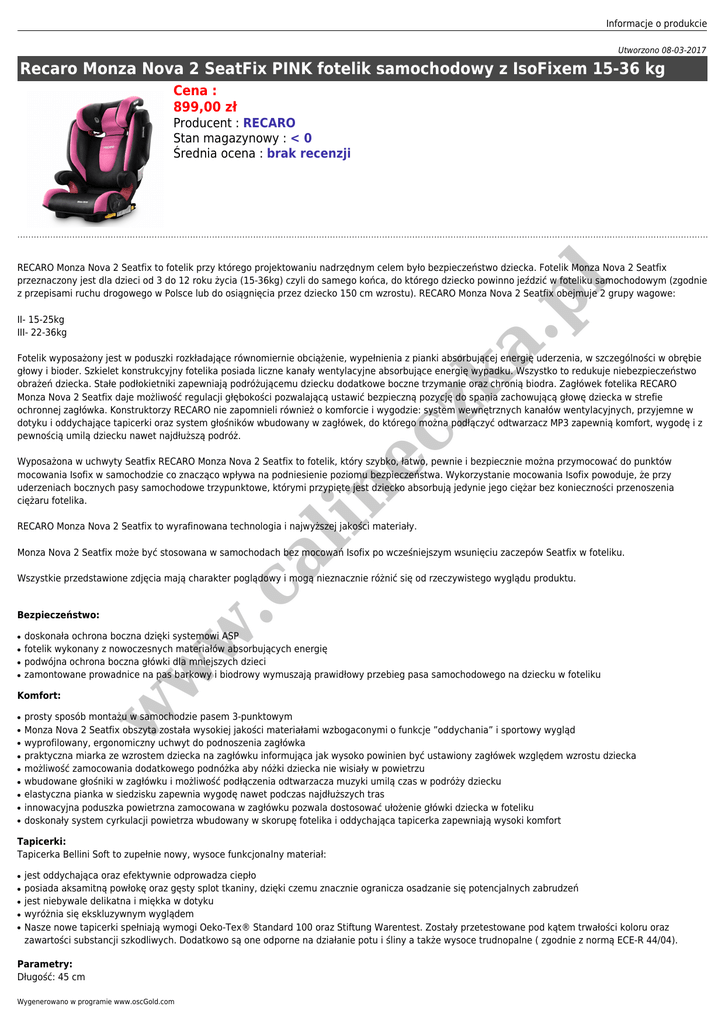 Informacje o produkcie Utworzono 08-03-2017 Recaro Monza Nova 2 SeatFix PINK fotelik samochodowy z IsoFixem 15-36 kg Cena : 899,00 zł Producent : RECARO Stan magazynowy : < 0 Średnia ocena : brak recenzji pl RECARO Monza Nova 2 Seatfix to fotelik przy którego projektowaniu nadrzędnym celem było bezpieczeństwo dziecka. Fotelik Monza Nova 2 Seatfix przeznaczony jest dla dzieci od 3 do 12 roku życia (15-36kg) czyli do samego końca, do którego dziecko powinno jeździć w foteliku samochodowym (zgodnie z przepisami ruchu drogowego w Polsce lub do osiągnięcia przez dziecko 150 cm wzrostu). RECARO Monza Nova 2 Seatfix obejmuje 2 grupy wagowe: zk a. II- 15-25kg III- 22-36kg ec Fotelik wyposażony jest w poduszki rozkładające równomiernie obciążenie, wypełnienia z pianki absorbującej energię uderzenia, w szczególności w obrębie głowy i bioder. Szkielet konstrukcyjny fotelika posiada liczne kanały wentylacyjne absorbujące energię wypadku. Wszystko to redukuje niebezpieczeństwo obrażeń dziecka. Stałe podłokietniki zapewniają podróżującemu dziecku dodatkowe boczne trzymanie oraz chronią biodra. Zagłówek fotelika RECARO Monza Nova 2 Seatfix daje możliwość regulacji głębokości pozwalającą ustawić bezpieczną pozycję do spania zachowującą głowę dziecka w strefie ochronnej zagłówka. Konstruktorzy RECARO nie zapomnieli również o komforcie i wygodzie: system wewnętrznych kanałów wentylacyjnych, przyjemne w dotyku i oddychające tapicerki oraz system głośników wbudowany w zagłówek, do którego można podłączyć odtwarzacz MP3 zapewnią komfort, wygodę i z pewnością umilą dziecku nawet najdłuższą podróż. in Wyposażona w uchwyty Seatfix RECARO Monza Nova 2 Seatfix to fotelik, który szybko, łatwo, pewnie i bezpiecznie można przymocować do punktów mocowania Isofix w samochodzie co znacząco wpływa na podniesienie poziomu bezpieczeństwa. Wykorzystanie mocowania Isofix powoduje, że przy uderzeniach bocznych pasy samochodowe trzypunktowe, którymi przypięte jest dziecko absorbują jedynie jego ciężar bez konieczności przenoszenia ciężaru fotelika. .c al RECARO Monza Nova 2 Seatfix to wyrafinowana technologia i najwyższej jakości materiały. Monza Nova 2 Seatfix może być stosowana w samochodach bez mocowań Isofix po wcześniejszym wsunięciu zaczepów Seatfix w foteliku. Wszystkie przedstawione zdjęcia mają charakter poglądowy i mogą nieznacznie różnić się od rzeczywistego wyglądu produktu. ● ● ● doskonała ochrona boczna dzięki systemowi ASP fotelik wykonany z nowoczesnych materiałów absorbujących energię podwójna ochrona boczna główki dla mniejszych dzieci zamontowane prowadnice na pas barkowy i biodrowy wymuszają prawidłowy przebieg pasa samochodowego na dziecku w foteliku w ● w Bezpieczeństwo: ● ● ● ● ● ● ● ● ● w Komfort: prosty sposób montażu w samochodzie pasem 3-punktowym Monza Nova 2 Seatfix obszyta została wysokiej jakości materiałami wzbogaconymi o funkcje ”oddychania” i sportowy wygląd wyprofilowany, ergonomiczny uchwyt do podnoszenia zagłówka praktyczna miarka ze wzrostem dziecka na zagłówku informująca jak wysoko powinien być ustawiony zagłówek względem wzrostu dziecka możliwość zamocowania dodatkowego podnóżka aby nóżki dziecka nie wisiały w powietrzu wbudowane głośniki w zagłówku i możliwość podłączenia odtwarzacza muzyki umilą czas w podróży dziecku elastyczna pianka w siedzisku zapewnia wygodę nawet podczas najdłuższych tras innowacyjna poduszka powietrzna zamocowana w zagłówku pozwala dostosować ułożenie główki dziecka w foteliku doskonały system cyrkulacji powietrza wbudowany w skorupę fotelika i oddychająca tapicerka zapewniają wysoki komfort Tapicerki: Tapicerka Bellini Soft to zupełnie nowy, wysoce funkcjonalny materiał: ● ● ● ● ● jest oddychająca oraz efektywnie odprowadza ciepło posiada aksamitną powłokę oraz gęsty splot tkaniny, dzięki czemu znacznie ogranicza osadzanie się potencjalnych zabrudzeń jest niebywale delikatna i miękka w dotyku wyróżnia się ekskluzywnym wyglądem Nasze nowe tapicerki spełniają wymogi Oeko-Tex® Standard 100 oraz Stiftung Warentest. Zostały przetestowane pod kątem trwałości koloru oraz zawartości substancji szkodliwych. Dodatkowo są one odporne na działanie potu i śliny a także wysoce trudnopalne ( zgodnie z normą ECE-R 44/04). Parametry: Długość: 45 cm Wygenerowano w programie www.oscGold.com w w w .c al in ec zk a. pl Szerokość: 54 cm Wysokość: 67-85 cm Waga: 6,8 kg
